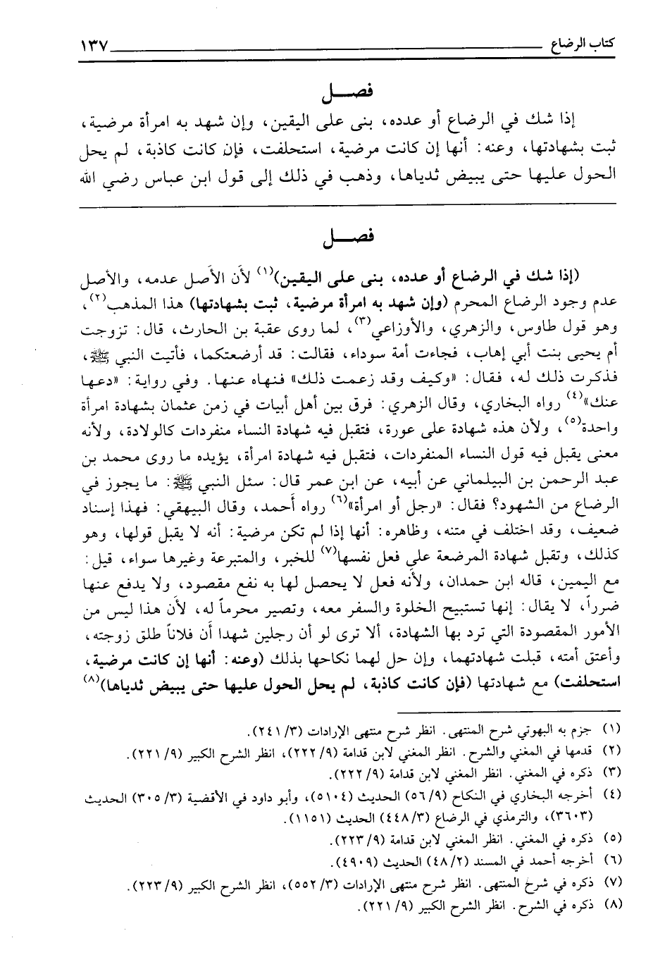 فَصْلٌ (إِذَا شَكَّ فِي الرَّضَاعِ، أَوْ عَدَدِهِ بَنَى عَلَى الْيَقِينِ) لِأَنَّ الْأَصْلَ عَدَمُهُ، وَالْأَصْلُ عَدَمُ وُجُودِ الرَّضَاعِ الْمُحَرِّمِ (وَإِنْ شَهِدَ بِهِ امْرَأَةٌ مَرْضِيَّةٌ ثَبَتَ بِشَهَادَتِهَا) هَذَا الْمَذْهَبُ، وَهُوَ قَوْلُ طَاوُسٍ، وَالزُّهْرِيِّ، وَالْأَوْزَاعِيِّ لِمَا «رَوَى عُقْبَةُ بْنُ الْحَارِثِ، قَالَ: تَزَوَّجْتُ أُمَّ يَحْيَى بِنْتَ أَبِي إِهَابٍ فَجَاءَتْ أَمَةٌ سَوْدَاءُ، فَقَالَتْ: قَدْ أَرْضَعْتُكُمَا فَأَتَيْتُ النَّبِيَّ - صَلَّى اللَّهُ عَلَيْهِ وَسَلَّمَ - فَذَكَرْتُ ذَلِكَ لَهُ، فَقَالَ: وَكَيْفَ، وَقَدْ زَعَمَتْ ذَلِكَ فَنَهَاهُ عَنْهَا، وَفِي رِوَايَةٍ: دَعْهَا عَنْكَ» رَوَاهُ الْبُخَارِيُّ، وَقَالَ الزُّهْرِيُّ: فُرِّقَ بَيْنَ أَهْلِ أَبِيَاتٍ فِي زَمَنِ عُثْمَانَ بِشَهَادَةِ امْرَأَةٍ وَاحِدَةٍ، وَلِأَنَّ هَذِهِ شَهَادَةٌ عَلَى عَوْرَةٍ فَتُقْبَلُ فِيهِ شَهَادَةُ النِّسَاءِ مُنْفَرِدَاتٍ كَالْوِلَادَةِ ; وَلِأَنَّهُ مَعْنًى يُقْبَلُ فِيهِ قَوْلُ النِّسَاءِ الْمُنْفَرِدَاتِ، فَتُقْبَلُ فِيهِ شَهَادَةُ امْرَأَةٍ، يُؤَيِّدُهُ مَا رَوَى مُحَمَّدُ بْنُ عَبْدِ الرَّحْمَنِ بْنِ الْبَيْلَمَانِيِّ عَنْ أَبِيهِ، عَنِ ابْنِ عُمَرَ، قَالَ: «سُئِلَ النَّبِيُّ - صَلَّى اللَّهُ عَلَيْهِ وَسَلَّمَ - مَا يَجُوزُ فِي الرَّضَاعِ مِنَ الشُّهُودِ، فَقَالَ: رَجُلٌ، أَوِ امْرَأَةٌ» رَوَاهُ أَحْمَدُ، وَقَالَ الْبَيْهَقِيُّ: فَهَذَا إِسْنَادٌ ضَعِيفٌ، وَقَدِ اخْتَلَفَ فِي مَتْنِهِ، وَظَاهِرُهُ أَنَّهَا إِذَا لَمْ تَكُنْ مَرْضِيَّةً أَنَّهُ لَا يُقْبَلُ قَوْلُهَا، وَهُوَ كَذَلِكَ، وَتُقْبَلُ شَهَادَةُ الْمُرْضِعَةِ عَلَى فِعْلِ نَفْسِهَا لِلْخَبَرِ، وَالْمُتَبَرِّعَةُ وَغَيْرُهَا سَوَاءٌ، قِيلَ: مَعَ الْيَمِينِ، قَالَهُ ابْنُ حَمْدَانَ، وَلِأَنَّهُ فِعْلٌ لَا يَحْصُلُ لَهَا بِهِ نَفْعٌ مَقْصُودٌ، وَلَا يَدْفَعُ عَنْهَا ضَرَرًا، لَا يُقَالُ: إِنَّهَا تَسْتَبِيحُ الْخُلْوَةَ وَالسَّفَرَ مَعَهُ، وَتَصِيرُ مَحْرَمًا لَهُ ; لِأَنَّ هَذَا لَيْسَ مِنَ الْأُمُورِ الْمَقْصُودَةِ الَّتِي تَرِدُ بِهَا الشَّهَادَةُ، أَلَا تَرَى لَوْ أَنَّ رَجُلَيْنِ شَهِدَا أَنَّ فُلَانًا طَلَّقَ زَوَّجْتَهُ وَأَعْتَقَ أَمَتَهُ قُبِلَتْ شَهَادَتُهُمَا، وَإِنْ حَلَّ لَهُمَا نِكَاحُهَا بِذَلِكَ (وَعَنْهُ: أَنَّهَا إِنْ كَانَتْ مَرَضِيَّةً اسْتُحْلِفَتْ) مَعَ شَهَادَتِهَا (فَإِنْ كَانَتْ كَاذِبَةً لَمْ يَحُلِ الْحَوْلُ عَلَيْهَا حَتَّى يَبْيَضَّ ثَدْيَاهَا)