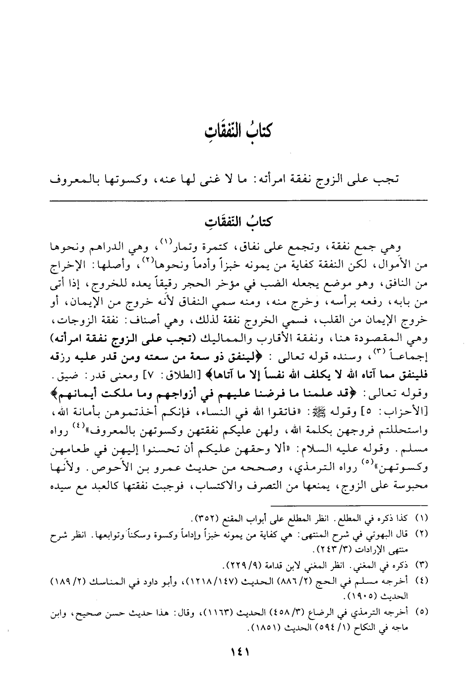 كِتَابُ النَّفَقَاتِ تَجِبُ عَلَى الزَّوْجِ نَفَقَةُ امْرَأَتِهِ، مَا لَا غِنَى لَهَا عَنْهُ وَكُسْوَتُهَا بِالْمَعْرُوفِ،