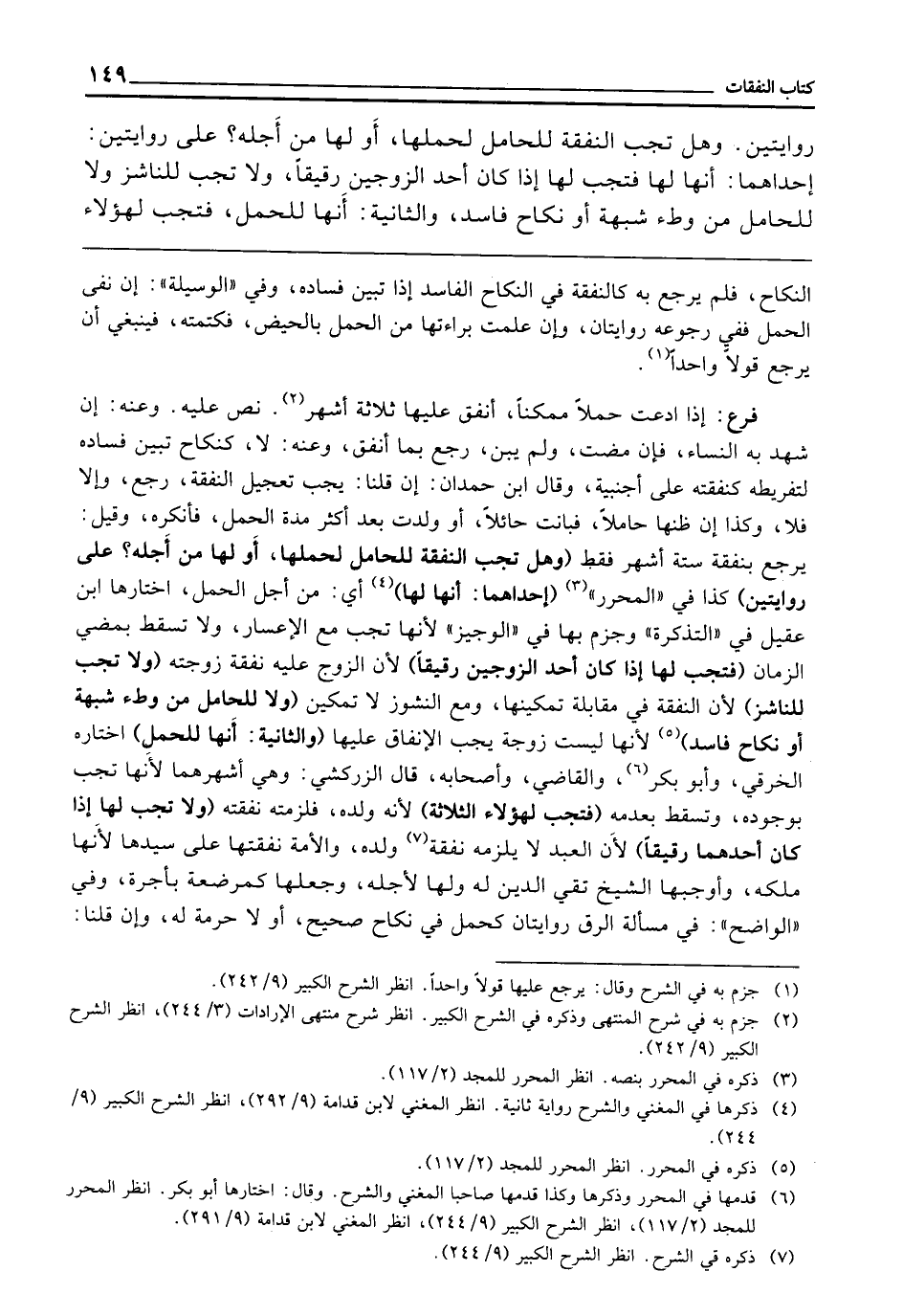 وَهَلْ تَجِبُ النَّفَقَةُ لِلْحَامِلِ لِحَمْلِهَا، أَوْ لَهَا مِنْ أَجْلِهِ؛ عَلَى رِوَايَتَيْنِ: إِحْدَاهُمَا: أَنَّهَا لَهَا فَتَجِبُ لَهَا إِذَا كَانَ أَحَدُ الزَّوْجَيْنِ رَقِيقًا وَلَا تَجِبُ لِلنَّاشِزِ وَلَا لِلْحَامِلِ مِنْ وَطْءِ شُبْهَةٍ، أَوْ نِكَاحٍ فَاسِدٍ. وَالثَّانِيَةُ: أَنَّهَا لِلْحَمْلِ فَتَجِبُ لِهَؤُلَاءِ