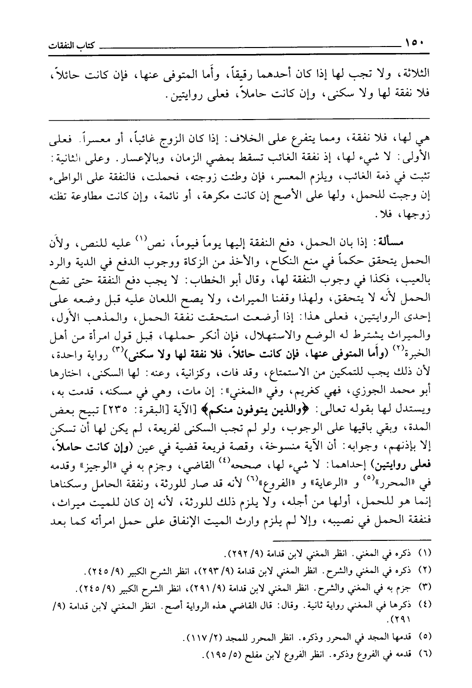 مَسْأَلَةٌ: إِذَا بَانَ الْحَمْلُ دَفَعَ النَّفَقَةَ إِلَيْهَا يَوْمًا فَيَوْمًا. نَصَّ عَلَيْهِ لِلنَّصِّ، وَلِأَنَّ الْحَمْلَ يَتَحَقَّقُ حُكْمًا فِي مَنْعِ النِّكَاحِ، وَالْأَخْذِ مِنَ الزَّكَاةِ وَوُجُوبِ الدَّفْعِ فِي الدِّيَةِ، وَالرَّدِّ بِالْعَيْبِ، فَكَذَا فِي وُجُوبِ النَّفَقَةِ لَهَا، وَقَالَ أَبُو الْخَطَّابِ: لَا يَجِبُ دَفْعُ النَّفَقَةِ حَتَّى تَضَعَ الْحَمْلَ ; لِأَنَّهُ لَا يَتَحَقَّقُ، وَلِهَذَا وَقَفْنَا الْمِيرَاثَ، وَلَا يَصِحُّ اللِّعَانُ عَلَيْهِ قَبْلَ وَضْعِهِ عَلَى إِحْدَى الرِّوَايَتَيْنِ، فَعَلَى هَذَا إِذَا أَرْضَعَتِ اسْتَحَقَّتْ نَفَقَةَ الْحَمْلِ، وَالْمَذْهَبُ الْأَوَّلُ، وَالْمِيرَاثُ يُشْتَرَطُ لَهُ الْوَضْعُ وَالِاسْتِهْلَالُ، فَإِنْ أَنْكَرَ حَمْلَهَا قَبْلَ قَوْلِ امْرَأَةٍ مِنْ أَهْلِ الْخِبْرَةِ