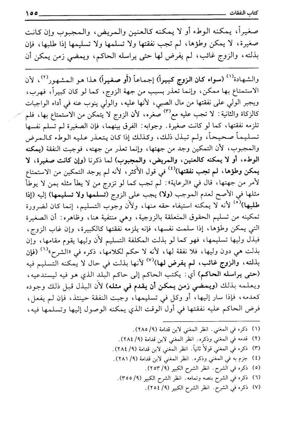 ـــــــــــــــــــــــــــــQوَالشَّهَادَةِ (سَوَاءٌ كَانَ الزَّوْجُ كَبِيرًا) إِجْمَاعًا (أَوْ صَغِيرًا) هَذَا هُوَ الْمَشْهُورُ ; لِأَنَّ الِاسْتِمْتَاعَ بِهَا مُمْكِنٌ، وَإِنَّمَا تَعَذَّرَ بِسَبَبٍ مِنْ جِهَةِ الزَّوْجِ كَمَا لَوْ كَانَ كَبِيرًا فَهَرَبَ، وَيُجْبَرُ الْوَلِيُّ عَلَى نَفَقَتِهَا مِنْ مَالِ الصَّبِيِّ ; لِأَنَّهَا عَلَيْهِ، وَالْوَلِيُّ يَنُوبُ عَنْهُ فِي أَدَاءِ الْوَاجِبَاتِ كَالزَّكَاةِ، وَالثَّانِيَةُ: لَا تَجِبُ عَلَيْهِ مَعَ صِغَرِهِ ; لِأَنَّ الزَّوْجَ لَا يَتَمَكَّنُ مِنْ الِاسْتِمْتَاعِ بِهَا، فَلَمْ تَلْزَمْهُ نَفَقَتُهَا كَمَا لَوْ كَانَتْ صَغِيرَةً، وَجَوَابُهُ: الْفَرْقُ بَيْنَهُمَا، فَإِنَّ الصَّغِيرَةَ لَمْ تُسَلِّمْ نَفْسَهَا تَسْلِيمًا صَحِيحًا، وَلَمْ تَبْذُلْ ذَلِكَ، وَكَذَلِكَ إِذَا كَانَ يَتَعَذَّرُ عَلَيْهِ الْوَطْءُ كَالْمَرِضِ، وَالْمَجْبُوبِ ; لِأَنَّ التَّمْكِينَ وُجِدَ مِنْ جِهَتِهَا، وَإِنَّمَا تَعَذَّرَ مِنْ جِهَتِهِ فَوَجَبَتِ النَّفَقَةُ (يُمْكِنُهُ الْوَطْءُ أَوْ لَا يُمْكِنُهُ كَالْعِنِّينِ، وَالْمَرِيضِ وَالْمَجْبُوبِ) لِمَا ذَكَرْنَا (وَإِنْ كَانَتْ صَغِيرَةً، لَا يُمْكِنُ وَطْؤُهَا لَمْ تَجِبْ نَفَقَتُهَا) فِي قَوْلِ الْأَكْثَرِ ; لِأَنَّهُ لَمْ يُوجَدِ التَّمْكِينُ مِنْ الِاسْتِمْتَاعِ لِأَمْرٍ مِنْ جِهَتِهَا، قَالَ فِي " الرِّعَايَةِ ": لَمْ تَجِبْ كَمَا لَوْ تَزَوَّجَ مَنْ لَا يَطَأُ مِثْلُهُ بِمَنْ لَا يُوطَأُ مِثْلُهَا فِي الْأَصَحِّ لِعَدَمِ الْمُوجِبِ (وَلَا) يَجِبُ عَلَى الزَّوْجِ (تَسَلُّمُهَا، وَلَا تَسْلِيمُهَا) إِلَيْهِ (إِذَا طَلَبَهَا) لِأَنَّهُ لَا يُمْكِنُهُ اسْتِيفَاءُ حَقِّهِ مِنْهَا، وَلِأَنَّ وُجُوبَ التَّسْلِيمِ إِنَّمَا كَانَ لِضَرُورَةِ تَمْكِينِهِ مِنْ تَسْلِيمِ الْحُقُوقِ الْمُتَعَلِّقَةِ بِالزَّوْجِيَّةِ، وَهِيَ مُنْتَفِيَةٌ هُنَا، وَظَاهِرُهُ أَنَّ الصَّغِيرَةَ الَّتِي يُمْكِنُ وَطْؤُهَا إِذَا سَلَّمَتْ نَفْسَهَا، فَإِنَّهُ يَلْزَمُهُ نَفَقَتُهَا كَالْكَبِيرَةِ، وَإِنْ غَابَ الزَّوْجُ فَبَذَلَ وَلِيُّهَا تَسْلِيمَهَا، فَهُوَ كَمَا لَوْ بَذَلَتِ الْمُكَلَّفَةُ التَّسْلِيمَ ; لِأَنَّ وَلَيَّهَا يَقُومُ مَقَامَهَا، وَإِنْ بَذَلَتْ هِيَ دَون وَلِيِّهَا، فَلَا نَفَقَةَ لَهَا ; لِأَنَّهُ لَا حُكْمَ لِكَلَامِهَا، ذَكَرَهُ فِي " الشَّرْحِ " (فَإِنْ بَذَلَتْهُ، وَالزَّوْجُ غَائِبٌ لَمْ يُفْرَضْ لَهَا) لِأَنَّهَا بَذَلَتْ فِي حَالٍ لَا يُمْكِنُهُ التَّسْلِيمُ فِيهِ (حَتَّى يُرَاسِلَهُ الْحَاكِمُ) أَيْ: يَكْتُبَ الْحَاكِمُ إِلَى حَاكِمِ الْبَلَدِ الَّذِي هُوَ فِيهِ لِيَسْتَدْعِيَهُ وَيُعْلِمَهُ بِذَلِكَ (وَيَمْضِيَ زَمَنٌ يُمْكِنُ أَنْ يَقْدَمَ فِي مِثْلِهِ) لِأَنَّ الْبَذْلَ قَبْلَ ذَلِكَ وُجُودُهُ كَعَدَمِهِ، فَإِذَا سَارَ إِلَيْهَا، أَوْ وُكِلَ فِي تَسْلِيمِهَا وَجَبَتِ النَّفَقَةُ حِينَئِذٍ، فَإِنْ لَمْ يَفْعَلْ فَرَضَ الْحَاكِمُ عَلَيْهِ نَفَقَتَهَا فِي أَوَّلِ الْوَقْتِ الَّذِي يُمْكِنُهُ الْوُصُولُ إِلَيْهَا وَتَسَلُّمُهَا فِيهِ،