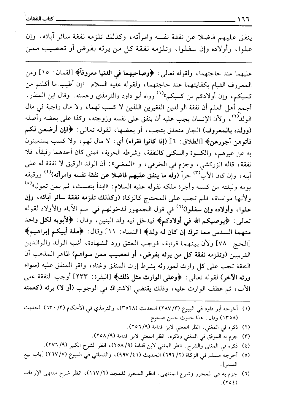 ـــــــــــــــــــــــــــــQعَلَيْهِمَا عِنْدَ حَاجَتِهِمَا وَلِقَوْلِهِ تَعَالَى: {وَصَاحِبْهُمَا فِي الدُّنْيَا مَعْرُوفًا} [لقمان: 15] وَمِنَ الْمَعْرُوفِ الْقِيَامُ بِكِفَايَتِهِمَا عِنْدَ حَاجَتِهَا وَلِقَوْلِهِ - عَلَيْهِ السَّلَامُ - «إِنَّ أَطْيَبَ مَا أَكَلْتُمْ مِنْ كَسْبِكُمْ، وَإِنَّ أَوْلَادَكُمْ مِنْ كَسْبِكُمْ» رَوَاهُ أَبُو دَاوُدَ، وَالتِّرْمِذِيُّ وَحَسَّنَهُ، وَقَالَ ابْنُ الْمُنْذِرِ: أَجْمَعَ أَهْلُ الْعِلْمِ أَنَّ نَفَقَةَ الْوَالِدَيْنِ الْفَقِيرَيْنِ اللَّذَيْنِ لَا كَسْبَ لَهُمَا، وَلَا مَالَ - وَاجِبَةٌ فِي مَالِ الْوَلَدِ، وَلِأَنَّ الْإِنْسَانَ يَجِبُ عَلَيْهِ أَنْ يُنْفِقَ عَلَى نَفْسِهِ وَزَوْجَتِهِ، وَكَذَا عَلَى بَعْضِهِ وَأَصْلِهِ (وَوَلَدِهِ بِالْمَعْرُوفِ) . الْجَارُّ مُتَعَلِّقٌ بِـ " تَجِبُ "، أَوْ بَعْضِهَا لِقَوْلِهِ تَعَالَى: {فَإِنْ أَرْضَعْنَ لَكُمْ فَآتُوهُنَّ أُجُورَهُنَّ} [الطلاق: 6] (إِذَا كَانُوا فُقَرَاءَ) أَيْ: لَا مَالَ لَهُمْ، وَلا كَسْبَ يَسْتَعِينُونَ بِهِ عَنْ غَيْرِهِمْ، وَالْكِسْوَةُ وَالسُّكْنَى كَالنَّفَقَةِ. وَشَرْطُهُ الْحُرِّيَّةُ فَمَتَى كَانَ أَحَدُهُمَا رَقِيقًا، فَلَا نَفَقَةَ، قَالَهُ الزَّرْكَشِيُّ، وَجَزَمَ فِي الْخِرَقِيِّ، وَ " الْمُغْنِي " أَنَّ الْوَلَدَ الرَّقِيقَ، لَا نَفَقَةَ لَهُ عَلَى أَبِيهِ، وَإِنْ كَانَ الْأَبُ حُرًّا (وَلَهُ مَا يُنْفِقُ عَلَيْهِمْ فَاضِلًا، عَنْ نَفَقَةِ نَفْسِهِ وَامْرَأَتِهِ) وَرَقِيقِهِ يَوْمَهُ وَلَيْلَتَهُ مِنْ كَسْبِهِ وَأُجْرَةِ مِلْكِهِ لِقَوْلِهِ - عَلَيْهِ السَّلَامُ - «ابْدَأْ بِنَفْسِكَ، ثُمَّ بِمَنْ تَعُولُ» وَلِأَنَّهَا مُوَاسَاةٌ، فَلَمْ تَجِبْ عَلَى الْمُحْتَاجِ كَالزَّكَاةِ (وَكَذَلِكَ تَلْزَمُهُ نَفَقَةُ سَائِرِ آبَائِهِ، وَإِنْ عَلَوْا وَأَوْلَادِهِ، وَإِنْ سَفَلُوا) فِي قَوْلِ الْجُمْهُورِ لِدُخُولِهِمْ فِي اسْمِ الْآبَاءِ، وَالْأَوْلَادِ لِقَوْلِهِ تَعَالَى: {يُوصِيكُمُ اللَّهُ فِي أَوْلادِكُمْ} [النساء: 11] فَيَدْخُلُ فِيهِ وَلَدُ الْبَنِينَ، وَقَالَ: {وَلأَبَوَيْهِ لِكُلِّ وَاحِدٍ مِنْهُمَا السُّدُسُ مِمَّا تَرَكَ إِنْ كَانَ لَهُ وَلَدٌ} [النساء: 11] وَقَالَ: {مِلَّةَ أَبِيكُمْ إِبْرَاهِيمَ} [الحج: 78] ، وَلِأَنَّ بَيْنَهُمَا قَرَابَةً فَوَجَبَ الْعِتْقُ وَرَدُّ الشَّهَادَةِ، أَشْبَهَ الْوَلَدَ، وَالْوَالِدَيْنِ الْقَرِيبَيْنِ (وَتَلْزَمُهُ نَفَقَةُ كُلِّ مَنْ يَرِثُهُ بِفَرْضٍ، أَوْ تَعْصِيبٍ مِمَّنْ سِوَاهُمْ) ظَاهِرُ الْمَذْهَبِ أَنَّ النَّفَقَةَ تَجِبُ عَلَى كُلِّ وَارِثٍ لِمُوَروثِهِ بِشَرْطِ إِرْثِ الْمُنْفِقِ وَغِنَاهُ وَفَقْرِ الْمُنْفَقِ عَلَيْهِ (سَوَاءٌ وِرْثَهُ الْآخَرُ) لِقَوْلِهِ تَعَالَى: {وَعَلَى الْوَارِثِ مِثْلُ ذَلِكَ} [البقرة: 233] أَوْجَبَ النَّفَقَةَ عَلَى الْأَبِّ، ثُمَّ عَطَفَ الْوَارِثُ عَلَيْهِ، وَذَلِكَ يَقْتَضِي الِاشْتِرَاكَ فِي الْوُجُوبِ (أَوْ لَا) يَرِثُهُ (كَعَمَّتِهِ