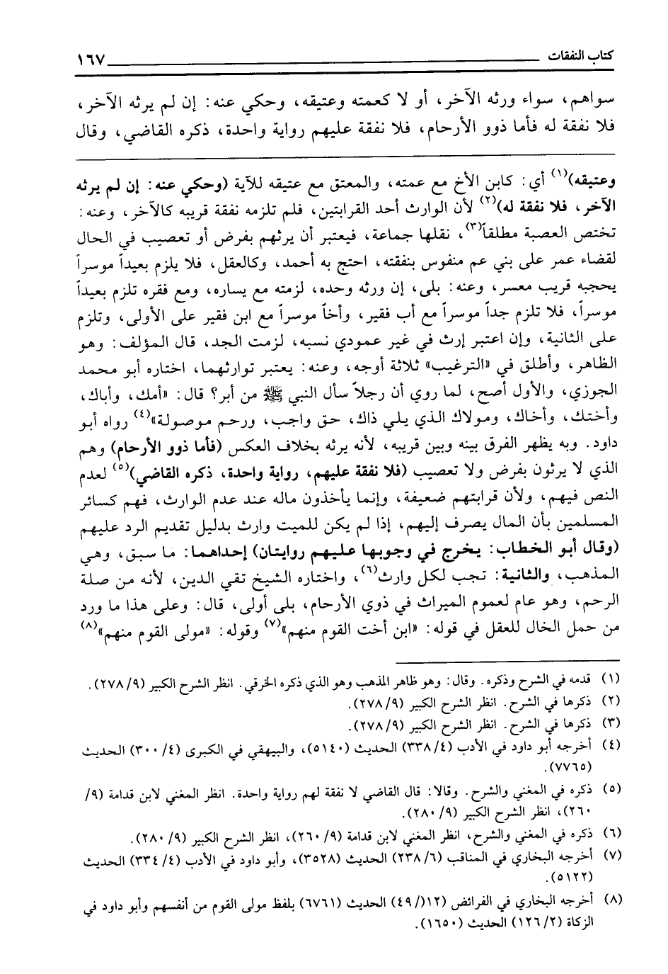 ـــــــــــــــــــــــــــــQوَعَتِيقِهِ) أَيْ: كَابْنِ الْأَخِ مَعَ عَمَّتِهِ، وَالْمُعْتِقِ مَعَ عَتِيقِهِ لِلْآيَةِ (وَحُكِيَ عَنْهُ إِنْ لَمْ يَرِثْهُ الْآخَرُ، فَلَا نَفَقَةَ لَهُ) لِأَنَّ الْوَارِثَ أَحَدُ الْقَرَابَتَيْنِ، فَلَمْ تَلْزَمْهُ نَفَقَةُ قَرِيبِهِ كَالْآخَرِ، وَعَنْهُ: تَخْتَصُّ الْعَصَبَةُ مُطْلَقًا، نَقَلَهَا جَمَاعَةٌ فَيُعْتَبَرُ أَنْ يَرِثَهُمْ بِفَرْضٍ، أَوْ تَعْصِيبٍ فِي الْحَالِ لِقَضَاءِ عُمَرَ عَلَى بَنِي عَمِّ مَنْفُوسٍ بِنَفَقَتِهِ احْتَجَّ بِهِ أَحْمَدُ، وَكَالْعَقْلِ، فَلَا يَلْزَمُ بَعِيدًا مُوسِرًا يَحْجُبُهُ قَرِيبٌ مُعْسِرٌ، وَعَنْهُ: بَلَى إِنْ وَرِثَهُ وَحْدَهُ لَزِمَتْهُ مَعَ يَسَارِهِ وَمَعَ فَقْرِهِ تَلْزَمُ بَعِيدًا مُوسِرًا، فَلَا تَلْزَمُ جَدًّا مُوسِرًا مَعَ أَبٍ فَقِيرٍ، وَأَخَا مُوسِرًا مَعَ ابْنٍ فَقِيرٍ عَلَى الْأُولَى، وَتَلْزَمُ عَلَى الثَّانِيَةِ، وَإِنِ اعْتُبِرَ إِرْثٌ فِي غَيْرِ عَمُودَيِ نَسَبِهِ لَزِمَتِ الْجَدَّ، قَالَ الْمُؤَلِّفُ: وَهُوَ الظَّاهِرُ وَأَطْلَقَ فِي " التَّرْغِيبِ " ثَلَاثَةَ أَوْجُهٍ، وَعَنْهُ: يُعْتَبَرُ تَوَارُثُهُمَا اخْتَارَهُ أَبُو مُحَمَّدٍ الْجَوْزِيُّ، وَالْأَوَّلُ أَصَحُّ لِمَا رُوِيَ «أَنَّ رَجُلًا سَأَلَ النَّبِيَّ - صَلَّى اللَّهُ عَلَيْهِ وَسَلَّمَ -: مَنْ أَبِرُّ؛ قَالَ: أُمَّكَ وَأَبَاكَ وَأُخْتَكَ وَأَخَاكَ وَمَوْلَاكَ الَّذِي يَلِي ذَاكَ، حَقٌّ وَاجِبٌ وَرَحِمٌ مَوْصُولَةٌ» رَوَاهُ أَبُو دَاوُدَ، وَبِهِ يَظْهَرُ الْفَرْقُ بَيْنَهُ وَبَيْنَ قَرِيبِهِ ; لِأَنَّهُ يَرِثُهُ، بِخِلَافِ الْعَكْسِ.