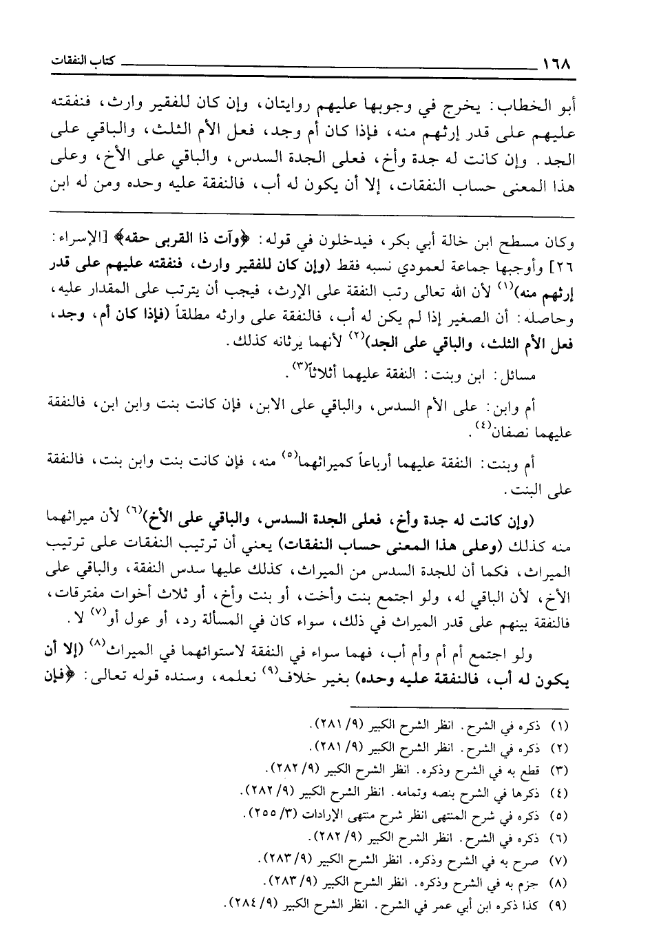 ـــــــــــــــــــــــــــــQوَكَانَ مِسْطَحٌ ابْنَ خَالَةِ أَبِي بَكْرٍ، فَيَدْخُلُونَ فِي قَوْلِهِ {وَآتِ ذَا الْقُرْبَى حَقَّهُ} [الإسراء: 26] وَأَوْجَبَهَا جَمَاعَةٌ لِعَمُودَيِ نَسَبِهِ فَقَطْ (وَإِنْ كَانَ لِلْفَقِيرِ وَارِثٌ فَنَفَقَتُهُ عَلَيْهِمْ عَلَى قَدْرِ إِرْثِهِمْ مِنْهُ) لِأَنَّ اللَّهَ تَعَالَى رَتَّبَ النَّفَقَةَ عَلَى الْإِرْثِ فَيَجِبُ أَنْ يَتَرَتَّبَ عَلَى الْمِقْدَارِ عَلَيْهِ، وَحَاصِلُهُ أَنَّ الصَّغِيرَ إِذَا لَمْ يَكُنْ لَهُ أَبٌ، فَالنَّفَقَةُ عَلَى وَارِثِهِ مُطْلَقًا (فَإِذَا كَانَ أُمٌّ وَجَدٌّ، فَعَلَى الْأُمِّ الثُّلُثُ، وَالْبَاقِي عَلَى الْجَدِّ) لِأَنَّهُمَا يَرِثَانِهِ كَذَلِكَ.