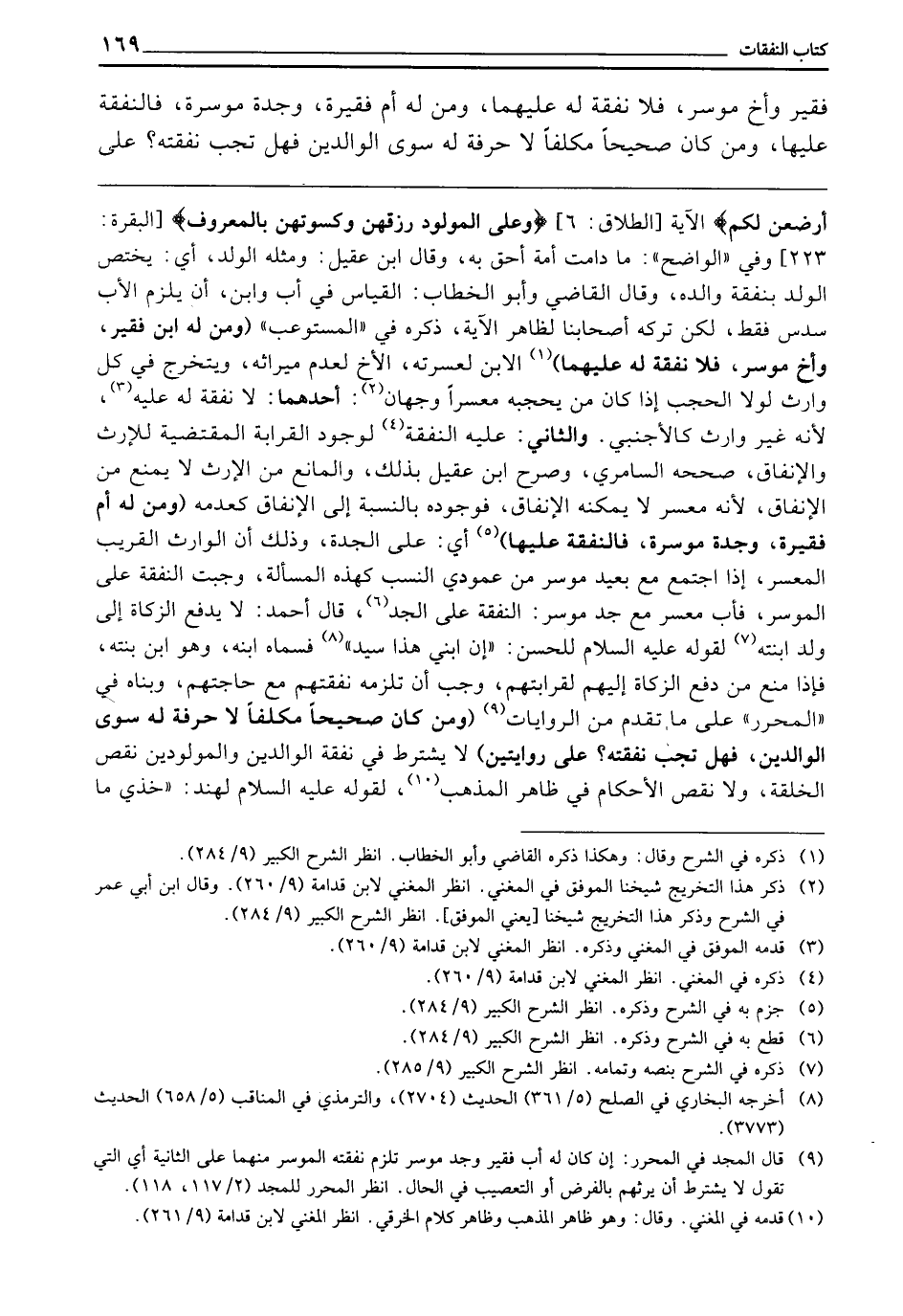 ـــــــــــــــــــــــــــــQ {فَإِنْ أَرْضَعْنَ لَكُمْ} [الطلاق: 6] الْآيَةَ {وَعَلَى الْمَوْلُودِ لَهُ رِزْقُهُنَّ وَكِسْوَتُهُنَّ بِالْمَعْرُوفِ} [البقرة: 233] ، وَفِي " الْوَاضِحِ ": مَا دَامَتْ أُمُّهُ أَحَقَّ بِهِ، وَقَالَ ابْنُ عَقِيلٍ: وَمِثْلُهُ الْوَلَدُ، أَيْ: يَخْتَصُّ الْوَلَدُ بِنَفَقَةِ وَالِدِهِ، وَقَالَ الْقَاضِي، وَأَبُو الْخَطَّابِ: الْقِيَاسُ فِي أَبٍ، وَابْنٍ أَنْ يَلْزَمَ الْأَبَ سُدُسٌ فَقَطْ، لَكِنْ تَرَكَهُ أَصْحَابُنَا لِظَاهِرِ الْآيَةِ، ذَكَرَهُ فِي " الْمُسْتَوْعِبِ "