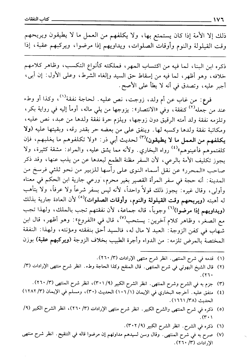 ذَلِكَ. إِلَّا الْأَمَةَ إِذَا كَانَ يَسْتَمْتِعُ بِهَا، وَلَا يُكَلِّفُهُمْ مِنَ الْعَمَلِ مَا لَا يُطِيقُونَ. وَيُرِيحُهُمْ وَقْتَ الْقَيْلُولَةِ وَالنَّوْمِ وَأَوْقَاتِ الصَّلَوَاتِ وَيُدَاوِيهِمْ إِذَا مَرِضُوا وَيُرْكِبُهُمْ عُقْبَةً إِذَا