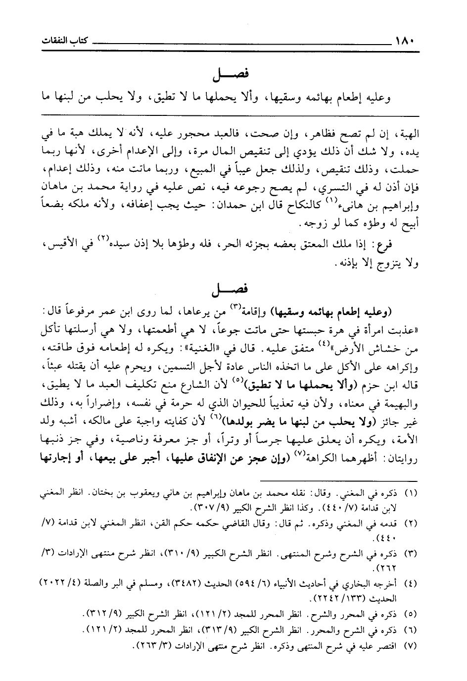فَصْلٌ (وَعَلَيْهِ إِطْعَامُ بَهَائِمِهِ وَسَقْيُهَا) وَإِقَامَةُ مَنْ يَرْعَاهَا لِمَا رَوَى ابْنُ عُمَرَ مَرْفُوعًا قَالَ: «عُذِّبَتِ امْرَأَةٌ فِي هِرَّةٍ حَبَسَتْهَا حَتَّى مَاتَتْ جُوعًا، لَا هِيَ أَطْعَمَتْهَا، وَلَا هِيَ أَرْسَلَتْهَا تَأْكُلُ مِنْ خَشَاشِ الْأَرْضِ» مُتَّفَقٌ عَلَيْهِ، قَالَ فِي " الْغُنْيَةِ ": وَيُكْرَهُ لَهُ إِطْعَامُهُ فَوْقَ طَاقَتِهِ وَإِكْرَاهُهُ عَلَى الْأَكْلِ عَلَى مَا اتَّخَذَهُ النَّاسُ عَادَةً لِأَجْلِ التَّسْمِينِ، وَيَحْرُمُ عَلَيْهِ أَنْ يَقْتُلَهُ عَبَثًا، قَالَهُ ابْنُ حَزْمٍ (وَأَلَّا يُحَمِّلَهَا مَا لَا تُطِيقُ) لِأَنَّ الشَّارِعَ مَنَعَ تَكْلِيفَ الْعَبْدِ مَا لَا يُطِيقُ، وَالْبَهِيمَةُ فِي مَعْنَاهُ، وَلِأَنَّ فِيهِ تَعْذِيبًا لِلْحَيَوَانِ الَّذِي لَهُ حُرْمَةٌ فِي نَفْسِهِ وَإِضْرَارًا بِهِ، وَذَلِكَ غَيْرُ جَائِزٍ (وَلَا يَحْلِبُ مِنْ لَبَنِهَا مَا يَضُرُّ بِوَلَدِهَا) لِأَنَّ كِفَايَتَهُ وَاجِبَةٌ عَلَى مَالِكِهِ، أَشْبَهَ وَلَدَ الْأَمَةِ، وَيُكْرَهُ أَنْ يُعَلِّقَ عَلَيْهَا جَرَسًا، أَوْ وَتَرًا، أَوْ جَزَّ مَعْرِفَةٍ وَنَاصِيَةٍ، وَفِي جَزِّ ذَنَبِهَا رِوَايَتَانِ أَظْهَرُهُمَا الْكَرَاهَةُ (وَإِنْ عَجَزَ عَنِ الْإِنْفَاقِ عَلَيْهَا أُجْبِرَ عَلَى بَيْعِهَا، أَوْ إِجَارَتِهَا،