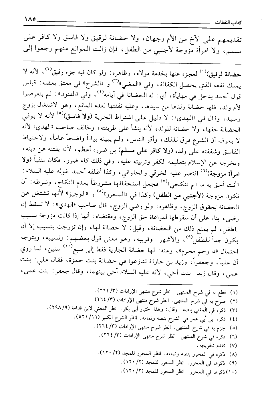 ـــــــــــــــــــــــــــــQحَضَانَةَ لِرَقِيقٍ) لِعَجْزِهِ عَنْهَا بِخِدْمَةِ مَوْلَاهُ، وَظَاهِرُهُ وَلَوْ كَانَ فِيهِ جُزْءٌ رَقِيقٌ ; لِأَنَّهُ لَا يَمْلِكُ نَفْعَهُ الَّذِي يَحْصُلُ الْكَفَالَةَ، وَفِي " الْمُغْنِي "، وَ " الشَّرْحِ " فِي مُعْتَقٍ بَعْضُهُ: قِيَاسُ قَوْلِ أَحْمَدَ يَدْخُلُ فِي مُهَايَأَةٍ، أَيْ: لَهُ الْحَضَانَةُ فِي أَيَّامِهِ، وَفِي " الْفُنُونِ " لَمْ يَتَعَرَّضُوا لِأُمِّ وَلَدٍ فَلَهَا حَضَانَةُ وَلَدِهَا مِنْ سَيِّدِهَا، وَعَلَيْهِ نَفَقَتُهَا لِعَدَمِ الْمَانِعِ، وَهُوَ الِاشْتِغَالُ بِزَوْجٍ وَسَيِّدٍ، وَقَالَ فِي " الْهَدْيِ ": لَا دَلِيلَ عَلَى اشْتِرَاطِ الْحُرِّيَّةِ (وَلَا فَاسِقٍ) لِأَنَّهُ لَا يُوَفِّي الْحَضَانَةَ حَقَّهَا، وَلَا حَضَانَةَ لِلْوَلَدِ ; لِأَنَّهُ يَنْشَأُ عَلَى طَرِيقَتِهِ، وَخَالَفَ صَاحِبُ " الْهَدْيِ " ; لِأَنَّهُ لَا يَعْرِفُ أَنَّ الشَّرْعَ فَرَّقَ لِذَلِكَ وَأَقَرَّ النَّاسُ، وَلَمْ يُبَيِّنْهُ بَيَانًا وَاضِحًا عَامًّا، وَلِاحْتِيَاطِ الْفَاسِقِ وَشَفَقَتِهِ عَلَى وَلَدِهِ (وَلَا كَافِرٍ عَلَى مُسْلِمٍ) بَلْ ضَرَرُهُ أَعْظَمُ ; لِأَنَّهُ يَفْتِنُهُ عَنْ دِينِهِ وَيُخْرِجُهُ عَنِ الْإِسْلَامِ بِتَعْلِيمِهِ الْكُفْرَ وَتَرْبِيَتِهِ عَلَيْهِ، وَفِي ذَلِكَ كُلِّهِ ضَرَرٌ، فَكَانَ مَنْفِيًّا (وَلَا امْرَأَةٍ مُزَوَّجَةٍ) اقْتَصَرَ عَلَيْهِ الْخِرَقِيُّ، وَالْحُلْوَانِيُّ، وَكَذَا أَطْلَقُهُ أَحْمَدُ لِقَوْلِهِ - عَلَيْهِ السَّلَامُ - «أَنْتِ أَحَقُّ بِهِ مَا لَمْ تَنْكِحِي» فَجَعَلَ اسْتِحْقَاقَهَا مَشْرُوطًا بِعَدَمِ النِّكَاحِ، وَشَرْطُهُ أَنْ تَكُونَ مُزَوَّجَةً (لِأَجْنَبِيٍّ مِنَ الطِّفْلِ) وَكَذَا فِي " الْمُحَرَّرِ "، وَ " الْوَجِيزِ " ; لِأَنَّهَا تَشْتَغِلُ عَنِ الْحَضَانَةِ بِحُقُوقِ الزَّوْجِ، وَظَاهِرُهُ وَلَوْ رَضِيَ الزَّوْجُ، قَالَ صَاحِبُ " الْهَدْيِ ": لَا تَسْقُطُ إِنْ رَضِيَ بِنَاءً عَلَى أَنَّ سُقُوطَهَا لِمُرَاعَاةِ حَقِّ الزَّوْجِ، وَمُقْتَضَاهُ: أَنَّهَا إِذَا كَانَتْ مُزَوَّجَةً بِنَسِيبٍ لِلطِّفْلِ لَمْ يَمْنَعْ ذَلِكَ مِنَ الْحَضَانَةِ، وَقِيلَ: لَا حَضَانَةَ لَهَا، وَإِنْ تَزَوَّجَتْ بِنَسِيبٍ إِلَّا أَنْ يَكُونَ جَدًّا لِلطِّفْلِ، وَالْأَشْهَرُ: وَقَرِيبُهُ، وَهُوَ مَعْنَى قَوْلِ بَعْضِهِمْ: وَنَسِيبِهِ، وَيَتَوَجَّهُ احْتِمَالُ " ذَا رَحِمٍ مَحْرَمٍ "، وَعَنْهُ: لَهَا حَضَانَةُ الْجَارِيَةِ فَقَطْ إِلَى سَبْعِ سِنِينَ لِمَا رُوِيَ أَنَّ عَلِيًّا، وَجَعْفَرًا، وَزَيْدَ بْنَ حَارِثَةَ تَنَازَعُوا فِي حَضَانَةِ بِنْتِ حَمْزَةَ، فَقَالَ عَلِيٌّ: بِنْتُ عَمِّي، وَقَالَ زَيْدٌ: بِنْتُ أَخِي ; لِأَنَّهُ - عَلَيْهِ السَّلَامُ - آخَى بَيْنَهُمَا، وَقَالَ جَعْفَرٌ: بِنْتُ عَمِّي