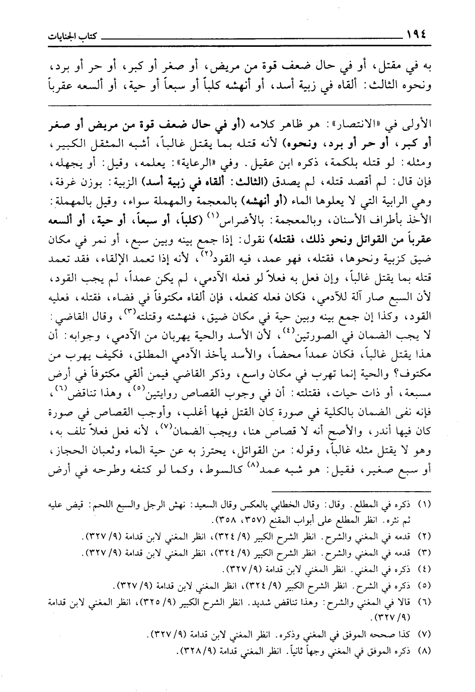 (الثَّالِثُ أَلْقَاهُ فِي زُبْيَةِ أَسَدٍ) الزُّبْيَةُ: بِوَزْنِ غُرْفَةٍ، وَهِيَ الرَّابِيَةُ الَّتِي لَا يَعْلُوهَا الْمَاءُ (أَوْ أَنْهَشَهُ) بِالْمُعْجَمَةِ، وَالْمُهْمَلَةِ سَوَاءٌ، وَقِيلَ: بِالْمُهْمَلَةِ الْأَخْذُ بِأَطْرَافِ الْأَسْنَانِ وَبِالْمُعْجَمَةِ بِالْأَضْرَاسِ (كَلْبًا، أَوْ سَبْعًا، أَوْ حَيَّةً، أَوْ أَلْسَعَهُ عَقْرَبًا مِنَ الْقَوَاتِلِ، وَنَحْوَ ذَلِكَ فَقَتَلَهُ) نَقُولُ: إِذَا جَمَعَ بَيْنَهُ وَبَيْنَ سَبْعٍ، أَوْ نَمِرٍ فِي مَكَانٍ ضَيِّقٍ كَزُبْيَةٍ، وَنَحْوِهَا، فَقَتَلَهُ، فَهُوَ عَمْدٌ فِيهِ الْقَوَدُ ; لِأَنَّهُ إِذَا تَعَمَّدَ الْإِلْقَاءَ فَقَدْ تَعَمَّدَ قَتْلَهُ بِمَا يَقْتُلُ غَالِبًا، وَإِنْ فَعَلَ بِهِ فِعْلًا لَوْ فَعَلَهُ الْآدَمِيُّ لَمْ يَكُنْ عَمْدًا لَمْ يَجِبِ الْقَوَدُ ; لِأَنَّ السَّبْعَ صَارَ آلَةً لِلْآدَمِيِّ، فَكَانَ فِعْلُهُ كَفِعْلِهِ، فَإِنْ أَلْقَاهُ مَكْتُوفًا فِي فَضَاءٍ فَقَتَلَهُ فَعَلَيْهِ الْقَوَدُ، وَكَذَا إِنْ جَمْعَ بَيْنَهُ وَبَيْنَ حَيَّةٍ فِي مَكَانٍ ضَيِّقٍ فَنَهَشَتْهُ وَقَتَلَتْهُ، وَقَالَ الْقَاضِي: لَا يَجِبُ الضَّمَانُ فِي الصُّورَتَيْنِ ; لِأَنَّ الْأَسَدَ، وَالْحَيَّةَ يَهْرَبَانِ مِنَ الْآدَمِيِّ، وَجَوَابُهُ: أَنَّ هَذَا يَقْتُلُ غَالِبًا، فَكَانَ عَمْدًا مَحْضًا، وَالْأَسَدُ يَأْخُذُ الْآدَمِيَّ الْمُطْلَقَ فَكَيْفَ يَهْرُبُ مِنْ مَكْتُوفٍ؟ وَالْحَيَّةُ إِنَّمَا تَهْرُبُ فِي مَكَانٍ وَاسِعٍ، وَذَكَرَ الْقَاضِي فِيمَنْ أُلْقِيَ مَكْتُوفًا فِي أَرْضٍ مُسْبِعَةٍ، أَوْ ذَاتِ حَيَّاتٍ فَقَتَلَتْهُ أَنَّ فِي وُجُوبِ الْقِصَاصِ رِوَايَتَيْنِ، وَهَذَا تَنَاقُضٌ، فَإِنَّهُ نَفَى الضَّمَانَ بِالْكُلِّيَّةِ فِي صُورَةٍ كَانَ الْقَتْلُ فِيهَا أَغْلَبَ وَأَوْجَبَ الْقِصَاصَ فِي صُورَةٍ كَانَ فِيهَا أَنْدَرَ، وَالْأَصَحُّ أَنَّهُ لَا قِصَاصَ هُنَا وَيَجِبُ الضَّمَانُ ; لِأَنَّهُ فَعَلَ فِعْلًا تَلِفَ بِهِ، وَهُوَ لَا يَقْتُلُ مِثْلَهُ غَالِبًا، وَقَوْلُهُ: مِنَ الْقَوَاتِلِ يَحْتَرِزُ بِهِ عَنْ حَيَّةِ الْمَاءِ وَثُعْبَانِ الْحِجَازِ، أَوْ سَبْعٍ صَغِيرٍ، فَقِيلَ: هُوَ شِبْهُ عَمْدٍ كَالسَّوْطِ، وَكَمَا لَوْ كَتَّفَهُ وَطَرَحَهُ فِي أَرْضٍ