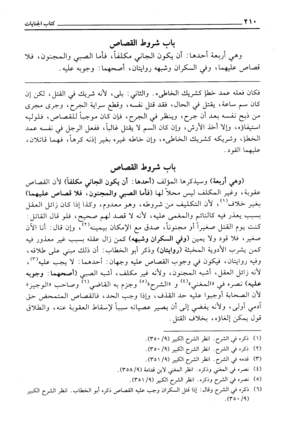 بَابُ شُرُوطِ الْقِصَاصِ وَهِيَ أَرْبَعَةٌ: أَحَدُهَا: أَنْ يَكُونَ الْجَانِي مُكَلَّفًا، فَأَمَّا الصَّبِيُّ، وَالْمَجْنُونُ، فَلَا قِصَاصَ عَلَيْهِمَا، وَفِي السَّكْرَانِ وَشِبْهِهِ رِوَايَتَانِ: أَصَحُّهُمَا: وُجُوبُهُ عَلَيْهِ.