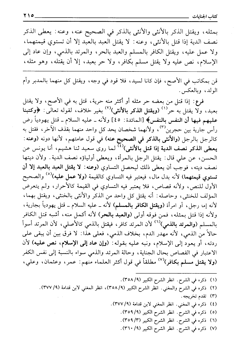 (وَيُقْتَلُ الذَّكَرُ بِالْأُنْثَى) بِغَيْرِ خِلَافٍ لِقَوْلِهِ تَعَالَى: {وَكَتَبْنَا عَلَيْهِمْ فِيهَا أَنَّ النَّفْسَ بِالنَّفْسِ} [المائدة: 45] وَلِأَنَّهُ - عَلَيْهِ السَّلَامُ - قَتَلَ يَهُودِيًّا رَضَّ رَأْسَ جَارِيَةٍ بَيْنَ حَجَرَيْنِ، وَلِأَنَّهُمَا شَخْصَانِ يُحَدُّ كُلُّ وَاحِدٍ مِنْهُمَا بِقَذْفِ الْآخَرِ فَقُتِلَ بِهِ كَالرَّجُلِ بِالرَّجُلِ (وَالْأُنْثَى بِالذَّكَرِ فِي الصَّحِيحِ عَنْهُ) فِي قَوْلِ عَامَّتِهِمْ ; لِأَنَّهَا دُونَهُ (وَعَنْهُ: يُعْطَى الذَّكَرُ نِصْفَ الدِّيَةِ إِذَا قُتِلَ بِالْأُنْثَى) لِمَا رَوَى سَعِيدٌ، ثَنَا هُشَيْمٌ، أَنَا يُونُسُ، عَنِ الْحَسَنِ، عَنْ عَلِيٍّ، قَالَ: يُقْتَلُ الرَّجُلُ بِالْمَرْأَةِ وَيُعْطَى أَوْلِيَاؤُهُ نِصْفَ الدِّيَةِ، وَلِأَنَّ دِيَتَهَا نِصْفُ دِيَتِهِ، فَوَجَبَ أَنْ يُعْطَى ذَلِكَ لِيَحْصُلَ التَّسَاوِي (وَعَنْهُ: لَا يُقْتَلُ الْعَبْدُ بِالْعَبْدِ إِلَّا أَنْ تَسْتَوِيَ قِيمَتُهُمَا) لِأَنَّهُ بَدَلُ مَالٍ فَيُعْتَبَرُ فِيهِ التَّسَاوِي كَالْقِيمَةِ (وَلَا عَمَلَ عَلَيْهِ) وَالصَّحِيحُ الْأَوَّلُ لِلنَّصِّ، وَلِأَنَّهُ قِصَاصٌ، فَلَا يُعْتَبَرُ فِيهِ التَّسَاوِي فِي الْقِيمَةِ كَالْأَحْرَارِ، وَلَمْ يَتَعَرَّضِ الْمُؤَلِّفُ لِلْخُنْثَى، وَحَاصِلُهُ أَنَّهُ يُقْتَلُ كُلُّ وَاحِدٍ مِنَ الذَّكَرِ وَالْأُنْثَى بِالْخُنْثَى وَيُقْتَلُ بِهِمَا ; لِأَنَّهُ إِمَّا رَجُلٌ، أَوِ امْرَأَةٌ (وَيُقْتَلُ الْكَافِرُ بِالْمُسْلِمِ) لِأَنَّهُ - عَلَيْهِ السَّلَامُ - قَتَلَ يَهُودِيًّا بِجَارِيَةٍ، وَلِأَنَّهُ إِذَا قُتِلَ بِمِثْلِهِ فَمَنْ فَوْقَهُ أَوْلَى (وَالْعَبْدُ بِالْحُرِّ) لِأَنَّهُ أَكْمَلُ مِنْهُ، أَشْبَهَ قَتْلَ الْكَافِرِ بِالْمُسْلِمِ (وَالْمُرْتَدِّ بِالذِّمِّيِّ) لِأَنَّ الْمُرْتَدَّ كَافِرٌ فَيُقْتَلُ بِالذِّمِّيِّ كَالْأَصْلِيِّ ; لِأَنَّ الْمُرْتَدَّ أَسْوَأُ حَالًا مِنَ الذِّمِّيِّ ; لِأَنَّهُ مُهْدَرُ الدَّمِ، بِخِلَافِ الذِّمِّيِّ، فَعَلَى هَذَا لَا فَرْقَ بَيْنَ أَنْ يَبْقَى عَلَى رِدَّتِهِ، أَوْ يَعُودَ إِلَى الْإِسْلَامِ وَنَبَّهَ عَلَيْهِ بِقَوْلِهِ (وَإِنْ عَادَ إِلَى الْإِسْلَامِ. نَصَّ عَلَيْهِ) لِأَنَّ الِاعْتِبَارَ فِي الْقِصَاصِ بِحَالِ الْجِنَايَةِ وَحَالَةِ الْمُرْتَدِّ وَالذِّمِّيِّ سَوَاءٌ بِالنِّسْبَةِ إِلَى نَفْسِ الْكُفْرِ (وَلَا يُقْتَلُ مُسْلِمٌ بِكَافِرٍ) مُطْلَقًا فِي قَوْلِ أَكْثَرِ الْعُلَمَاءِ، مِنْهُمْ عُمَرُ، وَعُثْمَانُ، وَعَلِيٌّ،