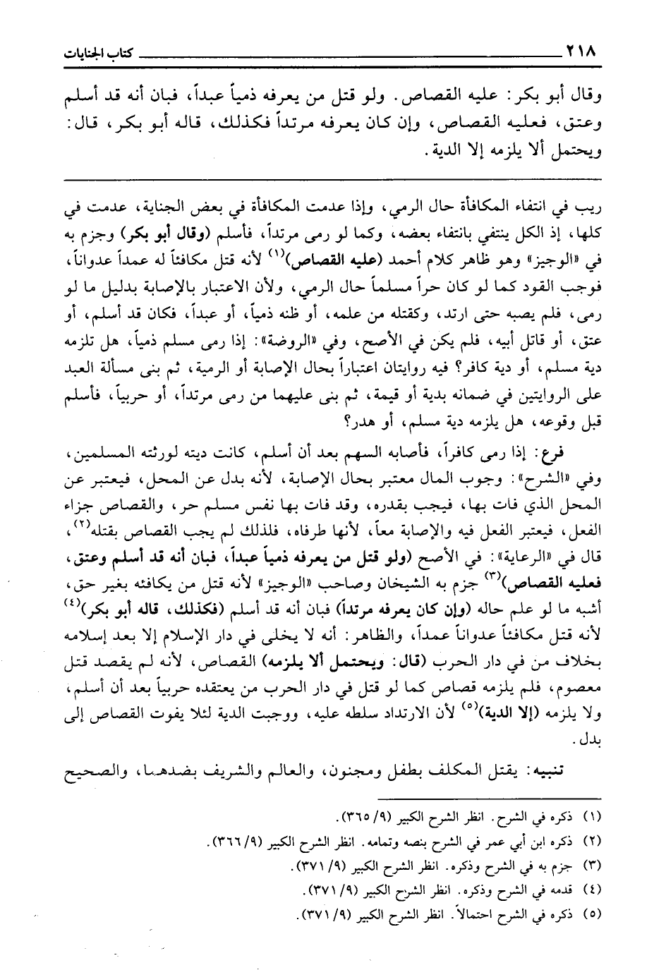 ـــــــــــــــــــــــــــــQرَيْبَ فِي انْتِفَاءِ الْمُكَافَأَةِ حَالَ الرَّمْيِ، وَإِذَا عُدِمَتِ الْمُكَافَأَةُ فِي بَعْضِ الْجِنَايَةِ عُدِمَتْ فِي كُلِّهَا إِذِ الْكُلُّ يَنْتَفِي بِانْتِفَاءِ بَعْضِهِ وَكَمَا لَوْ رَمَى مُرْتَدًّا فَأَسْلَمَ (وَقَالَ أَبُو بَكْرٍ) وَجَزَمَ بِهِ فِي " الْوَجِيزِ "، وَهُوَ ظَاهِرُ كَلَامِ أَحْمَدَ (عَلَيْهِ الْقِصَاصُ) لِأَنَّهُ قَتَلَ مُكَافِئًا لَهُ عَمْدًا عُدْوَانًا فَوَجَبَ الْقَوَدُ كَمَا لَوْ كَانَ حُرًّا مُسْلِمًا حَالَ الرَّمْيِ، وَلِأَنَّ الِاعْتِبَارَ بِالْإِصَابَةِ بِدَلِيلِ مَا لَوْ رَمَى، فَلَمْ يُصِبْهُ حَتَّى ارْتَدَّ وَكَقَتْلِهِ مَنْ عَلِمَهُ أَوْ ظَنَّهُ ذِمِّيًّا أَوْ عَبْدًا، فَكَانَ قَدْ أَسْلَمَ، أَوْ عَتَقَ، أَوْ قَاتِلَ أَبِيهِ، فَلَمْ يَكُنْ فِي الْأَصَحِّ، وَفِي " الرَّوْضَةِ " إِذَا رَمَى مُسْلِمٌ ذِمِّيًّا هَلْ تَلْزَمُهُ دِيَةُ مُسْلِمٍ أَوْ دِيَةُ كَافِرٍ؟ فِيهِ رِوَايَتَانِ اعْتِبَارًا بِحَالِ الْإِصَابَةِ، أَوِ الرَّمْيَةِ، ثُمَّ بَنَى مَسْأَلَةَ الْعَبْدِ عَلَى الرِّوَايَتَيْنِ فِي ضَمَانِهِ بِدِيَةٍ أَوْ قِيمَةٍ، ثُمَّ بَنَى عَلَيْهِمَا مَنْ رَمَى مُرْتَدًّا، أَوْ حَرْبِيًّا فَأَسْلَمَ قَبْلَ وُقُوعِهِ هَلْ يَلْزَمُهُ دِيَةُ مُسْلِمٍ، أَوْ هَدَرٌ؟ .