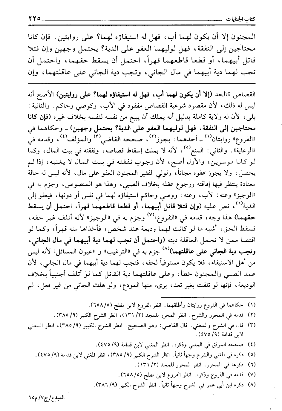 الْمَجْنُونُ إِلَّا أَنْ يَكُونَ لَهُمَا أَبٌ، فَهَلْ لَهُ اسْتِيفَاؤُهُ لَهُمَا؟ عَلَى رِوَايَتَيْنِ، فَإِنْ كَانَا مُحْتَاجَيْنِ إِلَى النَّفَقَةِ، فَهَلْ لِوَلِيِّهِمَا الْعَفْوُ عَلَى الدِّيَةِ؟ يَحْتَمِلُ وَجْهَيْنِ. وَإِنْ قَتَلَا قَاتِلَ أَبِيهِمَا، أَوْ قَطَعَا قَاطِعَهُمَا قَهْرًا احْتَمَلَ أَنْ يَسْقُطَ حَقُّهُمَا، وَاحْتَمَلَ أَنْ تَجِبَ لَهُمَا دِيَةُ أَبِيهِمَا فِي مَالِ الْجَانِي وَتَجِبُ دِيَةُ الْجَانِي عَلَى عَاقِلَتِهِمَا، وَإِنِ