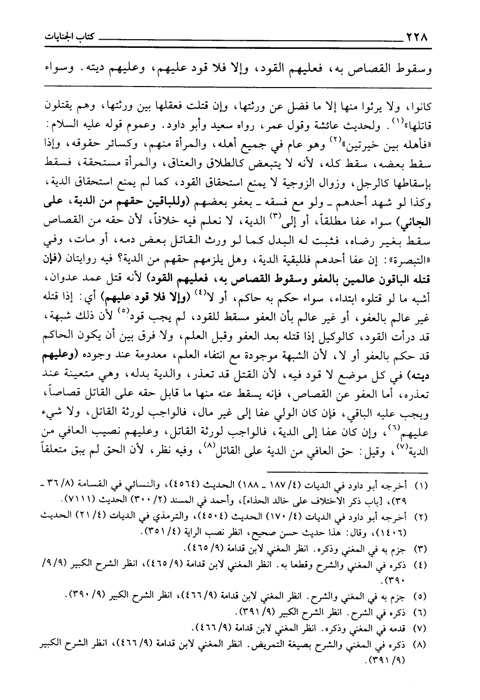 ـــــــــــــــــــــــــــــQكَانُوا، وَلَا يَرِثُوا مِنْهَا إِلَّا مَا فَضَلَ عَنْ وَرَثَتِهَا، وَإِنْ قُتِلَتْ فَعَقْلُهَا بَيْنَ وَرَثَتِهَا وَهُمْ يَقْتُلُونَ قَاتِلَهَا» . وَلِحَدِيثِ عَائِشَةَ، وَقَوْلِ عُمَرَ رَوَاهُ سَعِيدٌ، وَأَبُو دَاوُدَ، وَعُمُومِ قَوْلِهِ - عَلَيْهِ السَّلَامُ - فَأَهْلُهُ بَيْنَ خِيَرَتَيْنِ وَهُوَ عَامٌّ فِي جَمِيعِ أَهْلِهِ، وَالْمَرْأَةُ مِنْهُمْ وَكَسَائِرِ حُقُوقِهِ وَإِذَا سَقَطَ بَعْضُهُ سَقَطَ كُلُّهُ ; لِأَنَّهُ لَا يَتَبَعَّضُ كَالطَّلَاقِ، وَالْعَتَاقِ، وَالْمَرْأَةُ مُسْتَحِقَّةٌ فَسَقَطَ بِإِسْقَاطِهَا كَالرَّجُلِ، وَزَوَالُ الزَّوْجِيَّةِ لَا يَمْنَعُ اسْتِحْقَاقَ الْقَوَدِ كَمَا لَمْ يَمْنَعِ اسْتِحْقَاقَ الدِّيَةِ، وَكَذَا لَوْ شَهِدَ أَحَدُهُمْ وَلَوْ مَعَ فِسْقِهِ بِعَفْوِ بَعْضِهِمْ (وَلِلْبَاقِينَ حَقُّهُمْ مِنَ الدِّيَةِ عَلَى الْجَانِي) سَوَاءٌ عَفَا مُطْلَقًا، أَوْ إِلَى الدِّيَةِ، لَا نَعْلَمُ فِيهِ خِلَافًا ; لِأَنَّ حَقَّهُ مِنَ الْقِصَاصِ سَقَطَ بِغَيْرِ رِضَاهُ فَثَبَتَ لَهُ الْبَدَلُ كَمَا لَوْ وَرِثَ الْقَاتِلُ بَعْضَ دَمِهِ، أَوْ مَاتَ، وَفِي " التَّبْصِرَةِ " إِنْ عَفَا أَحَدُهُمْ فَلِلْبَقِيَّةِ الدِّيَةُ، وَهَلْ يَلْزَمُهُمْ حَقُّهُمْ مِنَ الدِّيَةِ؟ فِيهِ رِوَايَتَانِ (فَإِنْ قَتَلَهُ الْبَاقُونَ عَالِمِينَ بِالْعَفْوِ وَسُقُوطِ الْقِصَاصِ بِهِ فَعَلَيْهِمُ الْقَوَدُ) لِأَنَّهُ قَتْلُ عَمْدٍ عُدْوَانٍ، أَشْبَهَ مَا لَوْ قَتَلُوهُ ابْتِدَاءً، سَوَاءٌ حَكَمَ بِهِ حَاكِمٌ، أَوْ لَا (وَإِلَّا فَلَا قَوَدَ عَلَيْهِمْ) أَيْ: إِذَا قَتَلَهُ غَيْرَ عَالِمٍ بِالْعَفْوِ، أَوْ غَيْرَ عَالِمٍ بِأَنَّ الْعَفْوَ مُسْقِطٌ لِلْقَوَدِ لَمْ يَجِبْ قَوَدٌ ; لِأَنَّ ذلَكَ شُبْهَةً قَدْ دَرَأَتِ الْقَوَدَ كَالْوَكِيلِ إِذَا قَتَلَهُ بَعْدَ الْعَفْوِ، وَقَبْلَ الْعِلْمِ، وَلَا فَرْقَ بَيْنَ أَنْ يَكُونَ الْحَاكِمُ قَدْ حَكَمَ بِالْعَفْوِ أَوْ لَا ; لِأَنَّ الشُّبْهَةَ مَوْجُودَةٌ مَعَ انْتِفَاءِ الْعِلْمِ، مَعْدُومَةٌ عِنْدَ وُجُودِهِ (وَعَلَيْهِمْ دِيَتُهُ) فِي كُلِّ مَوْضِعٍ لَا قَوَدَ فِيهِ ; لِأَنَّ الْقَتْلَ قَدْ تَعَذَّرَ، وَالدِّيَةُ بَدَلُهُ، وَهِيَ مُتَعَيِّنَةٌ عِنْدَ تَعَذُّرِهِ، أَمَّا الْعَفْوُ عَنِ الْقِصَاصِ، فَإِنَّهُ يُسْقِطُ عَنْهُ مِنْهَا مَا قَابَلَ حَقَّهُ عَلَى الْقَاتِلِ قِصَاصًا وَيَجِبُ عَلَيْهِ الْبَاقِي، فَإِنْ كَانَ الْوَلِيُّ عَفَا إِلَى غَيْرِ مَالٍ فَالْوَاجِبُ لِوَرَثَةِ الْقَاتِلِ، وَلَا شَيْءَ عَلَيْهِمْ، وَإِنْ كَانَ عَفَا إِلَى الدِّيَةِ، فَالْوَاجِبُ لِوَرَثَةِ الْقَاتِلِ وَعَلَيْهِمْ نَصِيبُ الْعَافِي مِنَ الدِّيَةِ، وَقِيلَ: حَقُّ الْعَافِي مِنَ الدِّيَةِ عَلَى الْقَاتِلِ، وَفِيهِ نَظَرٌ ; لِأَنَّ الْحَقَّ لَمْ يَبْقَ مُتَعَلِّقًا