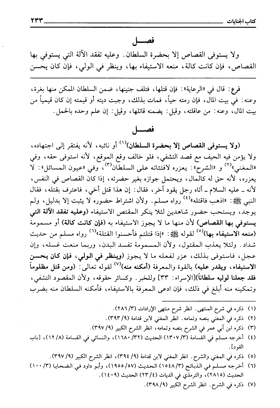 فَصْلٌ (وَلَا يُسْتَوْفَى الْقِصَاصُ إِلَّا بِحَضْرَةِ السُّلْطَانِ) أَوْ نَائِبِهِ لِأَنَّهُ يُفْتَقَرُ إِلَى اجْتِهَادِهِ، وَلَا يُؤْمَنُ فِيهِ الْحَيْفُ مَعَ قَصْدِ التَّشَفِّي، فَلَوْ خَالَفَ وَقَعَ الْمَوْقِعَ ; لِأَنَّهُ اسْتَوْفَى حَقَّهُ، وَفِي " الْمُغْنِي "، وَ " الشَّرْحِ " يُعَزِّرُهُ لِافْتِئَاتِهِ عَلَى السُّلْطَانِ، وَفِي " عُيُونِ الْمَسَائِلِ ": لَا يُعَزِّرُهُ ; لِأَنَّهُ حَقٌّ لَهُ كَالْمَالِ، وَيُحْتَمَلُ جَوَازُهُ بِغَيْرِ حَضْرَتِهِ إِذَا كَانَ الْقِصَاصُ فِي النَّفْسِ ; لِأَنَّهُ - «- عَلَيْهِ السَّلَامُ - أَتَاهُ رَجُلٌ يَقُودُ آخَرَ، فَقَالَ: إِنَّ هَذَا قَتَلَ أَخِي فَاعْتَرَفَ بِقَتْلِهِ، فَقَالَ النَّبِيُّ - صَلَّى اللَّهُ عَلَيْهِ وَسَلَّمَ -: اذْهَبْ فَاقْتُلْهُ» رَوَاهُ مُسْلِمٌ. وَلِأَنَّ اشْتِرَاطَ حُضُورِهِ لَا يَثْبُتُ إِلَّا بِدَلِيلٍ، وَلَمْ يُوجَدْ وَيُسْتَحَبُّ حُضُورُ شَاهِدَيْنِ لِئَلَّا يُنْكِرَ الْمُقْتَصُّ الِاسْتِيفَاءَ (وَعَلَيْهِ تَفَقُّدُ الْآلَةِ الَّتِي يُسْتَوْفَى بِهَا الْقِصَاصُ) لِأَنَّ مِنْهَا مَا لَا يَجُوزُ الِاسْتِيفَاءُ بِهِ (فَإِنْ كَانَتْ كَالَّةً) أَوْ مَسْمُومَةً (مَنَعَهُ الِاسْتِيفَاءَ بِهَا) لِقَوْلِهِ - صَلَّى اللَّهُ عَلَيْهِ وَسَلَّمَ -: «إِذَا قَتَلْتُمْ فَأَحْسِنُوا الْقِتْلَةَ» رَوَاهُ مُسْلِمٌ مِنْ حَدِيثِ شَدَّادٍ، وَلِئَلَّا يُعَذَّبَ الْمَقْتُولُ، وَلِأَنَّ الْمَسْمُومَةَ تُفْسِدُ الْبَدَنَ وَرُبَّمَا مَنَعَتْ غَسْلَهُ، وَإِنْ عَجَّلَ فَاسْتَوْفَى بِذَلِكَ عُزِّرَ لِفِعْلِهِ مَا لَا يَجُوزُ (وَيَنْظُرُ فِي الْوَلِيِّ، فَإِنْ كَانَ يُحْسِنُ الِاسْتِيفَاءَ وَيَقْدِرُ عَلَيْهِ) بِالْقُوَّةِ، وَالْمَعْرِفَةِ (أَمْكَنَهُ مِنْهُ) لِقَوْلِهِ تَعَالَى: {وَمَنْ قُتِلَ مَظْلُومًا فَقَدْ جَعَلْنَا لِوَلِيِّهِ سُلْطَانًا} [الإسراء: 33] وَلِلْخَبَرِ، وَكَسَائِرِ حُقُوقِهِ، وَلِأَنَّ الْمَقْصُودَ التَّشَفِّي، وَتَمْكِينُهُ مِنْهُ أَبْلَغُ فِي ذَلِكَ، فَإِنِ ادَّعَى الْمَعْرِفَةَ بِالِاسْتِيفَاءِ فَأَمْكَنَهُ السُّلْطَانُ مِنْهُ بِضَرْبِ