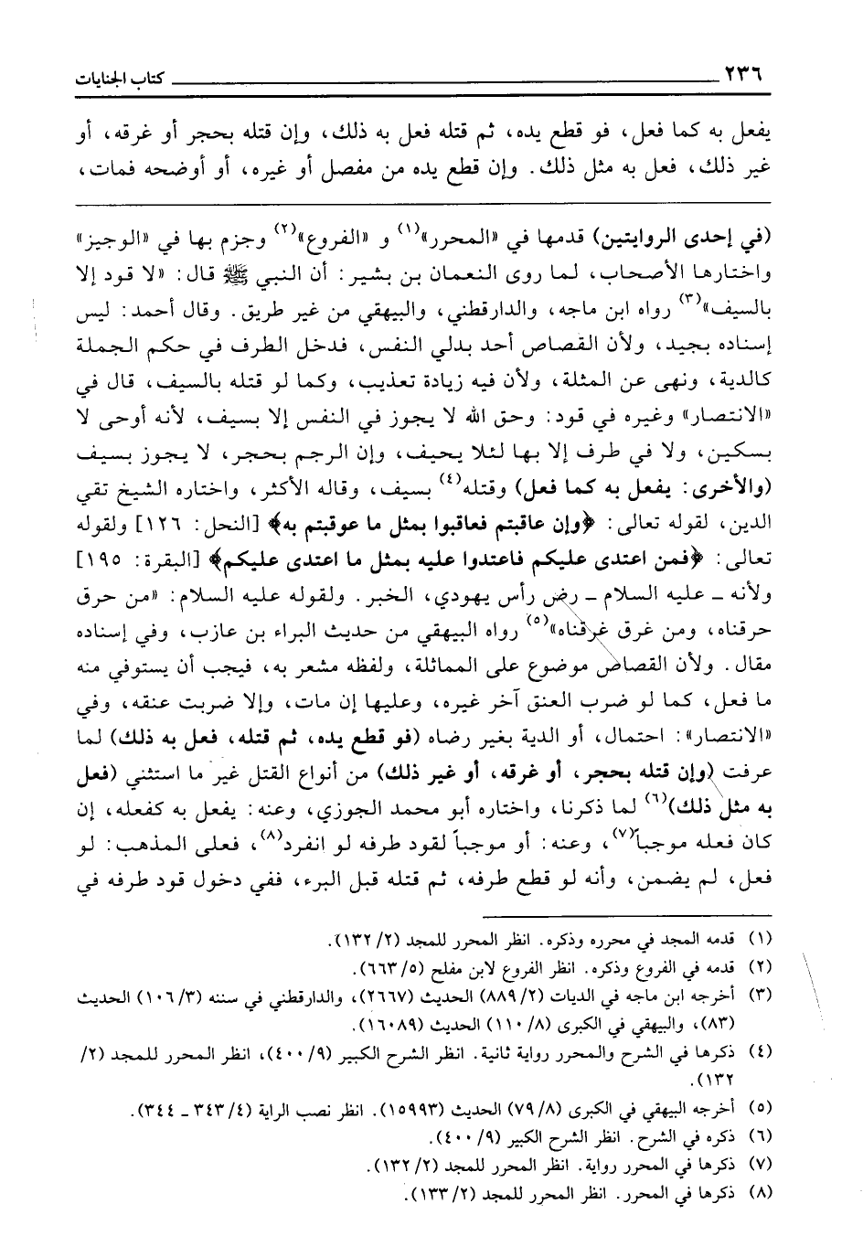 ـــــــــــــــــــــــــــــQ (فِي إِحْدَى الرِّوَايَتَيْنِ) قَدَّمَهَا فِي " الْمُحَرَّرِ "، وَ " الْفُرُوعِ "، وَجَزَمَ بِهَا فِي " الْوَجِيزِ "، وَاخْتَارَهَا الْأَصْحَابُ لِمَا رَوَى النُّعْمَانُ بْنُ بَشِيرٍ أَنَّ النَّبِيَّ - صَلَّى اللَّهُ عَلَيْهِ وَسَلَّمَ - قَالَ: «لَا قَوَدَ إِلَّا بِالسَّيْفِ» رَوَاهُ ابْنُ مَاجَهْ، وَالدَّارَقُطْنِيُّ، وَالْبَيْهَقِيُّ مِنْ غَيْرِ طَرِيقٍ، وَقَالَ أَحْمَدُ: لَيْسَ إِسْنَادُهُ بِجَيِّدٍ، وَلِأَنَّ الْقِصَاصَ أَحَدُ بَدَلَيِ النَّفْسِ فَدَخَلَ الطَّرَفُ فِي حُكْمِ الْجُمْلَةِ كَالدِّيَةِ، وَنَهَى عَنِ الْمُثْلَةِ، وَلِأَنَّ فِيهِ زِيَادَةُ تَعْذِيبٍ وَكَمَا لَوْ قَتَلَهُ بِالسَّيْفِ، قَالَ فِي " الِانْتِصَارِ " وَغَيْرِهِ فِي قَوَدٍ: وَحَقُّ اللَّهِ لَا يَجُوزُ فِي النَّفْسِ إِلَّا بِسَيْفٍ ; لِأَنَّهُ أَوْحَى، لَا بِسِكِّينٍ، وَلَا فِي طَرَفٍ إِلَّا بِهَا لِئَلَّا يَحِيفَ، وَإِنَّ الرَّجْمَ بِحَجَرٍ، لَا يَجُوزُ بِسَيْفٍ (وَالْأُخْرَى: يُفْعَلُ بِهِ كَمَا فَعَلَ) وَقَتَلَهُ بِسَيْفٍ، وَقَالَهُ الْأَكْثَرُ، وَاخْتَارَهُ الشَّيْخُ تَقِيُّ الدِّينِ لِقَوْلِهِ تَعَالَى: {وَإِنْ عَاقَبْتُمْ فَعَاقِبُوا بِمِثْلِ مَا عُوقِبْتُمْ بِهِ} [النحل: 126] وَلِقَوْلِهِ تَعَالَى: {فَمَنِ اعْتَدَى عَلَيْكُمْ فَاعْتَدُوا عَلَيْهِ بِمِثْلِ مَا اعْتَدَى عَلَيْكُمْ} [البقرة: 194] «وَلِأَنَّهُ - عَلَيْهِ السَّلَامُ - رَضَّ رَأْسَ يَهُودِيٍّ» . . . الْخَبَرَ، وَلِقَوْلِهِ - عَلَيْهِ السَّلَامُ - «مَنْ حَرَّقَ حَرَّقْنَاهُ وَمَنْ غَرَّقَ غَرَّقْنَاهُ» رَوَاهُ الْبَيْهَقِيُّ مِنْ حَدِيثِ الْبَرَاءِ بْنِ عَازِبٍ، وَفِي إِسْنَادِهِ مَقَالٌ، وَلِأَنَّ الْقِصَاصَ مَوْضُوعٌ عَلَى الْمُمَاثَلَةِ وَلَفْظُهُ مُشْعِرٌ بِهِ فَيَجِبُ أَنْ يَسْتَوْفِيَ مِنْهُ مَا فَعَلَ كَمَا لَوْ ضَرَبَ الْعُنُقَ آخَرُ غَيْرُهُ وَعَلَيْهَا إِنْ مَاتَ وَإِلَّا ضُرِبَتْ عُنُقُهُ، وَفِي " الِانْتِصَارِ " احْتِمَالٌ، أَوِ الدِّيَةُ بِغَيْرِ رِضَاهُ (فَلَوْ قَطَعَ يَدَهُ، ثُمَّ قَتَلَهُ فُعِلَ بِهِ ذَلِكَ) لِمَا عَرَفْتَ (وَإِنْ قَتَلَهُ بِحَجَرٍ، أَوْ غَرَّقَهُ أَوْ غَيْرِ ذَلِكَ) مِنْ أَنْوَاعِ الْقَتْلِ غَيْرِ مَا اسْتُثْنِيَ (فُعِلَ بِهِ مِثْلُ ذَلِكَ) لِمَا ذَكَرْنَا، وَاخْتَارَهُ أَبُو مُحَمَّدٍ الْجَوْزِيُّ، وَعَنْهُ: يُفْعَلُ بِهِ كَفِعْلِهِ إِنْ كَانَ فِعْلُهُ مُوجِبًا، وَعَنْهُ: أَوْ مُوجِبًا لِقَوَدِ طَرَفِهِ لَوِ انْفَرَدَ، فَعَلَى الْمَذْهَبِ: لَوْ فَعَلَ لَمْ يَضْمَنْ، وَأَنَّهُ لَوْ قَطَعَ طَرَفَهُ، ثُمَّ قَتَلَهُ قَبْلَ الْبُرْءِ فَفِي دُخُولِ قَوَدِ طَرَفِهِ فِي