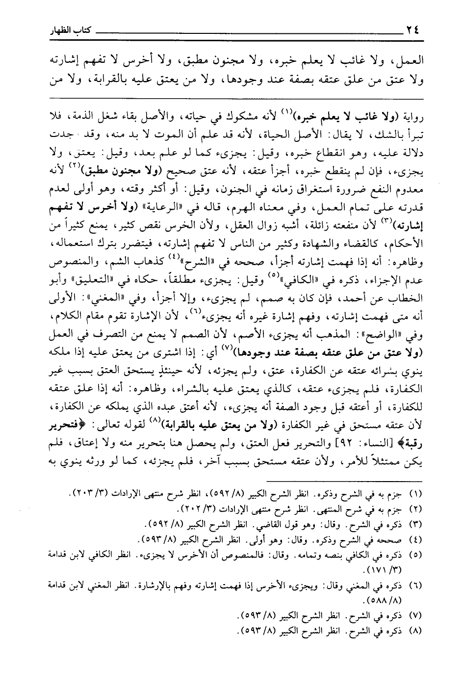 ـــــــــــــــــــــــــــــQرِوَايَةٌ (وَلَا غَائِبٌ، لَا يُعْلَمُ خَبَرُهُ) لِأَنَّهُ مَشْكُوكٌ فِي حَيَاتِهِ. وَالْأَصْلُ بَقَاءُ شَغْلِ الذِّمَّةِ، فَلَا تَبْرَأُ بِالشَّكِّ. لَا يُقَالُ: الْأَصْلُ الْحَيَاةُ ; لِأَنَّهُ قَدْ عَلِمَ أَنَّ الْمَوْتَ، لَا بُدَّ مِنْهُ، وَقَدْ وُجِدَتْ دَلَالَةٌ عَلَيْهِ، وَهُوَ انْقِطَاعُ خَبَرِهِ، وَقِيلَ: يُجْزِئُ كَمَا لَوْ عُلِمَ بَعْدُ. وَقِيلَ: يُعْتَقُ، وَلَا يُجْزِئُ، فَإِنْ لَمْ يَنْقَطِعْ خَبَرُهُ، أَجْزَأَ عِتْقُهُ ; لِأَنَّهُ عِتْقٌ صَحِيحٌ (وَلَا مَجْنُونٌ مُطْبِقٌ) لِأَنَّهُ مَعْدُومُ النَّفْعِ ضَرُورَةَ اسْتِغْرَاقِ زَمَانِهِ فِي الْجُنُونِ، وَقِيلَ: أَوْ أَكْثَرَ وَقْتُهُ. وَهُوَ أَوْلَى لِعَدَمِ قُدْرَتِهِ عَلَى تَمَامِ الْعَمَلِ. وَفِي مَعْنَاهُ الْهَرَمُ قَالَهُ فِي " الرِّعَايَةِ " (وَلَا أَخْرَسُ لَا تُفْهَمُ إِشَارَتُهُ) لِأَنَّ مَنْفَعَتَهُ زَائِلَةٌ أَشْبَهَ زَوَالَ الْعَقْلِ، وَلِأَنَّ الْخَرَسَ نَقْصٌ كَثِيرٌ يَمْنَعُ كَثِيرًا مِنَ الْأَحْكَامِ كَالْقَضَاءِ، وَالشَّهَادَةِ، وَكَثِيرٌ مِنَ النَّاسِ لَا تَفْهَمُ إِشَارَتَهُ فَيَتَضَرَّرُ بِتَرْكِ اسْتِعْمَالِهِ. وَظَاهِرُهُ أَنَّهُ إِذَا فُهِمَتْ إِشَارَتُهُ أَجْزَأَ. صَحَّحَهُ فِي " الشَّرْحِ " كَذَهَابِ الشَّمِّ، وَالْمَنْصُوصُ عَدَمُ الْإِجْزَاءِ ذَكَرَهُ فِي " الْكَافِي "، وَقِيلَ: يُجْزِئُ مُطْلَقًا حَكَاهُ فِي التَّعْلِيقِ وَأَبُو الْخَطَّابِ عَنْ أَحْمَدَ. فَإِنْ كَانَ بِهِ صَمَمٌ لَمْ يُجْزِئْ وَإِلَّا أَجْزَأَ. وَفِي " الْمُغْنِي ": الْأَوْلَى أَنَّهُ مَتَى فُهِمَتْ إِشَارَتُهُ وَفَهِمَ إِشَارَةَ غَيْرِهِ أَنَّهُ يُجْزِئُ ; لِأَنَّ الْإِشَارَةَ تَقُومُ مُقَامَ الْكَلَامِ. وَفِي " الْوَاضِحِ ": الْمَذْهَبُ أَنَّهُ يُجْزِئُ الْأَصَمَّ ; لِأَنَّ الصَّمَمَ لَا يَمْنَعُ مِنَ التَّصَرُّفِ فِي الْعَمَلِ (وَلَا عِتْقَ مَنْ عَلَّقَ عِتْقَهُ بِصِفَةٍ عِنْدَ وُجُودِهَا) أَيْ: إِذَا اشْتَرَى مَنْ يُعْتِقُ عَلَيْهِ إِذَا مَلَكَهُ يَنْوِي بِشِرَائِهِ عِتْقَهُ عَنِ الْكَفَّارَةِ عَتَقَ، وَلَمْ يُجْزِئْهُ ; لِأَنَّهُ حِينَئِذٍ يَسْتَحِقُّ الْعِتْقَ بِسَبَبٍ غَيْرِ الْكَفَّارَةِ، فَلَمْ يُجْزِئْ عِتْقُهُ كَالَّذِي يُعْتَقُ عَلَيْهِ بِالشِّرَاءِ. وَظَاهِرُهُ أَنَّهُ إِذَا عَلَّقَ عِتْقَهُ لِلْكَفَّارَةِ، أَوْ أَعْتَقَهُ قَبْلَ وُجُودِ الصِّفَةِ أَنَّهُ يُجْزِئُ ; لِأَنَّهُ أَعْتَقَ عَبْدَه الَّذِي يَمْلِكُهُ عَنِ الْكَفَّارَةِ ; لِأَنَّ عِتْقَهُ مُسْتَحِقٌّ فِي غَيْرِ الْكَفَّارَةِ.