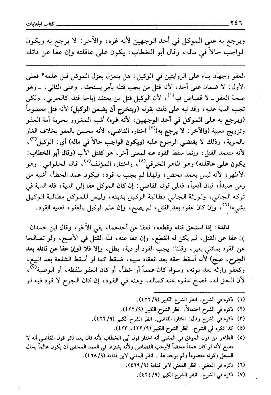 ـــــــــــــــــــــــــــــQالْعَفْوِ وَجْهَانِ بِنَاءً عَلَى الرِّوَايَتَيْنِ فِي الْوَكِيلِ، هَلْ يَنْعَزِلُ بِعَزْلِ الْمُوَكِّلِ قَبْلَ عِلْمِهِ؟ فَعَلَى الْأَوَّلِ: لَا ضَمَانَ عَلَى أَحَدٍ ; لِأَنَّهُ قَتَلَ مَنْ يَجِبُ قَتْلُهُ بِأَمْرٍ يَسْتَحِقُّهُ. وَعَلَى الثَّانِي، وَهُوَ صِحَّةُ الْعَفْوِ: لَا قِصَاصَ فِيهِ ; لِأَنَّ الْوَكِيلَ قَتَلَ مَنْ يَعْتَقِدُ إِبَاحَةَ قَتْلِهِ كَالْحَرْبِيِّ، وَلَكِنْ تَجِبُ الدِّيَةُ عَلَيْهِ، وَقَدْ نَبَّهَ عَلَى ذَلِكَ بِقَوْلِهِ (وَيَتَخَرَّجُ أَنْ يَضْمَنَ الْوَكِيلُ) لِأَنَّهُ قَتَلَ مَعْصُومًا (وَيَرْجِعُ بِهِ عَلَى الْمُوَكِّلِ فِي أَحَدِ الْوَجْهَيْنِ ; لِأَنَّهُ غَرَّهُ) أَشْبَهَ الْمَغْرُورَ بِحُرِّيَّةِ أَمَةٍ وَتَزْوِيجِ مَعِيبَةٍ (وَالْآخَرُ لَا يَرْجِعُ بِهِ) اخْتَارَهُ الْقَاضِي ; لِأَنَّهُ مُحْسِنٌ بِالْعَفْوِ، بِخِلَافِ الْغَارِّ بِالْحُرِّيَّةِ، وَذَلِكَ لَا يَقْتَضِي الرُّجُوعَ عَلَيْهِ (وَيَكُونُ الْوَاجِبُ حَالًّا فِي مَالِهِ) أَيِ: الْوَكِيلُ ; لِأَنَّهُ مُتَعَمِّدٌ لِلْقَتْلِ، وَإِنَّمَا سَقَطَ الْقَوَدُ عَنْهُ لِمَعْنًى آخَرَ، فَهُوَ كَقَتْلِ الْأَبِ (وَقَالَ أَبُو الْخَطَّابِ: يَكُونُ عَلَى عَاقِلَتِهِ) وَهُوَ ظَاهِرُ الْخِرَقِيِّ، وَاخْتَارَهُ الْمُؤَلِّفُ، قَالَ الْحُلْوَانِيُّ: وَهُوَ الْأَظْهَرُ ; لِأَنَّهُ لَيْسَ بِعَمْدٍ مَحْضٍ، وَلِهَذَا لَمْ يَجِبْ بِهِ قَوَدٌ، فَيَكُونُ عَمْدَ الْخَطَأِ، أَشْبَهَ مَنْ رَمَى صَيْدًا فَبَانَ آدَمِيًّا، فَعَلَى قَوْلِ الْقَاضِي إِنْ كَانَ الْمُوَكِّلُ عَفَا إِلَى الدِّيَةِ فَلَهُ الدِّيَةُ فِي تَرِكَةِ الْجَانِي وَلِوَرَثَةِ الْجَانِي مُطَالَبَةُ الْوَكِيلِ بِدِيَتِهِ، وَلَيْسَ لِلْمُوَكِّلِ مُطَالَبَةُ الْوَكِيلِ بِشَيْءٍ، وَإِنْ كَانَ عَفْوُهُ بَعْدَ الْقَتْلِ لَمْ يَصِحَّ، وَإِنْ عَلِمَ الْوَكِيلُ بِالْعَفْوِ فَعَلَيْهِ الْقَوَدُ.
