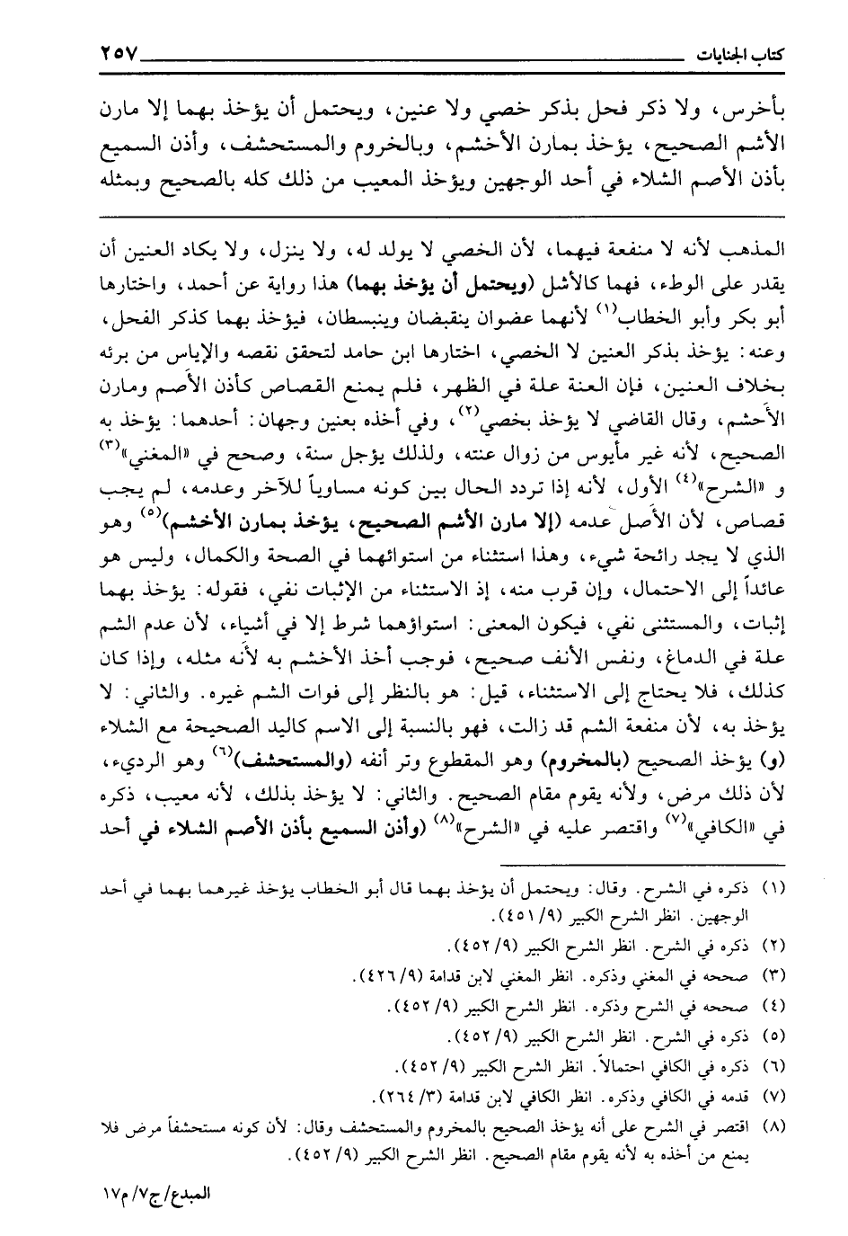 ـــــــــــــــــــــــــــــQالْمَذْهَبِ ; لِأَنَّهُ لَا مَنْفَعَةَ فِيهِمَا ; لِأَنَّ الْخَصِيَّ لَا يُولَدُ لَهُ، وَلَا يُنْزِلُ، وَلَا يَكَادُ الْعِنِّينُ أَنْ يَقْدِرَ عَلَى الْوَطْءِ فَهُمَا كَالْأَشَلِّ (وَيُحْتَمَلُ أَنْ يُؤْخَذَ بِهِمَا) هَذَا رِوَايَةً عَنْ أَحْمَدَ، وَاخْتَارَهَا أَبُو بَكْرٍ، وَأَبُو الْخَطَّابِ ; لِأَنَّهُمَا عُضْوَانِ يَنْقَبِضَانِ وَيَنْبَسِطَانِ فَيُؤْخَذُ بِهِمَا كَذَكَرِ الْفَحْلِ، وَعَنْهُ: يُؤْخَذُ بِذَكَرِ الْعِنِّينِ، لَا الْخَصِيِّ. اخْتَارَهَا ابْنُ حَامِدٍ لِتَحَقُّقِ نَقْصِهِ وَالْإِيَاسِ مِنْ بُرْئِهِ، بِخِلَافِ الْعِنِّينِ، فَإِنَّ الْعِنَّةَ عِلَّةٌ فِي الظَّهْرِ، فَلَمْ يَمْنَعِ الْقِصَاصَ كَأُذُنِ الْأَصَمِّ، وَمَارِنِ الْأَخْشَمِ، وَقَالَ الْقَاضِي: لَا يُؤْخَذُ بِخَصِيٍّ، وَفِي أَخْذِهِ بِعِنِّينٍ وَجْهَانِ: أَحَدُهُمَا: يُؤْخَذُ بِهِ الصَّحِيحُ ; لِأَنَّهُ غَيْرُ مَأْيُوسٍ مِنْ زَوَالِ عِنَّتِهِ، وَلِذَلِكَ يُؤَجَّلُ سَنَةً وَصَحَّحَ فِي " الْمُغْنِي "، وَ " الشَّرْحِ " الْأَوَّلَ ; لِأَنَّهُ إِذَا تَرَدَّدَ الْحَالُ بَيْنَ كَوْنِهِ مُسَاوِيًا لِلْآخَرِ وَعَدَمِهِ لَمْ يَجِبْ قِصَاصٌ ; لِأَنَّ الْأَصْلَ عَدَمُهُ (إِلَّا مَارِنَ الْأَشَمِّ الصَّحِيحِ يُؤْخَذُ بِمَارِنِ الْأَخْشَمِ) وَهُوَ الَّذِي لَا يَجِدُ رَائِحَةَ شَيْءٍ، وَهَذَا اسْتِثْنَاءٌ مِنَ اسْتِوَائِهِمَا فِي الصِّحَّةِ، وَالْكَمَالِ، وَلَيْسَ هُوَ عَائِدًا إِلَى الِاحْتِمَالِ، وَإِنْ قَرُبَ مِنْهُ إِذِ الِاسْتِثْنَاءُ مِنَ الْإِثْبَاتِ نَفْيٌ، فَقَوْلُهُ يُؤْخَذُ بِهِمَا إِثْبَاتٌ، وَالْمُسْتَثْنَى نَفْيٌ، فَيَكُونُ الْمَعْنَى: اسْتِوَاؤُهُمَا شَرْطٌ إِلَّا فِي أَشْيَاءَ لِأَنَّ عَدَمَ الشَّمِّ عِلَّةٌ فِي الدِّمَاغِ، وَنَفْسُ الْأَنْفِ صَحِيحٌ فَوَجَبَ أَخْذُ الْأَخْشَمِ بِهِ ; لِأَنَّهُ مِثْلُهُ، وَإِذَا كَانَ كَذَلِكَ، فَلَا يَحْتَاجُ إِلَى الِاسْتِثْنَاءِ، قِيلَ: هُوَ بِالنَّظَرِ إِلَى فَوَاتِ الشَّمِّ غَيْرُهُ، وَالثَّانِي: لَا يُؤْخَذُ بِهِ ; لِأَنَّ مَنْفَعَةَ الشَّمِّ قَدْ زَالَتْ، فَهُوَ بِالنِّسْبَةِ إِلَى الِاسْمِ كَالْيَدِ الصَّحِيحَةِ مَعَ الشَّلَّاءِ (وَ) يُؤْخَذُ الصَّحِيحُ (بِالْمَخْرُومِ) وَهُوَ الْمَقْطُوعُ وَتَرُ أَنْفِهِ (وَالْمُسْتَحْشَفُ) وَهُوَ الرَّدِيءُ ; لِأَنَّ ذَلِكَ مَرَضٌ، وَلِأَنَّهُ يَقُومُ مَقَامَ الصَّحِيحِ، وَالثَّانِي: لَا يُؤْخَذُ بِذَلِكَ ; لِأَنَّهُ مَعِيبٌ، ذَكَرَهُ فِي " الْكَافِي " وَاقْتَصَرَ عَلَيْهِ فِي " الشَّرْحِ " (وَأُذُنُ السَّمِيعِ بِأُذُنِ الْأَصَمِّ الشَّلَّاءِ فِي أَحَدِ