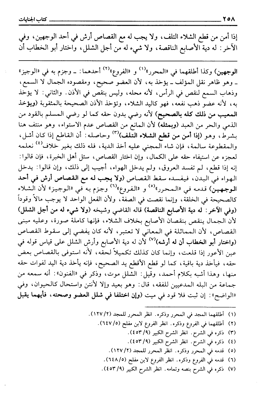 وَالثَّانِي: لَا يُؤْخَذُ بِهِ ; لِأَنَّهُ عُضْوٌ ذَهَبَ نَفْعُهُ، فَهُوَ كَالْيَدِ الشَّلَّاءِ وَتُؤْخَذُ الْأُذُنُ الصَّحِيحَةُ بِالْمَثْقُوبَةِ (وَيُؤْخَذُ الْمَعِيبُ مِنْ ذَلِكَ كُلِّهِ بِالصَّحِيحِ) لِأَنَّهُ رَضِيَ بِدُونِ حَقِّهِ كَمَا لَوْ رَضِيَ الْمُسْلِمُ بِالْقَوَدِ مِنَ الذِّمِّيِّ، وَالْحُرُّ مِنَ الْعَبْدِ (وَبِمِثْلِهِ) لِأَنَّ الْمَانِعَ مِنَ الْقِصَاصِ عَدَمُ الِاسْتِوَاءِ، وَهُوَ مُنْتَفٍ هُنَا بِشَرْطٍ، وَهُوَ (إِذَا أُمِنَ مِنْ قَطْعِ الشَّلَّاءِ التَّلَفُ) وَحَاصِلُهُ: أَنَّ الْقَاطِعَ إِذَا كَانَ أَشَلَّ، وَالْمَقْطُوعَةُ سَالِمَةٌ، فَإِنْ شَاءَ الْمَجْنِيُّ عَلَيْهِ أَخْذَ الدِّيَةِ فَلَهُ ذَلِكَ بِغَيْرِ خِلَافٍ نَعْلَمُهُ لِعَجْزِهِ عَنِ اسْتِيفَاءِ حَقِّهِ عَلَى الْكَمَالِ، وَإِنِ اخْتَارَ الْقِصَاصَ سُئِلَ أَهْلُ الْخِبْرَةِ، فَإِنْ قَالُوا: إِنَّهُ إِذَا قُطِعَ لَمْ تَفْسُدِ الْعُرُوقُ، وَلَمْ يَدْخُلِ الْهَوَاءُ، أُجِيبَ إِلَى ذَلِكَ، وَإِنْ قَالُوا يَدْخُلِ الْهَوَاءُ فِي الْبَدَنِ فَيُفْسِدُهُ، سَقَطَ الْقِصَاصُ (وَلَا يَجِبُ لَهُ مَعَ الْقِصَاصِ أَرْشٌ فِي أَحَدِ الْوَجْهَيْنِ) قَدَّمَهُ فِي " الْمُحَرَّرِ "، وَ " الْفُرُوعِ "، وَجَزَمَ بِهِ فِي " الْوَجِيزِ " ; لِأَنَّ الشَّلَّاءَ كَالصَّحِيحَةِ فِي الْخِلْقَةِ، وَإِنَّمَا نَقَصَتْ فِي الصِّفَةِ، وَلِأَنَّ الْفِعْلَ الْوَاحِدَ لَا يُوجِبُ مَالًا، وَقَوَدًا (وَفِي الْآخَرِ لَهُ دِيَةُ الْأَصَابِعِ النَّاقِصَةِ) قَالَهُ الْقَاضِي وَشَيْخُهُ (وَلَا شَيْءَ لَهُ مِنْ أَجْلِ الشَّلَلِ) لِأَنَّ الْجَمَالَ يَنْقُصُ بِنُقْصَانِ الْأَصَابِعِ، بِخِلَافِ الشَّلَّاءِ، فَإِنَّهَا كَامِلَةٌ صُورَةً، وَعَلَيْهِ مَبْنَى الْقِصَاصِ ; لِأَنَّ الْمُمَاثَلَةَ فِي الْمَعَانِي لَا تُعْتَبَرُ ; لِأَنَّهُ كَانَ يُفْضِي إِلَى سُقُوطِ الْقِصَاصِ (وَاخْتَارَ أَبُو الْخَطَّابِ أَنَّ لَهُ أَرْشَهُ) لِأَنَّ لَهُ دِيَةَ الْأَصَابِعِ وَأَرْشَ الشَّلَلِ عَلَى قِيَاسِ قَوْلِهِ فِي عَيْنِ الْأَعْوَرِ إِذَا قُلِعَتْ، وَإِنَّمَا كَانَ كَذَلِكَ تَكْمِيلًا لِحَقِّهِ ; لِأَنَّهُ اسْتَوْفَى بِالْقِصَاصِ بَعْضَ حَقِّهِ فَيَأْخُذُ دِيَةَ بَاقِيهِ كَمَا لَوْ قَطَعَ الْأَقْطَعُ يَدَ الصَّحِيحِ، فَإِنَّهُ يَأْخُذُ دِيَةَ الْيَدِ لِفَوَاتِ حَقِّهِ مِنْهَا، وَهَذَا أَشْبَهُ بِكَلَامِ أَحْمَدَ، وَقِيلَ: الشَّلَلُ مَوْتٌ، وَذَكَرَ فِي " الْفُنُونِ " أَنَّهُ سَمِعَهُ مِنْ جَمَاعَةٍ مِنَ الْبُلْهِ الْمُدَّعِينَ لِلْفِقْهِ، قَالَ: وَهُوَ بَعِيدٌ وَإِلَّا لَأَنْتَنَ وَاسْتَحَالَ كَالْحَيَوَانِ، وَفِي " الْوَاضِحِ " إِنْ ثَبَتَ فَلَا قَوَدَ فِي مَيِّتٍ (وَإِنِ اخْتَلَفَا فِي شَلَلِ الْعُضْوِ وَصِحَّتِهِ فَأَيُّهُمَا يُقْبَلُ
