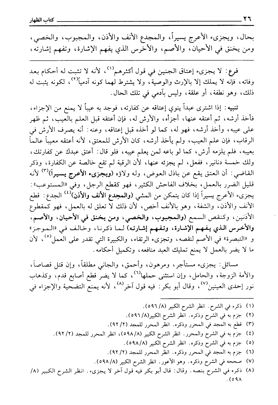 (وَيُجْزِئُ الْأَعْرَجُ يَسِيرًا) لِأَنَّهُ قَلِيلُ الضَّرَرِ بِالْعَمَلِ، بِخِلَافِ الْفَاحِشِ الْكَثِيرِ، فَهُوَ كَقَطْعِ الرِّجْلِ، وَفِي " الْمُسْتَوْعِبِ " يُجْزِئُ الْأَعْرَجُ يَسِيرًا إِذَا كَانَ يَتَمَكَّنُ مِنَ الْمَشْيِ. (وَالْمُجْدَعُ الْأَنْفِ وَالْأُذُنِ) الْجَدْعُ قَطْعُ الْأَنْفِ، وَالْأُذُنِ، وَالشَّفَةِ، وَهُوَ بِالْأَنْفِ أَخَصُّ ; لِأَنَّ ذَلِكَ لَا تَعَلُّقَ لَهُ بِالْعَمَلِ، فَهُوَ كَمَقْطُوعِ الْأُذُنَيْنِ وَكَنَقْصِ السَّمْعِ (وَالْمَجْبُوبِ، وَالْخَصِيِّ، وَمَنْ يُخْنَقُ فِي الْأَحْيَانِ، وَالْأَصَمُّ، وَالْأَخْرَسُ الَّذِي يَفْهَمُ الْإِشَارَةَ وَتُفْهَمُ إِشَارَتُهُ) لِمَا ذَكَرْنَا. وَخَالَفَ فِي " الْمُوجَزِ " وَ " التَّبْصِرَةِ " فِي الْأَصَمِّ لِنَقْصِهِ، وَتُجْزِئُ الرَّتْقَاءُ، وَالْكَبِيرَةُ الَّتِي تَقْدِرُ عَلَى الْعَمَلِ لِأَنَّ مَا لَا يَضُرُّ بِالْعَمَلِ لَا يَمْنَعُ تَمْلِيكَ الْعَبْدِ مَنَافِعَهُ وَتَكْمِيلَ أَحْكَامِهِ.