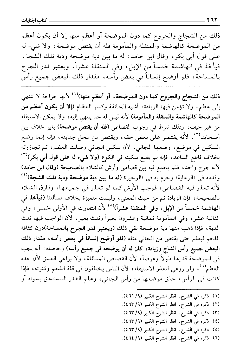 ذَلِكَ مِنَ الشِّجَاجِ، وَالْجُرُوحِ كَمَا دُونَ الْمُوضِحَةِ، أَوْ أَعْظَمِ مِنْهَا إِلَّا أَنْ يَكُونَ أَعْظَمَ مِنَ الْمُوضِحَةِ كَالْهَاشِمَةِ، وَالْمُنَقِّلَةِ، وَالْمَأْمُومَةِ فَلَهُ أَنْ يَقْتَصَّ مُوضِحَةً وَلَا شَيْءَ لَهُ عَلَى قَوْلِ أَبِي بَكْرٍ، وَقَالَ ابْنُ حَامِدٍ: لَهُ مَا بَيْنَ دِيَةِ مُوضِحَةٍ وَدِيَةِ تِلْكَ الشَّجَّةِ، فَيَأْخُذُ فِي الْهَاشِمَةِ خَمْسًا مِنَ الْإِبِلِ، وَفِي الْمُنَقِّلَةِ عَشْرًا وَيُعْتَبَرُ قَدْرُ الْجُرْحِ بِالْمِسَاحَةِ، فَلَوْ أَوْضَحَ إِنْسَانًا فِي بَعْضِ رَأْسِهِ، مِقْدَارُ ذَلِكَ الْبَعْضِ جَمِيعُ رَأْسِ
