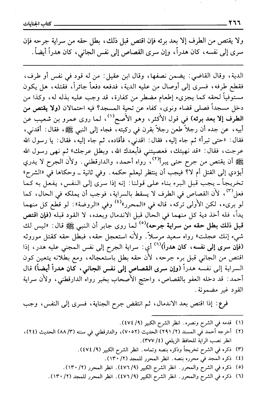 وَلَا يُقْتَصُّ مِنَ الطَّرَفِ إِلَّا بَعْدَ بُرْئِهِ. فَإِنِ اقْتَصَّ قَبْلَ ذَلِكَ بَطَلَ حَقُّهُ مِنْ سِرَايَةِ جُرْحِهِ، فَإِنْ سَرَى إِلَى نَفْسِهِ كَانَ هَدَرًا، وَإِنْ سَرَى الْقِصَاصُ إِلَى نَفْسِ الْجَانِي كَانَ هَدَرًا أَيْضًا.