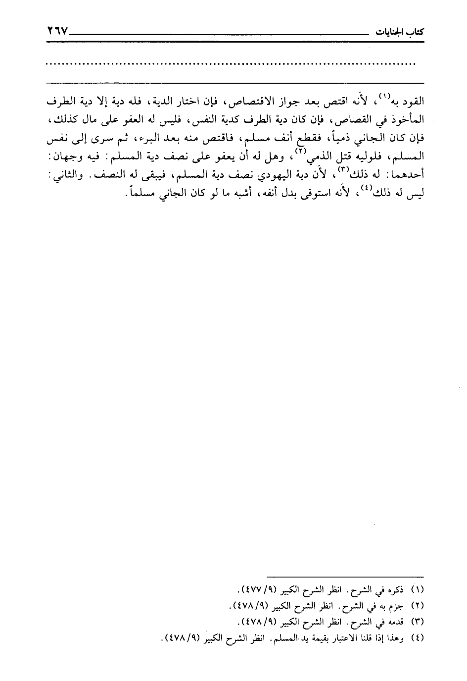 ـــــــــــــــــــــــــــــQالْقَوَدُ بِهِ ; لِأَنَّهُ اقْتَصَّ بَعْدَ جَوَازِ الِاقْتِصَاصِ، فَإِنِ اخْتَارَ الدِّيَةَ فَلَهُ دِيَةٌ إِلَّا دِيَةَ الطَّرَفِ الْمَأْخُوذِ فِي الْقِصَاصِ، فَإِنْ كَانَ دِيَةُ الطَّرَفِ كَدِيَةِ النَّفْسِ فَلَيْسَ لَهُ الْعَفْوُ عَلَى مَالٍ كَذَلِكَ، فَإِنْ كَانَ الْجَانِي ذِمِّيًّا، فَقَطَعَ أَنْفَ مُسْلِمٍ، فَاقْتَصَّ مِنْهُ بَعْدَ الْبُرْءِ، ثُمَّ سَرَى إِلَى نَفْسِ الْمُسْلِمِ، فَلِوَلِيِّهِ قَتْلُ الذِّمِّيِّ، وَهَلْ لَهُ أَنْ يَعْفُوَ عَلَى نِصْفِ دِيَةِ الْمُسْلِمِ؟ فِيهِ وَجْهَانِ: