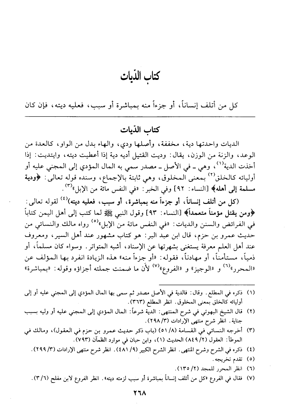 كِتَابُ الدِّيَاتِ. كُلُّ مَنْ أَتْلَفَ إِنْسَانًا، أَوْ جُزْءًا مِنْهُ بِمُبَاشَرَةٍ، أَوْ سَبَبٍ فَعَلَيْهِ دِيَتُهُ. فَإِنْ كَانَ