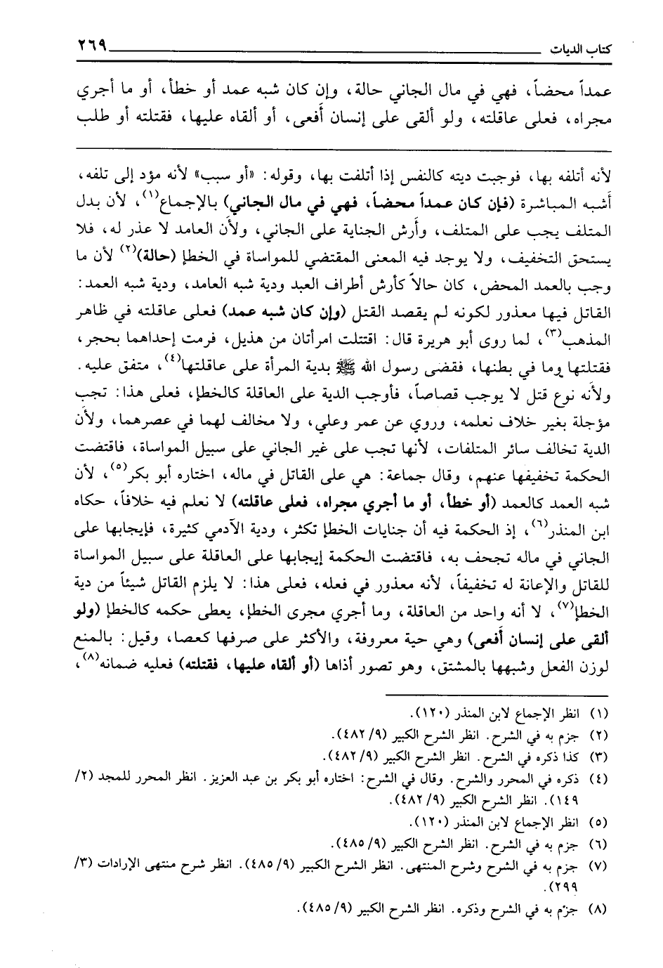ـــــــــــــــــــــــــــــQلِأَنَّهُ أَتْلَفَهُ بِهَا فَوَجَبَتْ دِيَتُهُ كَالنَّفْسِ إِذَا أُتْلِفَتْ بِهَا، وَقَوْلُهُ " أَوْ سَبَبٍ " ; لِأَنَّهُ مُؤَدٍّ إِلَى تَلَفِهِ، أَشْبَهَ الْمُبَاشَرَةَ (فَإِنْ كَانَ عَمْدًا مَحْضًا، فَهِيَ فِي مَالِ الْجَانِي) بِالْإِجْمَاعِ ; لِأَنَّ بَدَلَ الْمُتْلَفِ يَجِبُ عَلَى الْمُتْلِفِ، وَأَرْشُ الْجِنَايَةِ عَلَى الْجَانِي، وَلِأَنَّ الْعَامِدَ لَا عُذْرَ لَهُ، فَلَا يَسْتَحِقُّ التَّخْفِيفَ، وَلَا يُوجَدُ فِيهِ الْمَعْنَى الْمُقْتَضِي لِلْمُوَاسَاةِ فِي الْخَطَأِ (حَالَّةً) لِأَنَّ مَا وَجَبَ بِالْعَمْدِ الْمَحْضِ كَانَ حَالًّا كَأَرْشِ أَطْرَافِ الْعَبْدِ وَدِيَةِ شِبْهِ الْعَامِدِ، وَدِيَةُ شِبْهِ الْعَمْدِ الْقَاتِلُ فِيهَا مَعْذُورٌ لِكَوْنِهِ لَمْ يَقْصِدِ الْقَتْلَ (وَإِنْ كَانَ شِبْهَ عَمْدٍ) فَعَلَى عَاقِلَتِهِ فِي ظَاهِرِ الْمَذْهَبِ لِمَا رَوَى أَبُو هُرَيْرَةَ، قَالَ: «اقْتَتَلَتِ امْرَأَتَانِ مِنْ هُذَيْلٍ فَرَمَتْ إِحْدَاهُمَا بِحَجَرٍ فَقَتَلَتْهَا وَمَا فِي بَطْنِهَا، فَقَضَى رَسُولُ اللَّهِ - صَلَّى اللَّهُ عَلَيْهِ وَسَلَّمَ - بِدِيَةِ الْمَرْأَةِ عَلَى عَاقِلَتِهَا» مُتَّفَقٌ عَلَيْهِ، وَلِأَنَّهُ نَوْعُ قَتْلٍ لَا يُوجِبُ قِصَاصًا فَأَوْجَبَ الدِّيَةَ عَلَى الْعَاقِلَةِ كَالْخَطَأِ، فَعَلَى هَذَا تَجِبُ مُؤَجَّلَةً بِغَيْرِ خِلَافٍ نَعْلَمُهُ، وَرُوِيَ عَنْ عُمَرَ، وَعَلِيٍّ، وَلَا مُخَالِفَ لَهُمَا فِي عَصْرِهِمَا، وَلِأَنَّ الدِّيَةَ تُخَالِفُ سَائِرَ الْمُتْلَفَاتِ ; لِأَنَّهَا تَجِبُ عَلَى غَيْرِ الْجَانِي عَلَى سَبِيلِ الْمُوَاسَاةِ فَاقْتَضَتِ الْحِكْمَةُ تَخْفِيفَهَا عَنْهُمْ، وَقَالَ جَمَاعَةٌ: هِيَ عَلَى الْقَاتِلِ فِي مَالِهِ، اخْتَارَهُ أَبُو بَكْرٍ ; لِأَنَّ شِبْهَ الْعَمْدِ كَالْعَمْدِ (أَوْ خَطَأً، أَوْ مَا أُجْرِيَ مَجْرَاهُ، فَعَلَى عَاقِلَتِهِ) لَا نَعْلَمُ فِيهِ خِلَافًا حَكَاهُ ابْنُ الْمُنْذِرِ إِذِ الْحِكْمَةُ فِيهِ أَنَّ جِنَايَاتِ الْخَطَأِ تَكْثُرُ، وَدِيَةُ الْآدَمِيِّ كَثِيرَةٌ، فَإِيجَابُهَا عَلَى الْجَانِي فِي مَالِهِ تُجْحِفُ بِهِ، فَاقْتَضَتِ الْحِكْمَةُ إِيجَابَهَا عَلَى الْعَاقِلَةِ عَلَى سَبِيلِ الْمُوَاسَاةِ لِلْقَاتِلِ، وَالْإِعَانَةِ لَهُ تَخْفِيفًا ; لِأَنَّهُ مَعْذُورٌ فِي فِعْلِهِ، فَعَلَى هَذَا لَا يُلْزَمُ الْقَاتِلُ شَيْئًا مِنْ دِيَةِ الْخَطَأِ، لَا أَنَّهُ وَاحِدٌ مِنَ الْعَاقِلَةِ، وَمَا أُجْرِيَ مَجْرَى الْخَطَأِ يُعْطَى حُكْمَهُ كَالْخَطَأِ (وَلَوْ أَلْقَى عَلَى إِنْسَانٍ أَفْعَى) وَهُوَ حَيَّةٌ مَعْرُوفَةٌ، وَالْأَكْثَرُ عَلَى صَرْفِهَا كَعَصًا، وَقِيلَ: بِالْمَنْعِ لِوَزْنِ الْفِعْلِ وَشِبْهِهَا بِالْمُشْتَقِّ، وَهُوَ تَصَوُّرُ أَذَاهَا (أَوْ أَلْقَاهُ عَلَيْهَا فَقَتَلَتْهُ) فَعَلَيْهِ ضَمَانُهُ،