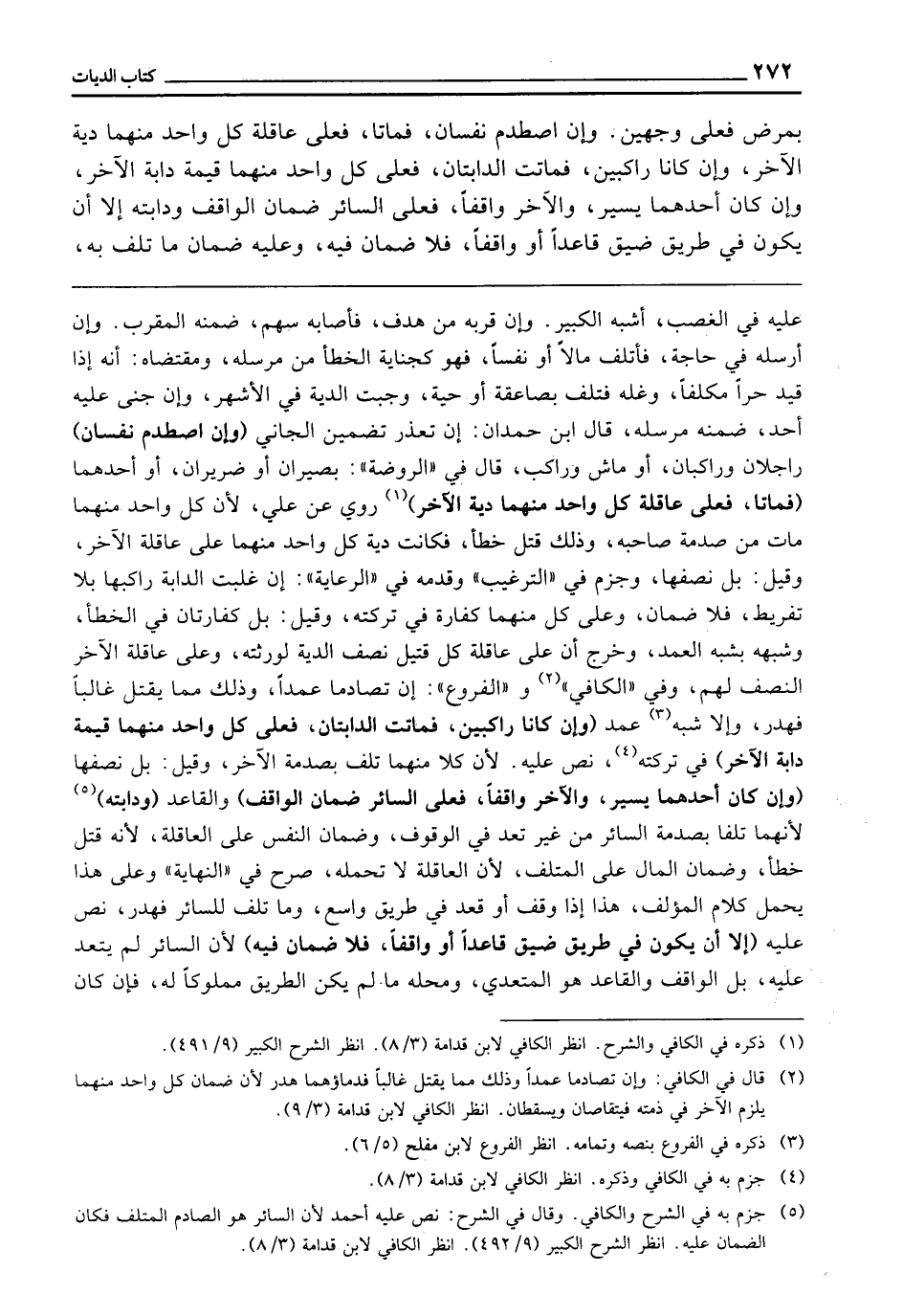 وَإِنِ اصْطَدَمَ نَفْسَانِ فَمَاتَا، فَعَلَى عَاقِلَةِ كُلِّ وَاحِدٍ مِنْهُمَا دِيَةُ الْآخَرِ، وَإِنْ كَانَا رَاكِبَيْنِ فَمَاتَتِ الدَّابَّتَانِ، فَعَلَى كُلِّ وَاحِدٍ مِنْهُمَا قِيمَةُ دَابَّةِ الْآخَرِ، وَإِنْ كَانَ أَحَدُهُمَا يَسِيرُ، وَالْآخَرُ وَاقِفًا فَعَلَى السَّائِرِ ضَمَانُ الْوَاقِفِ وَدَابَّتِهِ إِلَّا أَنْ يَكُونَ فِي طَرِيقٍ ضَيِّقٍ قَاعِدًا، أَوْ وَاقِفًا، فَلَا ضَمَانَ فِيهِ وَعَلَيْهِ ضَمَانُ مَا تَلِفَ بِهِ،