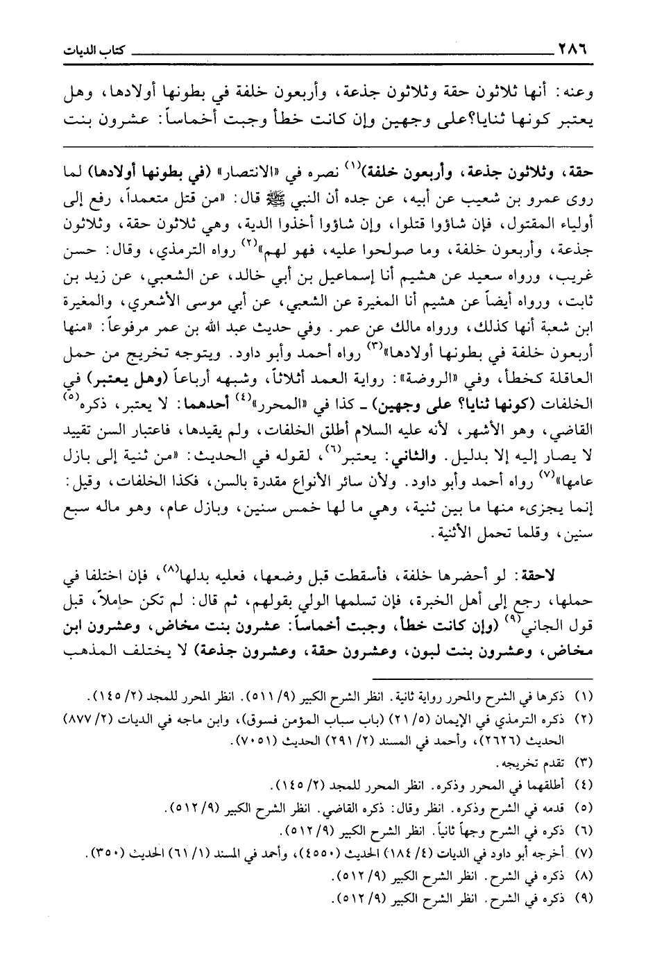 ـــــــــــــــــــــــــــــQحِقَّةً وَثَلَاثُونَ جَذَعَةً وَأَرْبَعُونَ خَلِفَةً) نَصَرَهُ فِي " الِانْتِصَارِ " (فِي بُطُونِهَا أَوْلَادُهَا) لِمَا رَوَى عَمْرُو بْنُ شُعَيْبٍ، عَنْ أَبِيهِ، عَنْ جَدِّهِ أَنَّ النَّبِيَّ - صَلَّى اللَّهُ عَلَيْهِ وَسَلَّمَ -، قَالَ: «مَنْ قَتَلَ مُتَعَمِّدًا رُفِعَ إِلَى أَوْلِيَاءِ الْمَقْتُولِ، فَإِنْ شَاءُوا قَتَلُوا، وَإِنْ شَاءُوا أَخَذُوا الدِّيَةَ، وَهِيَ ثَلَاثُونَ حِقَّةً وَثَلَاثُونَ جَذَعَةً وَأَرْبَعُونَ خَلِفَةً، وَمَا صُولِحُوا عَلَيْهِ فَهُوَ لَهُمْ» رَوَاهُ التِّرْمِذِيُّ، وَقَالَ: حَسَنٌ غَرِيبٌ، وَرَوَاهُ سَعِيدٌ عَنْ هُشَيْمٍ، أَنَا إِسْمَاعِيلُ بْنُ أَبِي خَالِدٍ، عَنِ الشَّعْبِيِّ، عَنْ زَيْدِ بْنِ ثَابِتٍ، وَرَوَاهُ أَيْضًا عَنْ هُشَيْمٍ، أَنَا الْمُغِيرَةُ، عَنِ الشَّعْبِيِّ، عَنْ أَبِي مُوسَى الْأَشْعَرِيِّ، وَالْمُغِيرَةِ بْنِ شُعْبَةَ أَنَّهَا كَذَلِكَ، وَرَوَاهُ مَالِكٌ عَنْ عُمَرَ، وَفِي حَدِيثِ عَبْدِ اللَّهِ بْنِ عُمَرَ مَرْفُوعًا: «مِنْهَا أَرْبَعُونَ خَلِفَةً فِي بُطُونِهَا أَوْلَادُهَا» رَوَاهُ أَحْمَدُ، وَأَبُو دَاوُدَ. وَيَتَوَجَّهُ تَخْرِيجُ مَنْ حَمَلَ الْعَاقِلَةِ كَخَطَأٍ، وَفِي " الرَّوْضَةِ " رِوَايَةُ الْعَمْدِ أَثْلَاثًا وَشِبْهِهِ أَرْبَاعًا (وَهَلْ يُعْتَبَرُ) فِي الْخَلِفَاتِ (كَوْنُهَا ثَنَايَا؟ عَلَى وَجْهَيْنِ) كَذَا فِي " الْمُحَرَّرِ " أَحَدُهُمَا لَا يُعْتَبَرُ، ذَكَرَهُ الْقَاضِي، وَهُوَ الْأَشْهَرُ ; لِأَنَّهُ - عَلَيْهِ السَّلَامُ - أَطْلَقَ الْخَلِفَاتِ، وَلَمْ يُقَيِّدْهَا فَاعْتِبَارُ السِّنِّ تَقْيِيدٌ، لَا يُصَارُ إِلَيْهِ بِدَلِيلٍ، وَالثَّانِي: يُعْتَبَرُ لِقَوْلِهِ فِي الْحَدِيثِ " مِنْ ثَنِيَّةٍ إِلَى بَازِلِ عَامِهَا " رَوَاهُ أَحْمَدُ، وَأَبُو دَاوُدَ، وَلِأَنَّ سَائِرَ الْأَنْوَاعِ مُقَدَّرَةٌ بِالسِّنِّ، فَكَذَا الْخَلِفَاتُ، وَقِيلَ: إِنَّمَا يُجْزِئُ مِنْهَا مَا بَيْنَ ثَنِيَّةٍ، وَهِيَ مَا لَهَا خَمْسُ سِنِينَ وَبَازِلِ عَامٍ، وَهُوَ مَا لَهُ سَبْعُ سِنِينَ، وَقَلَّمَا تَحْمِلُ الْأَثْنِيَةُ.