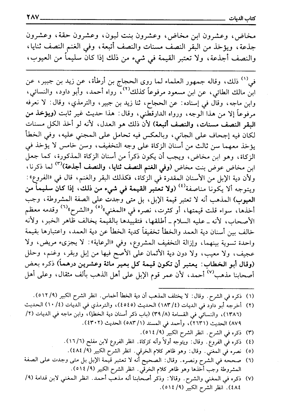 ـــــــــــــــــــــــــــــQفِي ذَلِكَ، وَقَالَهُ جُمْهُورُ الْعُلَمَاءِ لِمَا رَوَى الْحَجَّاجُ بْنُ أَرْطَأَةَ، عَنْ زَيْدِ بْنِ جُبَيْرٍ، عَنِ ابْنِ مَالِكٍ الطَّائِيِّ، عَنِ ابْنِ مَسْعُودٍ مَرْفُوعًا كَذَلِكَ، رَوَاهُ أَحْمَدُ، وَأَبُو دَاوُدَ، وَالنَّسَائِيُّ، وَابْنُ مَاجَهْ، وَقَالَ فِي إِسْنَادِهِ: عَنِ الْحَجَّاجِ، ثَنَا زَيْدُ بْنُ جُبَيْرٍ، وَالتِّرْمِذِيُّ، وَقَالَ: لَا نَعْرِفُهُ مَرْفُوعًا إِلَّا مِنْ هَذَا الْوَجْهِ، وَرَوَاهُ الدَّارَقُطْنِيُّ، وَقَالَ: هَذَا حَدِيثٌ غَيْرُ ثَابِتٍ (وَيُؤْخَذُ مِنَ الْبَقَرِ النِّصْفُ مُسِنَّاتٍ، وَالنِّصْفُ أَتْبِعَةً) لِأَنَّ ذَلِكَ هُوَ الْعَدْلُ ; لِأَنَّهُ لَوْ أَخَذَ الْكُلَّ مُسِنَّاتٍ لَكَانَ فِيهِ إِجْحَافٌ عَلَى الْجَانِي وَبِالْعَكْسِ فِيهِ تَحَامُلٌ عَلَى الْمَجْنِيِّ عَلَيْهِ، وَفِي الْخَطَأِ يُؤْخَذُ مَعَهُمَا سِنٌّ ثَالِثٌ مِنْ أَسْنَانِ الزَّكَاةِ عَلَى وَجْهِ التَّخْفِيفِ وَسِنٌّ خَامِسٌ لَا يُؤْخَذُ فِي الزَّكَاةِ، وَهُوَ ابْنُ مَخَاضٍ وَيَجِبُ أَنْ يَكُونَ ذَكَرًا مِنْ أَسْنَانِ الزَّكَاةِ الْمَذْكُورَةِ، كَمَا جُعِلَ ابْنُ مَخَاضٍ عِوَضَ بِنْتِ مَخَاضٍ (وَفِي الْغَنَمِ النِّصْفُ ثَنَايَا، وَالنِّصْفُ أَجْذِعَةً) لِمَا ذَكَرْنَا، وَلِأَنَّ دِيَةَ الْإِبِلِ مِنَ الْأَسْنَانِ الْمُقَدَّرَةِ فِي الزَّكَاةِ، فَكَذَلِكَ الْبَقَرُ وَالْغَنَمُ، قَالَ فِي " الْفُرُوعِ " وَيَتَوَجَّهُ أَلَّا يَكُونَا مُنَاصَفَةً (وَلَا تُعْتَبَرُ الْقِيمَةُ فِي شَيْءٍ مِنْ ذَلِكَ إِذَا كَانَ سَلِيمًا مِنَ الْعُيُوبِ) الْمَذْهَبُ: أَنَّهُ لَا تُعْتَبَرُ قِيمَةُ الْإِبِلِ، بَلْ مَتَى وُجِدَتْ عَلَى الصِّفَةِ الْمَشْرُوطَةِ وَجَبَ أَخْذُهَا، سَوَاءٌ قَلَّتْ قِيمَتُهَا، أَوْ كَثُرَتْ، نَصَرَهُ فِي " الْمُغْنِي "، وَ " الشَّرْحِ "، وَقَدَّمَهُ مُعْظَمُ الْأَصْحَابِ ; لِأَنَّهُ - عَلَيْهِ السَّلَامُ - أَطْلَقَهَا، فَتَقْيِيدُهَا بِالْقِيمَةِ يُخَالِفُ ظَاهِرَ الْخَبَرِ، وَلِأَنَّهُ خَالَفَ بَيْنَ أَسْنَانِ دِيَةِ الْعَمْدِ وَالْخَطَأِ تَخْفِيفًا كَدِيَةِ الْخَطَأِ عَنْ دِيَةِ الْعَمْدِ، وَاعْتِبَارُهَا بِقِيمَةٍ وَاحِدَةٍ تَسْوِيَةٌ بَيْنَهُمَا، وَإِزَالَةُ التَّخْفِيفِ الْمَشْرُوعِ، وَفِي " الرِّعَايَةِ " لَا يُجْزِئُ مَرِيضٌ، وَلَا عَجِيفٌ، وَلَا مَعِيبٌ، وَلَا دُونَ دِيَةِ الْأَثْمَانِ عَلَى الْأَصَحِّ فِيهَا مِنْ إِبِلٍ وَبَقَرٍ وَغَنَمٍ وَحُلَلٍ (وَقَالَ أَبُو الْخَطَّابِ: يُعْتَبَرُ أَنْ تَكُونَ قِيمَةُ كُلِّ بَعِيرٍ مِائَةً وَعِشْرِينَ دِرْهَمًا) ذَكَرَهُ بَعْضُ أَصْحَابِنَا مَذْهَبُ أَحْمَدَ ; لِأَنَّ عُمَرَ قَوَّمَ الْإِبِلَ عَلَى أَهْلِ الذَّهَبِ بِأَلْفِ مِثْقَالٍ، وَعَلَى أَهْلِ