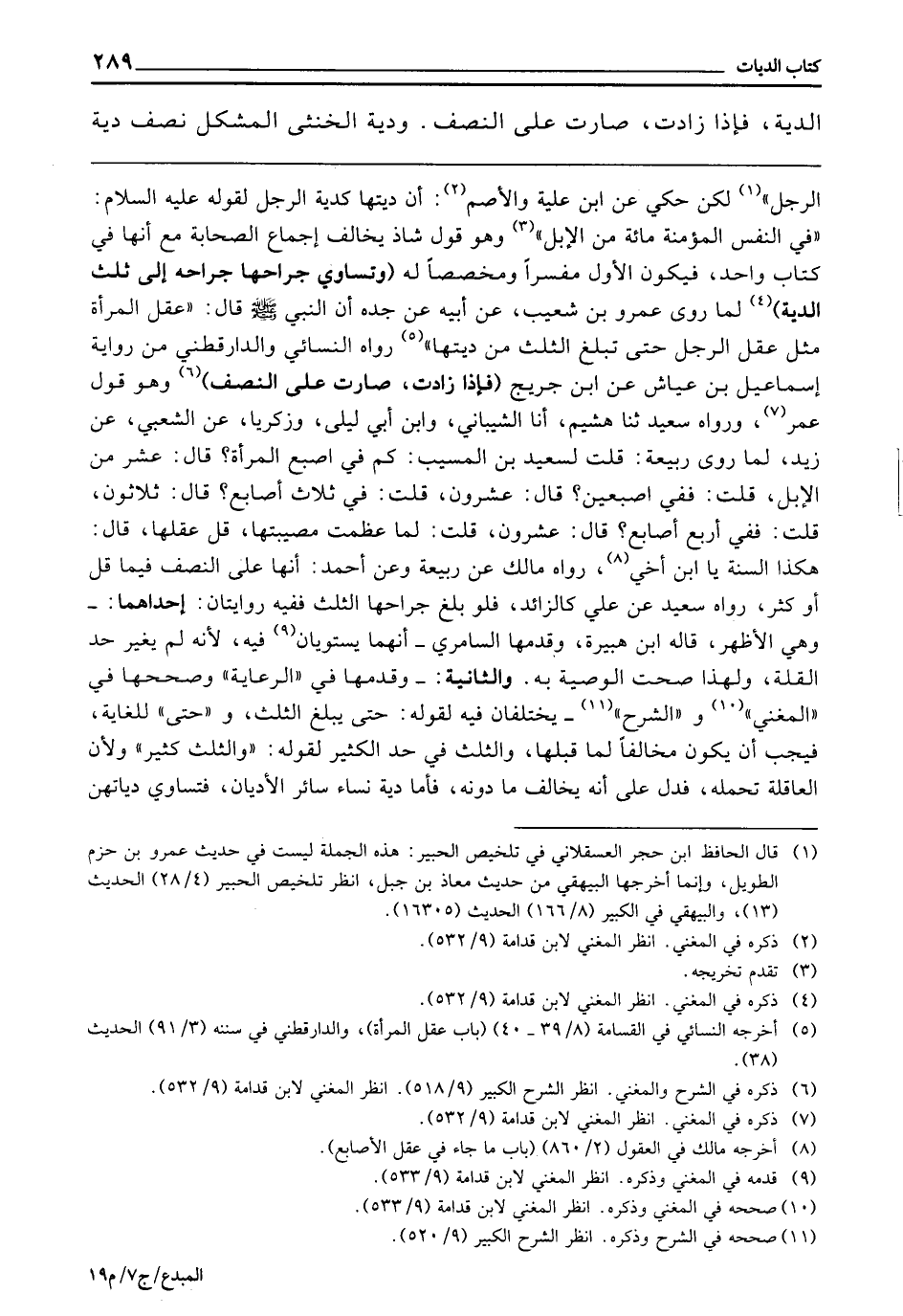 ـــــــــــــــــــــــــــــQالرَّجُلِ» لَكِنْ حُكِيَ عَنِ ابْنِ عُلَيَّةَ، وَالْأَصَمِّ: أَنَّ دِيَتَهَا كَدِيَةِ الرَّجُلِ لِقَوْلِهِ - عَلَيْهِ السَّلَامُ -: «فِي النَّفْسِ الْمُؤْمِنَةِ مِائَةٌ مِنَ الْإِبِلِ» وَهُوَ قَوْلٌ شَاذٌّ يُخَالِفُ إِجْمَاعَ الصَّحَابَةِ مَعَ أَنَّهُمَا فِي كِتَابٍ وَاحِدٍ، فَيَكُونُ الْأَوَّلُ مُفَسِّرًا وَمُخَصِّصًا لَهُ (وَتُسَاوِي جِرَاحُهَا جِرَاحَهُ إِلَى ثُلُثِ الدِّيَةِ) لِمَا رَوَى عَمْرُو بْنُ شُعَيْبٍ، عَنْ أَبِيهِ، عَنْ جَدِّهِ أَنَّ النَّبِيَّ - صَلَّى اللَّهُ عَلَيْهِ وَسَلَّمَ -، قَالَ: «عَقْلُ الْمَرْأَةِ مِثْلُ عَقْلِ الرَّجُلِ حَتَّى تَبْلُغَ الثُّلُثَ مِنْ دِيَتِهَا» رَوَاهُ النَّسَائِيُّ، وَالدَّارَقُطْنِيُّ مِنْ رِوَايَةِ إِسْمَاعِيلَ بْنِ عَيَّاشٍ، عَنِ ابْنِ جُرَيْجٍ (فَإِذَا زَادَتْ صَارَتْ عَلَى النِّصْفِ) وَهُوَ قَوْلُ عُمَرَ، وَرَوَاهُ سَعِيدٌ، ثَنَا هُشَيْمٌ، أَنَا الشَّيْبَانِيُّ، وَابْنُ أَبِي لَيْلَى، وَزَكَرِيَّا، عَنِ الشَّعْبِيِّ، عَنْ زَيْدٍ لِمَا رَوَى رَبِيعَةُ، قُلْتُ لِسَعِيدِ بْنِ الْمُسَيَّبِ: كَمْ فِي إِصْبَعِ الْمَرْأَةِ؟ قَالَ: عَشْرٌ مِنَ الْإِبِلِ، قُلْتُ: فَفِي إِصْبَعَيْنِ؟ قَالَ: عِشْرُونَ، قُلْتُ: فِي ثَلَاثِ أَصَابِعَ؟ قَالَ: ثَلَاثُونَ، قُلْتُ: فَفِي أَرْبَعِ أَصَابِعَ؟ قَالَ: عِشْرُونَ، قُلْتُ: لَمَّا عَظُمَتْ مُصِيبَتُهَا قَلَّ عَقْلُهَا؟ ! ، قَالَ: هَكَذَا السُّنَّةُ يَا ابْنَ أَخِي. رَوَاهُ مَالِكٌ، عَنْ رَبِيعَةَ، وَعَنْ أَحْمَدَ: أَنَّهَا عَلَى النِّصْفِ فِيمَا قَلَّ أَوْ كَثُرَ. رَوَاهُ سَعِيدٌ، عَنْ عَلِيٍّ كَالزَّائِدِ، فَلَوْ بَلَغَ جِرَاحُهَا الثُّلُثَ فَفِيهِ رِوَايَتَانِ: إِحْدَاهُمَا: وَهِيَ الْأَظْهَرُ، قَالَهُ ابْنُ هُبَيْرَةَ، وَقَدَّمَهَا السَّامِرِيُّ - أَنَّهُمَا يَسْتَوِيَانِ فِيهِ ; لِأَنَّهُ لَمْ يُغَيِّرْ حَدَّ الْقِلَّةِ، وَلِهَذَا صَحَّتِ الْوَصِيَّةُ بِهِ.