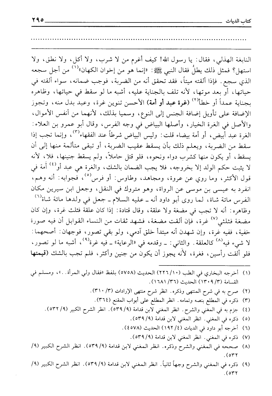 ـــــــــــــــــــــــــــــQالنَّابِغَةِ الْهُذَلِيُّ، فَقَالَ: يَا رَسُولَ اللَّهِ كَيْفَ أَغْرَمُ مَنْ لَا شَرِبَ وَلَا أَكَلْ، وَلَا نَطَقَ وَلَا اسْتَهَلْ، فَمِثْلُ ذَلِكَ يُطَلْ؟ ! ، فَقَالَ النَّبِيُّ - صَلَّى اللَّهُ عَلَيْهِ وَسَلَّمَ -: إِنَّمَا هُوَ مِنْ إِخْوَانِ الْكُهَّانِ» مِنْ أَجْلِ سَجْعِهِ الَّذِي سَجَعَ. فَإِذَا أَلْقَتْهُ مَيِّتًا فَقَدْ تَحَقَّقَ أَنَّهُ مِنَ الضَّرْبَةِ فَوَجَبَ ضَمَانُهُ، سَوَاءٌ أَلْقَتْهُ فِي حَيَاتِهَا، أَوْ بَعْدَ مَوْتِهَا ; لِأَنَّهُ تَلِفَ بِالْجِنَايَةِ عَلَيْهِ، أَشْبَهَ مَا لَوْ سَقَطَ فِي حَيَاتِهَا، وَظَاهِرُهُ بِجِنَايَةٍ عَمْدًا، أَوْ خَطَأً (غُرَّةُ عَبْدٍ، أَوْ أَمَةٌ) الْأَحْسَنُ تَنْوِينُ غُرَّةٍ، وَعَبْدٌ بَدَلٌ مِنْهُ، وَتَجُوزُ الْإِضَافَةُ عَلَى تَأْوِيلِ إِضَافَةِ الْجِنْسِ إِلَى النَّوْعِ، وَسُمِّيَا بِذَلِكَ ; لِأَنَّهُمَا مِنْ أَنْفَسِ الْأَمْوَالِ، وَالْأَصْلُ فِي الْغُرَّةِ الْخِيَارُ، وَأَصْلُهَا الْبَيَاضُ فِي وَجْهِ الْفَرَسِ، وَقَالَ أَبُو عَمْرِو بْنُ الْعَلَاءِ: الْغُرَّةُ: عَبْدٌ أَبْيَضُ، أَوْ أَمَةٌ بَيْضَاءُ، قُلْتُ: وَلَيْسَ الْبَيَاضُ شَرْطًا عِنْدَ الْفُقَهَاءِ، وَإِنَّمَا تَجِبُ إِذَا سَقَطَ مِنَ الضَّرْبَةِ، وَيُعْلَمُ ذَلِكَ بِأَنْ يَسْقُطَ عُقَيْبَ الضَّرْبَةِ، أَوْ تَبْقَى مُتَأَلِّمَةً مِنْهَا إِلَى أَنْ يَسْقُطَ، أَوْ يَكُونَ مِنْهَا كَشُرْبِ دَوَاءٍ، وَنَحْوِهِ، فَلَوْ قَتَلَ حَامِلًا، وَلَمْ يَسْقُطْ جَنِينُهَا فَلَا ; لِأَنَّهُ لَا يَثْبُتُ حُكْمُ الْوَلَدِ إِلَّا بِخُرُوجِهِ، فَلَا يَجِبُ الضَّمَانُ بِالشَّكِّ، وَالْغُرَّةُ هِيَ عَبْدٌ، أَوْ أَمَةٌ فِي قَوْلِ الْأَكْثَرِ، وَمَا رُوِيَ عَنْ عُرْوَةَ، وَمُجَاهِدٍ، وَطَاوُسٍ: أَوْ فَرَسٌ. فَجَوَابُهُ أَنَّهُ وَهْمٌ انْفَرَدَ بِهِ عِيسَى بْنُ مُوسَى عَنِ الرُّوَاةِ، وَهُوَ مَتْرُوكٌ فِي النَّقْلِ وَجَعَلَ ابْنُ سِيرِينَ مَكَانَ الْفَرَسِ مِائَةَ شَاةٍ لِمَا رَوَى أَبُو دَاوُدَ أَنَّهُ - عَلَيْهِ السَّلَامُ - جَعَلَ فِي وَلَدِهَا مِائَةَ شَاةٍ، وَظَاهِرُهُ: أَنَّهُ لَا تَجِبُ فِي مُضْغَةٍ، وَلَا عَلَقَةٍ، وَقَالَ قَتَادَةُ: إِذَا كَانَ عَلَقَةً فَثُلُثُ غُرَّةٍ، وَإِنْ كَانَ مُضْغَةً فَثُلُثَيْ غُرَّةٍ، فَإِنْ أَلْقَتْ مُضْغَةً فَشَهِدَ ثِقَاتٌ مِنَ النِّسَاءِ الْقَوَابِلِ أَنَّ فِيهِ صُورَةً خَفِيَّةً فَفِيهِ غُرَّةٌ، وَإِنْ شَهِدْنَ أَنَّهُ مُبْتَدَأُ خَلْقِ آدَمِيٍّ، وَلَوْ بَقِيَ تَصَوُّرٌ فَوَجْهَانِ: أَصَحُّهُمَا: لَا شَيْءَ فِيهِ كَالْعَلَقَةِ، وَالثَّانِي: وَقَدَّمَهُ فِي " الرِّعَايَةِ " فِيهِ غُرَّةٌ، أَشْبَهَ مَا لَوْ تَصَوَّرَ، فَلَوْ أَلْقَتْ رَأْسَيْنِ فَغُرَّةٌ ; لِأَنَّهُ يَجُوزُ أَنْ يَكُونَ مِنْ جَنِينٍ وَأَكْثَرَ، فَلَمْ تَجِبْ بِالشَّكِّ (قِيمَتُهَا