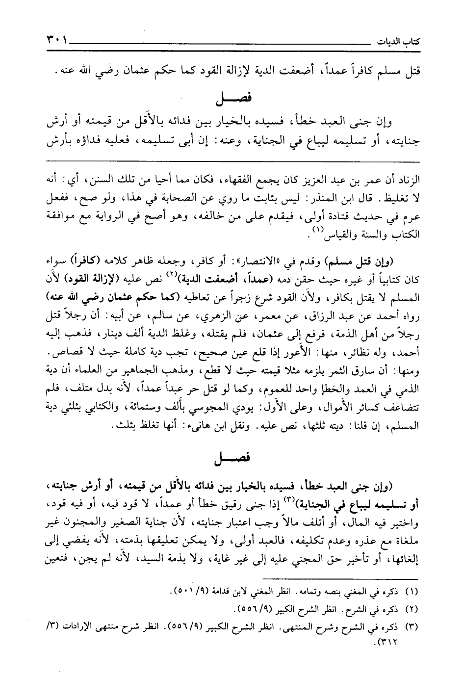 (وَإِنْ قَتَلَ مُسْلِمٌ) وَقَدَّمَ فِي " الِانْتِصَارِ ": أَوْ كَافِرٌ، وَجَعَلَهُ ظَاهِرَ كَلَامِهِ (كَافِرًا) سَوَاءٌ كَانَ كِتَابِيًّا، أَوْ غَيْرَهُ حَيْثُ حُقِنَ دَمُهُ (عَمْدًا أُضْعِفَتِ الدِّيَةُ) نَصَّ عَلَيْهِ (لِإِزَالَةِ الْقَوَدِ) لِأَنَّ الْمُسْلِمَ لَا يُقْتَلُ بِكَافِرٍ، وَلِأَنَّ الْقَوَدَ شُرِعَ زَجْرًا عَنْ تَعَاطِيهِ (كَمَا حَكَمَ عُثْمَانُ - رَضِيَ اللَّهُ عَنْهُ -) رَوَاهُ أَحْمَدُ عَنْ عَبْدِ الرَّزَّاقِ، عَنْ مَعْمَرٍ، عَنِ الزُّهْرِيِّ، عَنْ سَالِمٍ، عَنْ أَبِيهِ أَنَّ رَجُلًا قَتَلَ رَجُلًا مِنْ أَهْلِ الذِّمَّةِ فَرُفِعَ إِلَى عُثْمَانَ، فَلَمْ يَقْتُلْهُ وَغَلَّظَ الدِّيَةَ أَلْفَ دِينَارٍ فَذَهَبَ إِلَيْهِ أَحْمَدُ، وَلَهُ نَظَائِرُ، مِنْهَا الْأَعْوَرُ إِذَا قَلَعَ عَيْنَ صَحِيحٍ تَجِبُ دِيَةٌ كَامِلَةٌ حَيْثُ لَا قِصَاصَ، وَمِنْهَا أَنَّ سَارِقَ الثَّمَرِ يَلْزَمُهُ مَثَلًا قِيمَتُهُ حَيْثُ لَا قَطْعَ، وَمَذْهَبُ الْجَمَاهِيرِ مِنَ الْعُلَمَاءِ أَنَّ دِيَةَ الذِّمِّيِّ فِي الْعَمْدِ، وَالْخَطَأِ وَاحِدٌ لِلْعُمُومِ، وَكَمَا لَوْ قَتَلَ حُرٌّ عَبْدًا عَمْدًا ; لِأَنَّهُ بَدَلُ مُتْلَفٍ، فَلَمْ تَتَضَاعَفْ كَسَائِرِ الْأَمْوَالِ، وَعَلَى الْأَوَّلِ يُودَى الْمَجُوسِيُّ بِأَلْفٍ وَسِتِّمِائَةٍ، وَالْكِتَابِيُّ بِثُلُثَيْ دِيَةِ الْمُسْلِمِ إِنْ قُلْنَا: دِيَتُهُ ثُلُثُهَا. نَصَّ عَلَيْهِ، وَنَقَلَ ابْنُ هَانِئٍ أَنَّهَا تُغَلَّظُ بِثُلُثٍ.