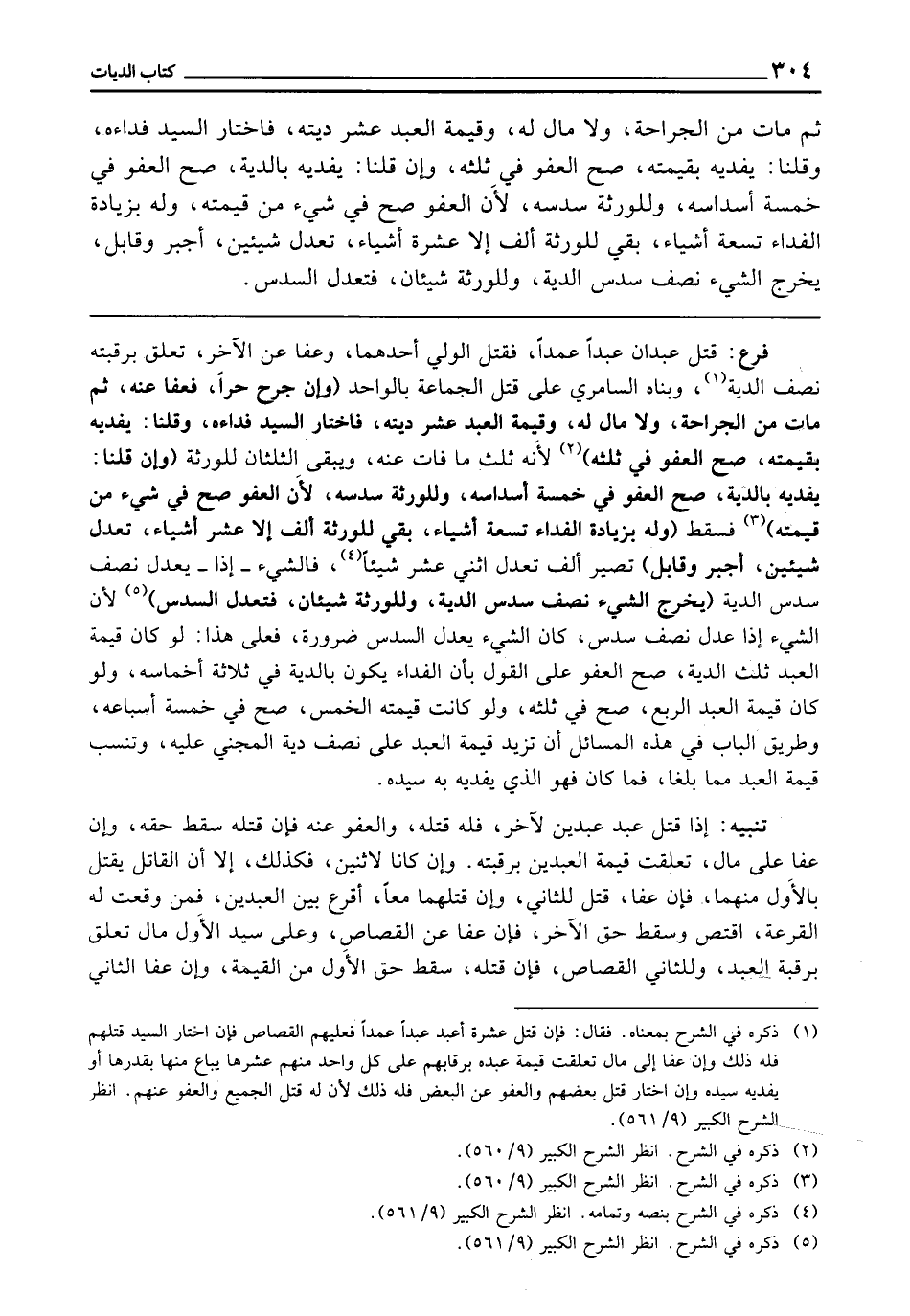 ـــــــــــــــــــــــــــــQفَرْعٌ: قَتَلَ عَبْدَانِ عَبْدًا عَمْدًا فَقَتَلَ الْوَلِيُّ أَحَدَهُمَا وَعَفَا عَنِ الْآخَرِ، تَعَلَّقَ بِرَقَبَتِهِ نِصْفُ الدِّيَةِ، وَبَنَاهُ السَّامِرِيُّ عَلَى قَتْلِ الْجَمَاعَةِ بِالْوَاحِدِ. (وَإِنْ جَرَحَ حُرًّا فَعَفَا عَنْهُ، ثُمَّ مَاتَ مِنَ الْجِرَاحَةِ، وَلَا مَالَ لَهُ، وَقِيمَةُ الْعَبْدِ عُشْرُ دِيَتِهِ فَاخْتَارَ السَّيِّدُ فِدَاءَهُ، وَقُلْنَا يَفْدِيهِ بِقِيمَتِهِ - صَحَّ الْعَفْوُ فِي ثُلُثِهِ) لِأَنَّهُ ثُلُثُ مَا فَاتَ عَنْهُ وَيَبْقَى الثُّلُثَانِ لِلْوَرَثَةِ (وَإِنْ قُلْنَا: يَفْدِيهِ بِالدِّيَةِ صَحَّ الْعَفْوُ فِي خَمْسَةِ أَسْدَاسِهِ، وَلِلْوَرَثَةِ سُدُسُهُ ; لِأَنَّ الْعَفْوَ صَحَّ فِي شَيْءٍ مِنْ قِيمَتِهِ) فَسَقَطَ (وَلَهُ بِزِيَادَةِ الْفِدَاءِ تِسْعَةُ أَشْيَاءٍ، بَقِيَ لِلْوَرَثَةِ أَلْفٌ إِلَّا عَشْرَةَ أَشْيَاءٍ، تَعْدِلُ شَيْئَيْنِ: أَجْبَرَ، وَقَابَلَ) تَصِيرُ أَلْفًا تَعْدِلُ اثْنَيْ عَشَرَ شَيْئًا، فَالشَّيْءُ إِذًا يَعْدِلُ نِصْفَ سُدُسِ الدِّيَةِ (يَخْرُجُ الشَّيْءُ نِصْفَ سُدُسِ الدِّيَةِ وَلِلْوَرَثَةِ شَيْئَانِ فَتَعْدِلُ السُّدُسَ) لِأَنَّ الشَّيْءَ إِذَا عَدَلَ نِصْفَ سُدُسٍ كَانَ الشَّيْءُ يَعْدِلُ السُّدُسَ ضَرُورَةً، فَعَلَى هَذَا لَوْ كَانَ قِيمَةُ الْعَبْدِ ثُلُثُ الدِّيَةِ صَحَّ الْعَفْوُ عَلَى الْقَوْلِ بِأَنَّ الْفِدَاءَ يَكُونُ بِالدِّيَةِ فِي ثَلَاثَةِ أَخْمَاسِهِ، وَلَوْ كَانَ قِيمَةُ الْعَبْدِ الرُّبُعَ صَحَّ فِي ثُلُثِهِ، وَلَوْ كَانَتْ قِيمَتُهُ الْخَمُسَ صَحَّ فِي خَمْسَةِ أَسْبَاعِهِ، وَطَرِيقُ الْبَابِ فِي هَذِهِ الْمَسَائِلِ أَنْ تَزِيدَ قِيمَةُ الْعَبْدِ عَلَى نِصْفِ دِيَةِ الْمَجْنِيِّ عَلَيْهِ وَتُنْسَبُ قِيمَةُ الْعَبْدِ مِمَّا بَلَغَا فَمَا كَانَ فَهُوَ الَّذِي يَفْدِيهِ بِهِ سَيِّدُهُ.