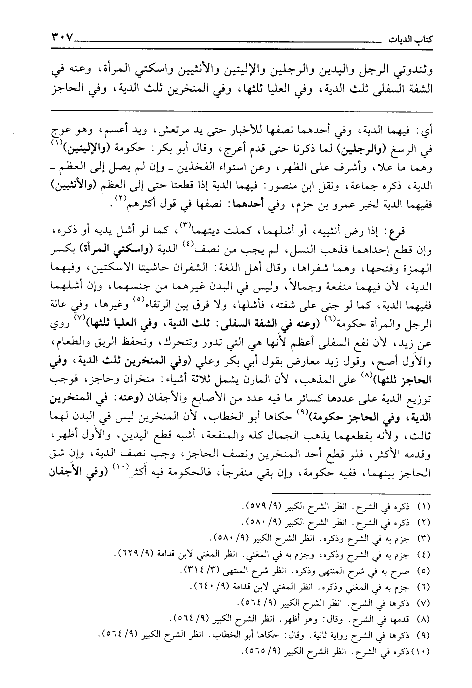 وَثَنْدُوَتَيِ الرَّجُلِ وَالْيَدَيْنِ وَالرِّجْلَيْنِ وَالْإِلْيَتَيْنِ وَالْأُنْثَيَيْنِ وَإِسْكَتَيِ الْمَرْأَةِ، وَعَنْهُ: فِي الشَّفَةِ السُّفْلَى ثُلُثَا الدِّيَةِ، وَفِي الْعُلْيَا ثُلُثُهَا، وَفِي الْمَنْخَرَيْنِ ثُلُثَا الدِّيَةِ، وَفِي الْحَاجِزِ