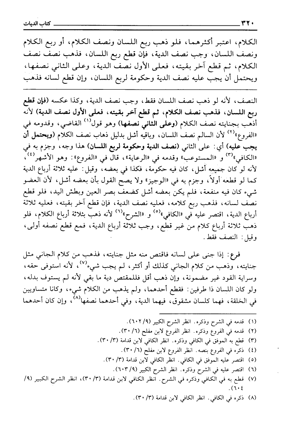 ـــــــــــــــــــــــــــــQالنِّصْفُ ; لِأَنَّهُ لَوْ ذَهَبَ نِصْفُ اللِّسَانِ فَقَطْ وَجَبَ نِصْفُ الدِّيَةِ، وَكَذَا عَكْسُهُ (فَإِنْ قَطَعَ رُبُعَ اللِّسَانِ فَذَهَبَ نِصْفُ الْكَلَامِ، ثُمَّ قَطَعَ آخَرُ بَقِيَّتَهُ، فَعَلَى الْأَوَّلِ نِصْفُ الدِّيَةِ) لِأَنَّهُ أَذْهَبَ بِجِنَايَتِهِ نِصْفَ الْكَلَامِ (وَعَلَى الثَّانِي نِصْفُهَا) وَهُوَ قَوْلُ الْقَاضِي، وَقَدَّمَهُ فِي " الْفُرُوعِ " ; لِأَنَّ السَّالِمَ نِصْفُ اللِّسَانِ، وَبَاقِيهِ أَشَلُّ بِدَلِيلِ ذَهَابِ نِصْفِ الْكَلَامِ (وَيُحْتَمَلُ أَنْ يَجِبَ عَلَيْهِ) أَيْ: عَلَى الثَّانِي (نِصْفُ الدِّيَةِ، وَحُكُومَةٌ لِرُبُعِ اللِّسَانِ) هَذَا وَجْهٌ، وَجَزَمَ بِهِ فِي " الْكَافِي "، وَ " الْمُسْتَوْعِبِ "، وَقَدَّمَهُ فِي " الرِّعَايَةِ "، قَالَ فِي " الْفُرُوعِ ": وَهُوَ الْأَشْهَرُ ; لِأَنَّهُ لَوْ كَانَ جَمِيعُهُ أَشَلَّ كَانَ فِيهِ حُكُومَةٌ، فَكَذَا فِي بَعْضِهِ، وَقِيلَ: عَلَيْهِ ثَلَاثَةُ أَرْبَاعِ الدِّيَةِ كَمَا لَوْ قَطَعَهُ أَوَّلًا، وَجَزَمَ بِهِ فِي " الْوَجِيزِ "، وَلَا يَصِحُّ الْقَوْلُ بِأَنَّ بَعْضَهُ أَشَلُّ ; لِأَنَّ الْعُضْوَ شَيْءٌ كَانَ فِيهِ مَنْفَعَةٌ، فَلَمْ يَكُنْ بَعْضُهُ أَشَلَّ كَضَعْفِ بَصَرِ الْعَيْنِ وَبَطْشِ الْيَدِ، فَلَوْ قَطَعَ نِصْفَ لِسَانِهِ فَذَهَبَ رُبُعُ كَلَامِهِ فَعَلَيْهِ نِصْفُ الدِّيَةِ، فَإِنْ قَطَعَ آخَرُ بَقِيَّتَهُ فَعَلَيْهِ ثَلَاثَةُ أَرْبَاعِ الدِّيَةِ، اقْتَصَرَ عَلَيْهِ فِي " الْكَافِي "، وَ " الشَّرْحِ " ; لِأَنَّهُ ذَهَبَ بِثَلَاثَةِ أَرْبَاعِ الْكَلَامِ، فَلَوْ ذَهَبَ ثَلَاثَةُ أَرْبَاعِ كَلَامٍ مِنْ غَيْرِ قَطْعٍ وَجَبَ ثَلَاثَةُ أَرْبَاعِ الدِّيَةِ، فَمَعَ قَطْعِ نِصْفِهِ أَوْلَى، وَقِيلَ: النِّصْفُ فَقَطْ.