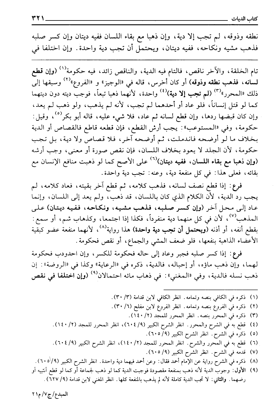 ـــــــــــــــــــــــــــــQتَامَّ الْخِلْقَةِ، وَالْآخَرُ نَاقِصٌ، فَالتَّامُّ فِيهِ الدِّيَةُ، وَالنَّاقِصُ زَائِدٌ، فِيهِ حُكُومَةٌ (وَإِنْ قَطَعَ لِسَانَهُ فَذَهَبَ نُطْقُهُ وَذَوْقُهُ) أَوْ كَانَ أَخْرَسَ، قَالَهُ فِي " الْوَجِيزِ "، وَ " الْفُرُوعِ " وَسَبَقَهُمَا إِلَى ذَلِكَ " الْمُحَرَّرُ " (لَمْ تَجِبْ إِلَّا دِيَةً) وَاحِدَةً ; لِأَنَّهُمَا ذَهَبَا تَبَعًا فَوَجَبَ دِيَتُهُ دُونَ دِيَتِهِمَا كَمَا لَوْ قَتَلَ إِنْسَانًا، فَلَوْ عَادَ أَوْ أَحَدُهُمَا لَمْ تَجِبْ ; لِأَنَّهُ لَمْ يَذْهَبْ، وَلَوْ ذَهَبَ لَمْ يَعُدْ، وَإِنْ كَانَ قَبَضَهَا رَدَّهَا، وَإِنْ قَطَعَ لِسَانَهُ، ثُمَّ عَادَ، فَلَا شَيْءَ عَلَيْهِ، قَالَهُ أَبُو بَكْرٍ، وَقِيلَ: حُكُومَةٌ، وَفِي " الْمُسْتَوْعِبِ " يَجِبُ أَرْشُ الْقَطْعِ، فَإِنْ قَطَعَهُ قَاطِعٌ فَالْقِصَاصُ أَوِ الدِّيَةُ، بِخِلَافِ مَا لَوْ أَوْضَحَهُ، فَانْدَمَلَتْ، ثُمَّ أَوْضَحَهُ آخَرُ، فَلَا قِصَاصَ وَلَا دِيَةَ، بَلْ تَجِبُ حُكُومَةٌ ; لِأَنَّ الْجِلْدَ لَا يَعُودُ، بِخِلَافِ اللِّسَانِ، فَإِنْ نَقَصَ صُورَةً أَوْ مَعْنًى وَجَبَ أَرْشُهُ (وَإِنْ ذَهَبَا مَعَ بَقَاءِ اللِّسَانِ فَفِيهِ دِيَتَانِ) عَلَى الْأَصَحِّ كَمَا لَوْ ذَهَبَتْ مَنَافِعُ الْإِنْسَانِ مَعَ بَقَائِهِ، فَعَلَى هَذَا فِي كُلِّ مَنْفَعَةٍ دِيَةٌ، وَعَنْهُ: تَجِبُ دِيَةٌ وَاحِدَةٌ.