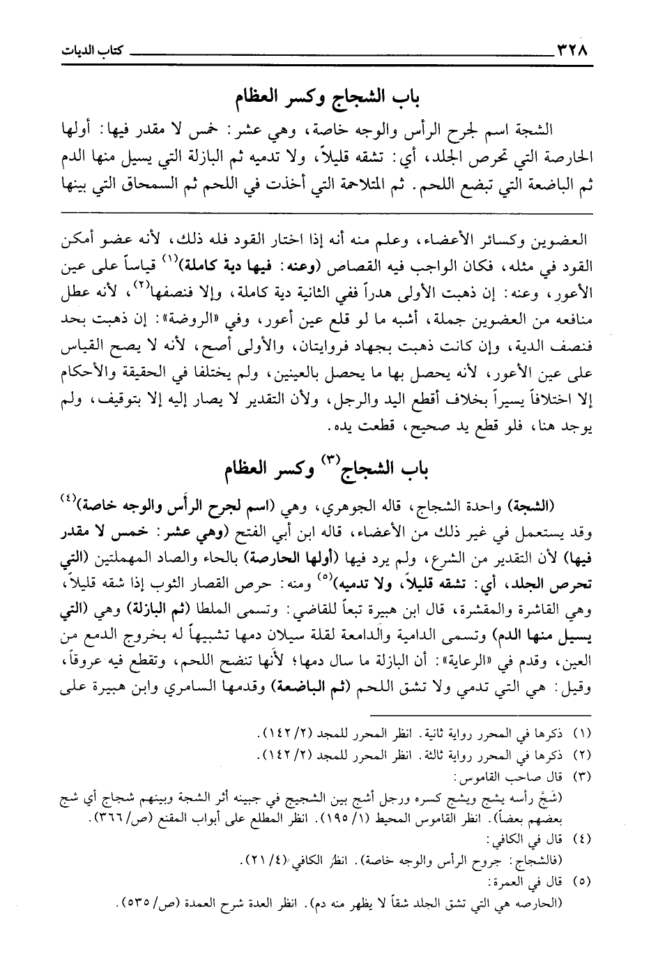 بَابُ الشِّجَاجِ وَكَسْرِ الْعِظَامِ، الشَّجَّةُ اسْمٌ لِجُرْحِ الرَّأْسِ وَالْوَجْهِ خَاصَّةً، وَهِيَ عَشْرٌ، خَمْسٌ لَا مِقْدَارَ فِيهَا، أَوَّلُهَا: الْحَارِصَةُ الَّتِي تَحْرِصُ الْجِلْدَ، أَيْ: تَشُقُّهُ قَلِيلًا وَلَا تُدْمِيهِ، ثُمَّ الْبَازِلَةُ الَّتِي يَسِيلُ مِنْهَا الدَّمُ، ثُمَّ الْبَاضِعَةُ الَّتِي تَبْضَعُ اللَّحْمَ، ثُمَّ الْمُتَلَاحِمَةُ الَّتِي أَخَذَتْ فِي اللَّحْمِ، ثُمَّ السِّمْحَاقُ الَّتِي بَيْنَهَا