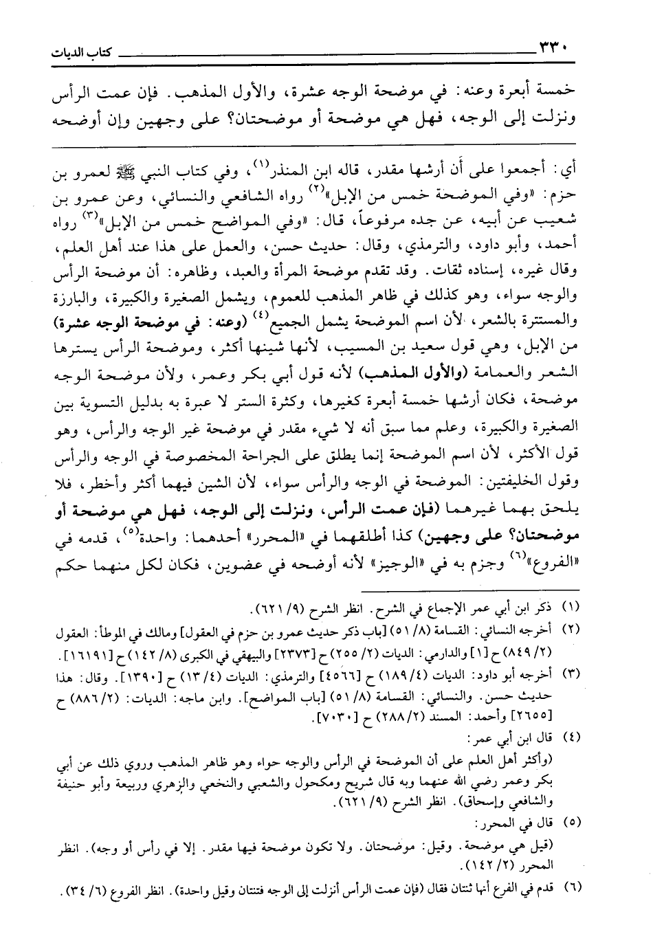 وَقَدْ تَقَدَّمَ مُوَضِّحَةُ الْمَرْأَةِ وَالْعَبْدِ، وَظَاهِرُهُ أَنَّ مُوَضِّحَةَ الرَّأْسِ وَالْوَجْهِ سَوَاءٌ، وَهُوَ كَذَلِكَ فِي ظَاهِرِ الْمَذْهَبِ لِلْعُمُومِ، وَيَشْمَلُ: الصَّغِيرَةَ وَالْكَبِيرَةَ، وَالْبَارِزَةَ وَالْمُسْتَتِرَةَ بِالشَّعْرِ ; لِأَنَّ اسْمَ الْمُوَضِّحَةِ يَشْمَلُ الْجَمِيعَ (وَعَنْهُ: فِي مُوَضِّحَةِ الْوَجْهِ عَشَرَةٌ) مِنَ الْإِبِلِ، وَهِيَ قَوْلُ سَعِيدِ بْنِ الْمُسَيَّبِ ; لِأَنَّها شَيْنَهَا أَكْثَرُ، وَمُوَضِّحَةُ الرَّأْسِ يَسْتُرُهَا الشَّعْرُ وَالْعِمَامَةُ (وَالْأَوَّلُ الْمَذْهَبُ) لِأَنَّهُ قَوْلُ أَبِي بَكْرٍ وَعُمَرَ، وَلِأَنَّ مُوَضِّحَةَ الْوَجْهِ مُوَضِّحَةٌ فَكَانَ أَرْشُهَا خَمْسَةَ أَبْعِرَةٍ كَغَيْرِهَا، وَكَثْرَةُ السِّتْرِ لَا عِبْرَةَ بِهِ بِدَلِيلِ التَّسْوِيَةِ بَيْنَ الصَّغِيرَةِ وَالْكَبِيرَةِ، وَعُلِمَ مِمَّا سَبَقَ أَنَّهُ لَا شَيْءَ مُقَدَّرٌ فِي موضحة غير الْوَجْهِ وَالرَّأْسِ، وَهُوَ قَوْلُ الْأَكْثَرِ ; لِأَنَّ اسْمَ الْمُوَضِّحَةِ إِنَّمَا يُطْلَقُ عَلَى الْجِرَاحَةِ الْمَخْصُوصَةِ فِي الْوَجْهِ وَالرَّأْسِ، وَقَوْلُ الْخَلِيفَتَيْنِ: الْمُوَضِّحَةُ فِي الْوَجْهِ وَالرَّأْسِ سَوَاءٌ ; لِأَنَّ الشَّيْنَ فِيهِمَا أَكْثَرُ وَأَخْطَرُ، فَلَا يُلْحَقُ بِهِمَا غَيْرُهُمَا (فَإِنْ عَمَّتِ الرَّأْسَ وَنَزَلَتْ إِلَى الْوَجْهِ، فَهَلْ هِيَ مُوَضِّحَةٌ أَوْ مُوَضِّحَتَانِ؟ عَلَى وَجْهَيْنِ) كَذَا أَطْلَقَهُمَا فِي الْمُحَرَّرِ، أَحَدُهُمَا: وَاحِدَةٌ قَدَّمَهُ فِي الْفُرُوعِ وَجَزَمَ بِهِ فِي الْوَجِيزِ لِأَنَّهُ أَوْضَحَهُ فِي عُضْوَيْنِ، فَكَانَ لِكُلٍّ مِنْهُمَا حُكْمُ