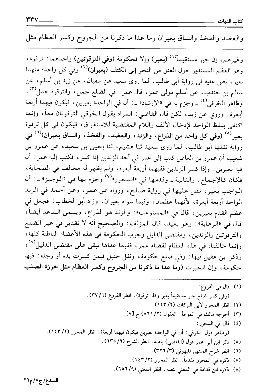 ـــــــــــــــــــــــــــــQوَغَيْرِهِمْ: إِنْ جُبِرَ مُسْتَقِيمًا (بَعِيرٌ) وَإِلَّا فَحُكُومَةٌ (وَفِي التَّرْقُوَتَيْنِ) وَاحِدُهُمَا تَرْقُوَةٌ، وَهُوَ الْعَظْمُ الْمُسْتَدِيرُ حَوْلَ الْعُنُقِ مِنَ النَّحْرِ إِلَى الْكَتِفِ (بَعِيرَانِ) وَفِي كُلِّ وَاحِدَةٍ مِنْهُمَا بَعِيرٌ، نَصَّ عَلَيْهِ فِي رِوَايَةِ أَبِي طَالِبٍ، لِمَا رَوَى سَعِيدٌ، عَنْ سُفْيَانَ، عَنْ زَيْدِ بْنِ أَسْلَمَ، عَنْ سَالِمِ بْنِ جُنْدَبٍ، عَنْ أَسْلَمَ مَوْلَى عُمَرَ، قَالَ عُمَرُ: فِي الضِّلْعِ جَمَلٌ وَالتَّرْقُوَةُ جَمَلٌ. وَظَاهِرُ الْخِرَقِيِّ، وَجَزَمَ بِهِ فِي الْإِرْشَادِ: أَنَّ فِي الْوَاحِدَةِ بَعِيرَيْنِ، فَيَكُونُ فِيهِمَا أَرْبَعَةُ أَبْعِرَةٍ، وَرُوِيَ عَنْ زَيْدٍ، لَكِنْ قَالَ الْقَاضِي: الْمُرَادُ بِقَوْلِ الْخِرَقِيِّ التَّرْقُوتَانِ مَعًا، وَإِنَّمَا اكْتَفَى بِلَفْظِ الْوَاحِدِ لِإِدْخَالِ الْأَلِفِ وَاللَّامِ الْمُقْتَضِيَةِ لِلِاسْتِغْرَاقِ، فَيَكُونُ فِي كُلِّ تَرْقُوَةٍ بَعِيرٌ (وَفِي كُلِّ وَاحِدٍ مِنَ: الذِّرَاعِ، وَالزَّنْدِ، وَالْعَضُدِ، وَالْفَخْذِ، وَالسَّاقِ بَعِيرَانِ) فِي رِوَايَةٍ نَقَلَهَا أَبُو طَالِبٍ، لِمَا رَوَى سَعِيدٌ، ثَنَا هُشَيْمٌ، أَنَا يَحْيَى بْنُ سَعِيدٍ، عَنْ عَمْرِو بْنِ شُعَيْبٍ: أَنَّ عَمْرَو بْنَ الْعَاصِ كَتَبَ إِلَى عُمَرَ فِي أَحَدِ الزَّنْدَيْنِ إِذَا كُسِرَ، فَكَتَبَ إِلَيْهِ عُمَرُ: أَنَّ فِيهِ بَعِيرَيْنِ، وَإِذَا كُسِرَ الزَّنْدَانِ فَفِيهِمَا أَرْبَعَةُ أَبْعِرَةٍ، وَلَمْ يَظْهَرْ لَهُ مُخَالِفٌ فِي الصَّحَابَةِ، فَكَانَ كَالْإِجْمَاعِ. وَالثَّانِيَةُ، وَقَدَّمَهَا فِي الْمُحَرَّرِ وَجَزَمَ بِهَا فِي الْوَجِيزِ، أَنَّ الْوَاجِبَ بَعِيرٌ، نَصَّ عَلَيْهَا فِي رِوَايَةِ صَالِحٍ، وَرَوَاهُ عَنْ عُمَرَ وَعَنْ أَحْمَدَ، فِي الزَّنْدِ الْوَاحِدِ أَرْبَعَةُ أَبْعِرَةٍ، لِأَنَّهُمَا عَظْمَانِ، وَفِيمَا سِوَاهُ بَعِيرَانِ، وَزَادَ أَبُو الْخَطَّابِ فَجَعَلَ فِي عَظْمِ الْقَدَمِ بَعِيرَيْنِ، قَالَ فِي الْمُسْتَوْعِبِ: وَالزَّنْدُ هُوَ الذِّرَاعُ، وَيُسَمَّى السَّاعِدَ أَيْضًا، قَالَ فِي الرِّعَايَةِ: وَهُوَ بَعِيدٌ، قَالَ الْمُؤَلِّفُ: وَالصَّحِيحُ أَنَّهُ لَا تَقْدِيرَ فِي غَيْرِ الضِّلْعِ وَالتَّرْقُوَتَيْنِ وَالزَّنْدَيْنِ، وَمُقْتَضَى الدَّلِيلِ وُجُوبُ الْحُكُومَةِ فِي هَذِهِ الْأَعْضَاءِ الْبَاطِنَةِ كُلِّهَا، وَإِنَّمَا خَالَفْنَاهُ فِي هَذِهِ الْعِظَامِ لِقَضَاءِ عُمَرَ، فَفِيمَا عَدَاهَا يَبْقَى عَلَى مُقْتَضَى الدَّلِيلِ، وَذَكَرَ ابْنُ عَقِيلٍ فِيهَا: وَفِي ضِلْعٍ حُكُومَةٌ، وَنَقَلَ حَنْبَلٌ فِيمَنْ كُسِرَتْ يَدُهُ أَوْ رِجْلُهُ: فِيهَا حُكُومَةٌ وَإِنِ انْجَبَرَتْ (وَمَا عَدَا مَا ذَكَرْنَا مِنَ الْجُرُوحِ وَكَسْرِ الْعِظَامِ مِثْلُ خَرَزَةِ الصُّلْبِ
