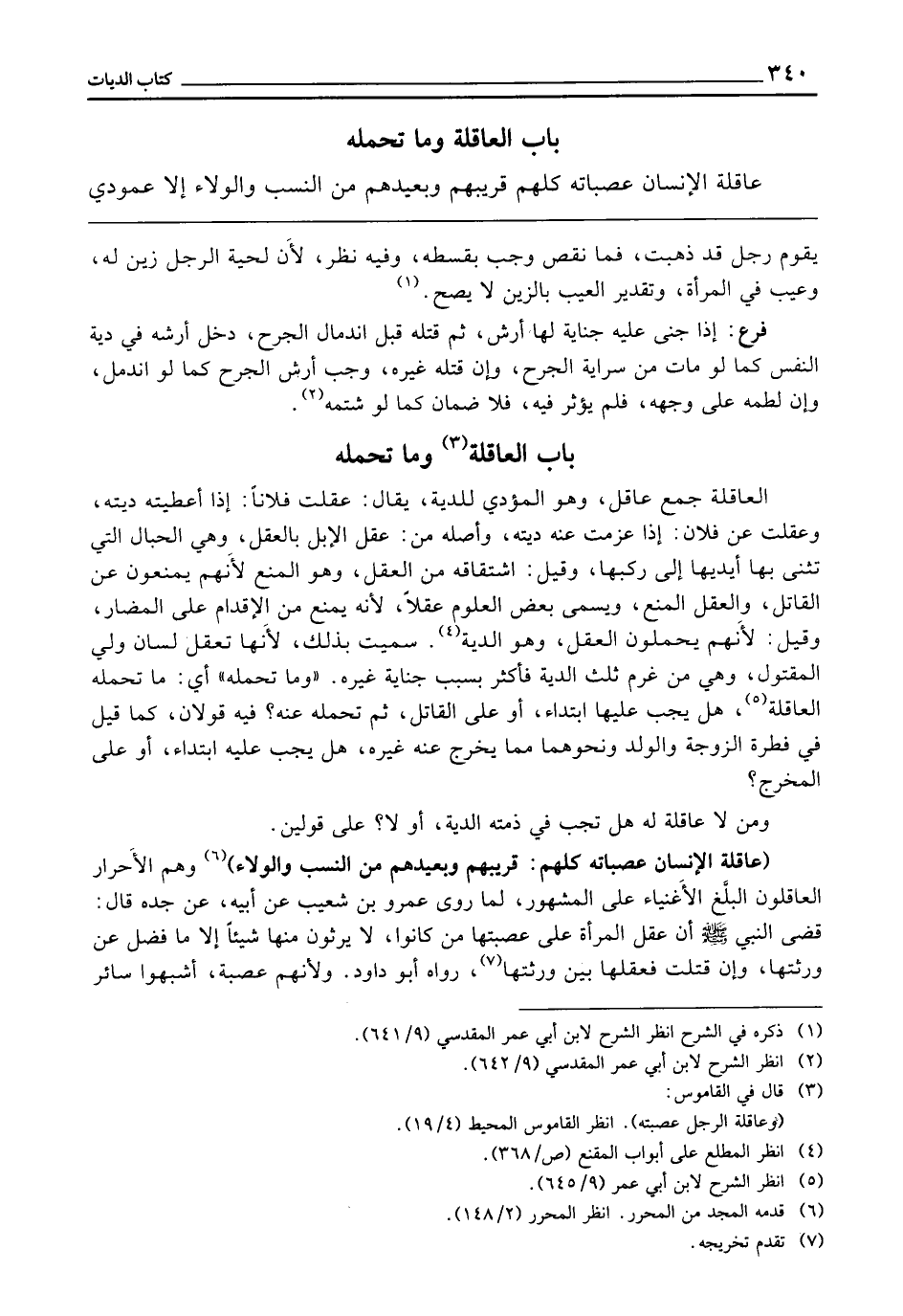 بَابُ الْعَاقِلَةِ وَمَا تَحْمِلُهُ الْعَاقِلَةُ جَمْعُ عَاقِلٍ، وَهُوَ الْمُؤَدِّي لِلدِّيَةِ، يُقَالُ: عَقَلْتُ فُلَانًا إِذَا أَعْطَيْتُهُ دِيَتَهُ، وَعَقَلْتُ عَنْ فُلَانٍ إِذَا عَزَمْتُ عَنْهُ دِيَتَهُ، وَأَصْلُهُ مِنْ عَقْلِ الْإِبِلِ بِالْعَقْلِ، وَهِيَ: الْحِبَالُ الَّتِي تُثْنَى بِهَا أَيْدِيهَا إِلَى رُكَبِهَا، وَقِيلَ: اشْتِقَاقُهُ مِنَ الْعَقْلِ، وَهُوَ الْمَنْعُ، لِأَنَّهُمْ يَمْنَعُونَ عَنِ الْقَاتِلِ، وَالْعَقْلُ الْمَنْعُ، وَيُسَمَّى بَعْضُ الْعُلُومِ عَقْلًا، لِأَنَّهُ يَمْنَعُ مِنَ الْإِقْدَامِ عَلَى الْمَضَارِّ، وَقِيلَ: لِأَنَّهُمْ يَحَمَّلُونَ الْعَقْلَ، وَهُوَ الدِّيَةُ، سُمِّيَتْ بِذَلِكَ، لِأَنَّهَا تَعْقِلُ لِسَانَ وَلِيِّ الْمَقْتُولِ، وَهِيَ: مَنْ غُرِّمَ ثُلُثَ الدِّيَةِ فَأَكْثَرَ بِسَبَبِ جِنَايَةِ غَيْرِهِ، وَمَا تَحْمِلُهُ، أَيْ: مَا تَحْمِلُهُ الْعَاقِلَةُ، هَلْ يَجِبُ عَلَيْهَا ابْتِدَاءً؟ أَوْ عَلَى الْقَاتِلِ ثُمَّ تَحْمِلُهَا عَنْهُ؟ فِيهِ قَوْلَانِ، كَمَا قِيلَ فِي فِطْرَةِ الزَّوْجَةِ وَالْوَلَدِ وَنَحْوِهِمَا مِمَّا يَخْرُجُ عَنْهُ غَيْرُهُ، هَلْ يَجِبُ عَلَيْهِ ابْتِدَاءً، أَوْ عَلَى الْمُخْرِجِ؟