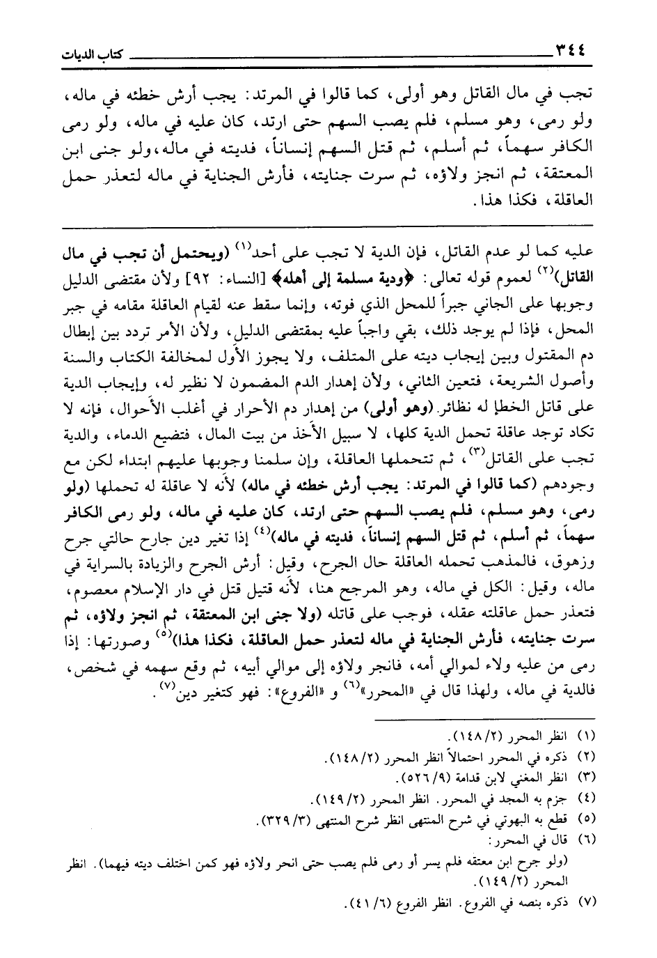 ـــــــــــــــــــــــــــــQعَلَيْهِ، كَمَا لَوْ عُدِمَ الْقَاتِلُ فَإِنَّ الدِّيَةَ لَا تَجِبُ عَلَى أَحَدٍ (وَيُحْتَمَلُ أَنْ تَجِبَ فِي مَالِ الْقَاتِلِ) لِعُمُومِ قَوْله تَعَالَى: {وَدِيَةٌ مُسَلَّمَةٌ إِلَى أَهْلِهِ} [النساء: 92] وَلِأَنَّ مُقْتَضَى الدَّلِيلِ وُجُوبُهَا عَلَى الْجَانِي جَبْرًا لِلْمَحَلِّ الَّذِي فَوَّتَهُ، وَإِنَّمَا سَقَطَ عَنْهُ لِقِيَامِ الْعَاقِلَةِ مَقَامَهُ فِي جَبْرِ الْمَحَلِّ، فَإِذَا لَمْ يُوجَدْ ذَلِكَ بَقِيَ وَاجِبًا عَلَيْهِ بِمُقْتَضَى الدَّلِيلِ، وَلِأَنَّ الْأَمْرَ تَرَدَّدَ بَيْنَ إِبْطَالِ دَمِ الْمَقْتُولِ وَبَيْنَ إِيجَابِ دِيَتِهِ عَلَى الْمُتْلِفِ، وَلَا يَجُوزُ الْأَوَّلُ لِمُخَالَفَةِ الْكِتَابِ وَالسُّنَّةِ وَأُصُولِ الشَّرِيعَةِ، فَتَعَيَّنَ الثَّانِي، وَلِأَنَّ إِهْدَارَ الدَّمِ الْمَضْمُونِ لَا نَظِيرَ لَهُ وَإِيجَابَ الدِّيَةِ عَلَى قَاتِلِ الْخَطَأِ لَهُ نَظَائِرُ (وَهُوَ أَوْلَى) مِنْ إِهْدَارِ دَمِ الْأَحْرَارِ فِي أَغْلَبِ الْأَحْوَالِ، فَإِنَّهُ لَا تَكَادُ تُوجَدُ عَاقِلَةٌ تَحْمِلُ الدِّيَةَ كُلَّهَا، ولَا سَبِيلَ إِلَى الْأَخْذِ مِنْ بَيْتِ الْمَالِ، فَتَضِيعُ الدِّمَاءُ، وَالدِّيَةُ تَجِبُ عَلَى الْقَاتِلِ ثُمَّ تَتَحَمَّلُهَا الْعَاقِلَةُ، وَإِنْ سَلَّمْنَا وُجُوبَهَا عَلَيْهِمُ ابْتِدَاءً لَكِنْ مَعَ وُجُودِهِمْ (كَمَا قَالُوا فِي الْمُرْتَدِّ يَجِبُ أَرْشُ خَطَئِهِ فِي مَالِهِ) لِأَنَّهُ لَا عَاقِلَةَ لَهُ تَحْمِلُهَا (وَلَوْ رَمَى وَهُوَ مُسْلِمٌ فَلَمْ يُصِبِ السَّهْمُ حَتَّى ارْتَدَّ كَانَ عَلَيْهِ فِي مَالِهِ، وَلَوْ رَمَى الْكَافِرُ سَهْمًا ثُمَّ أَسْلَمَ ثُمَّ قَتَلَ السَّهْمُ إِنْسَانًا، فَدِيَتُهُ فِي مَالِهِ) إِذَا تَغَيَّرَ دِينُ جَارِحٍ حَالَتَيْ جُرْحٍ وَزُهُوقٍ، فَالْمَذْهَبُ تَحْمِلُهُ الْعَاقِلَةُ حَالَ الْجُرْحِ، وَقِيلَ: أَرْشُ الْجُرْحِ وَالزِّيَادَةِ بِالسِّرَايَةِ فِي مَالِهِ، وَقِيلَ: الْكُلُّ فِي مَالِهِ، وَهُوَ الْمُرَجَّحُ هُنَا، لِأَنَّهُ قَتِيلٌ قُتِلَ فِي دَارِ الْإِسْلَامِ مَعْصُومٌ، فَتَعَذَّرَ حَمْلُ عَاقِلَتِهِ عَقْلَهُ فَوَجَبَ عَلَى قَاتِلِهِ (وَلَوْ جَنَى ابْنُ الْمُعْتَقَةِ ثُمَّ انْجَر وَلَاؤُهُ ثُمَّ سَرَتْ جِنَايَتُهُ، فَأَرْشُ الْجِنَايَةِ فِي مَالِهِ، لِتَعَذُّرِ حَمْلِ الْعَاقِلَةِ، فَكَذَا هَذَا) وَصُورَتُهَا: إِذَا رَمَى مَنْ عَلَيْهِ وَلَاءٌ لِمَوَالِي أُمِّهِ فَانْجَرَّ وَلَاؤُهُ إِلَى مَوَالِي أَبِيهِ، ثم وَقَعَ سَهْمُهُ فِي شَخْصٍ فَالدِّيَةُ فِي مَالِهِ، وَلِهَذَا قَالَ فِي الْمُحَرَّرِ وَالْفُرُوعِ: فَهُوَ كَتَغَيُّرِ دِينٍ.