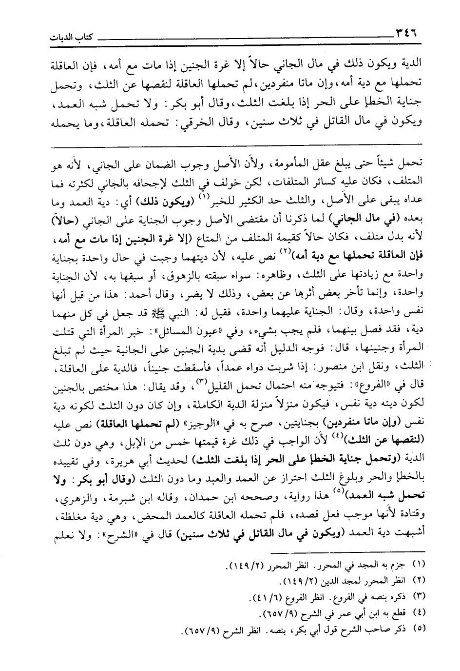 ـــــــــــــــــــــــــــــQتَحْمِلُ شَيْئًا حَتَّى يَبْلُغَ عَقْلَ الْمَأْمُومَةِ، وَلِأَنَّ الْأَصْلَ وُجُوبُ الضَّمَانِ عَلَى الْجَانِي، لِأَنَّهُ هُوَ الْمُتْلِفُ، فَكَانَ عَلَيْهِ كَسَائِرِ الْمَتْلَفَاتِ، لَكِنْ خُولِفَ فِي الثُّلْثِ لِإِجْحَافِهِ بِالْجَانِي لِكَثْرَتِهِ، فَمَا عَدَاهُ يَبْقَى عَلَى الْأَصْلِ، وَالثُّلْثُ حَدُّ الْكَثِيرِ لِلْخَبَرِ (وَيَكُونُ ذَلِكَ) أَيْ: دِيَةُ الْعَمْدِ وَمَا بَعْدَهُ (فِي مَالِ الْجَانِي) لِمَا ذَكَرْنَا أَنَّ مُقْتَضَى الْأَصْلِ وُجُوبُ الْجِنَايَةِ عَلَى الْجَانِي (حَالًّا) لِأَنَّهُ بَدَلُ مُتْلَفٍ، فَكَانَ حَالًّا كَقِيمَةِ الْمُتْلَفِ مِنَ الْمَتَاعِ (إِلَّا غِرَّةَ الْجَنِينِ إِذَا مَاتَ مَعَ أُمِّهِ، فَإِنَّ الْعَاقِلَةَ تَحْمِلُهَا مَعَ دِيَةِ أُمِّهِ) نَصَّ عَلَيْهِ، لِأَنَّ دِيَتَهُمَا وَجَبَتْ فِي حَالٍ وَاحِدَةٍ بِجِنَايَةٍ وَاحِدَةٍ، مَعَ زِيَادَتِهَا عَلَى الثُّلْثِ، وَظَاهِرُهُ سَوَاءٌ سَبَقَتْهُ بِالزُّهُوقِ أَوْ سَبَقَهَا بِهِ، لِأَنَّ الْجِنَايَةَ وَاحِدَةٌ، وَإِنَّمَا تَأَخَّرَ بَعْضُ أَثَرِهَا عَنْ بَعْضٍ، وَذَلِكَ لَا يَضُرُّ، وَقَالَ أَحْمَدُ: هَذَا مِنْ قِبَلِ أَنَّهَا نَفْسٌ وَاحِدَةٌ، وَقَالَ: الْجِنَايَةُ عَلَيْهِمَا وَاحِدَةٌ، فَقِيلَ لَهُ: النَّبِيُّ - صَلَّى اللَّهُ عَلَيْهِ وَسَلَّمَ - قَدْ جَعَلَ فِي كُلٍّ مِنْهُمَا دِيَةً، فَقَدْ فَصَلَ بَيْنَهُمَا، فَلَمْ يُجِبْ بِشَيْءٍ، وَفِي عُيُونِ الْمَسَائِلِ خَبَرُ الْمَرْأَةِ الَّتِي قَتَلَتِ الْمَرْأَةَ وَجَنِينَهَا، قَالَ: فَوَجْهُ الدَّلِيلِ أَنَّهُ قَضَى بِدِيَةِ الْجَنِينِ عَلَى الْجَانِيَةِ حَيْثُ لَمْ تَبْلُغُ الثُّلْثَ، وَنَقَلَ ابْنُ مَنْصُورٍ: إِذَا شَرِبَتْ دَوَاءً عَمْدًا فَأَسْقَطَتْ جَنِينًا فَالدِّيَةُ عَلَى الْعَاقِلَةِ، قَالَ فِي الْفُرُوعِ: فَيَتَوَجَّهُ مِنْهُ احْتِمَالُ تَحَمُّلِ الْقَلِيلِ، وَقَدْ يُقَالُ: هَذَا مُخْتَصٌّ بِالْجَنِينِ، لِكَوْنِ دِيَتِهِ دِيَةَ نَفْسٍ، فَيَكُونُ مُنَزَّلًا مَنْزِلَةَ الدِّيَةِ الْكَامِلَةِ، وَإِنْ كَانَ دُونَ الثُّلْثِ لِكَوْنِهِ دِيَةَ نَفْسٍ (وَإِنْ مَاتَا مُنْفَرِدَيْنِ) بِجِنَايَتَيْنِ صَرَّحَ بِهِ فِي الْوَجِيزِ (لَمْ تَحْمِلْهَا الْعَاقِلَةُ) نَصَّ عَلَيْهِ (لِنَقْصِهَا عَنِ الثُّلْثِ) لِأَنَّ الْوَاجِبَ فِي ذَلِكَ غِرَّةٌ قِيمَتُهَا خَمْسٌ مِنَ الْإِبِلِ، وَهِيَ دُونَ ثُلُثِ الدِّيَةِ (وَتَحْمِلُ جِنَايَةَ الْخَطَأِ عَلَى الْحُرِّ إِذَا بَلَغَتِ الثُّلْثَ) لِحَدِيثِ أَبِي هُرَيْرَةَ، وَفِي تَقْيِيدِهِ بِالْخَطَأِ وَالْحُرِّ وَبُلُوغِ الثُّلْثِ احْتِرَازٌ عَنِ: الْعَمْدِ، وَالْعَبْدِ، وَمَا دُونَ الثُّلْثِ.