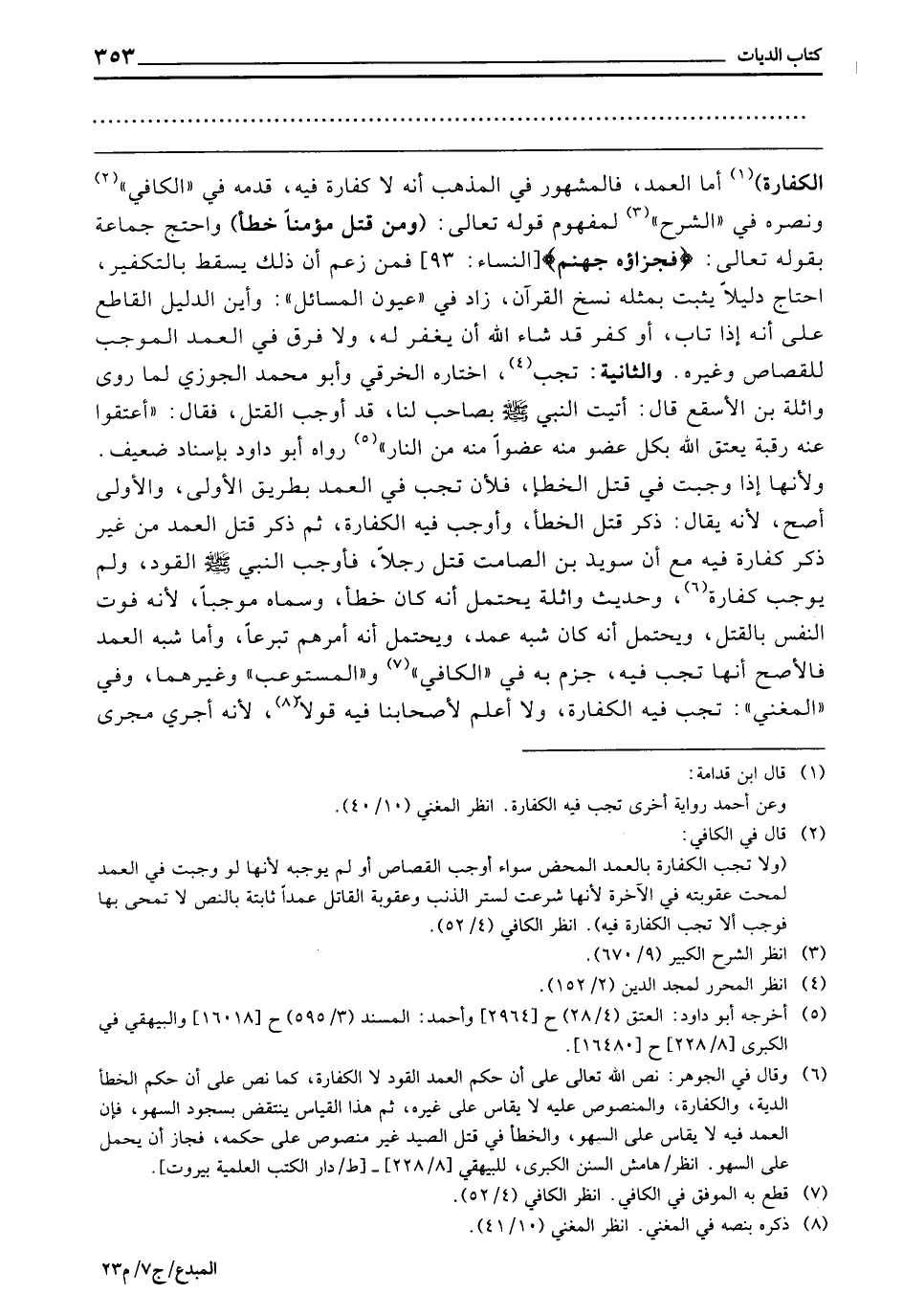 ـــــــــــــــــــــــــــــQالْكَفَّارَةُ) أَمَّا الْعَمْدُ فَالْمَشْهُورُ فِي الْمَذْهَبِ أَنَّهُ لَا كَفَّارَةَ فِيهِ، قَدَّمَهُ فِي الْكَافِي وَنَصَرَهُ فِي الشَّرْحِ، لِمَفْهُومِ قَوْله تَعَالَى: {وَمَنْ قَتَلَ مُؤْمِنًا خَطَأً} [النساء: 92] وَاحْتَجَّ جَمَاعَةٌ بِقَوْلِهِ تَعَالَى: {فَجَزَاؤُهُ جَهَنَّمُ} [النساء: 93] فَمَنْ زَعَمَ أَنَّ ذَلِكَ يَسْقُطُ بِالتَّكْفِيرِ احْتَاجَ دَلِيلًا يَثْبُتُ بِمِثْلِهِ نَسْخُ الْقُرْآنِ، زَادَ فِي عُيُونِ الْمَسَائِلِ: وَأَيْنَ الدَّلِيلُ الْقَاطِعُ عَلَى أَنَّهُ إِذَا تَابَ أَوْ كَفَّرَ قَدْ شَاءَ اللَّهُ أَنْ يَغْفِرَ لَهُ، وَلَا فَرْقَ فِي الْعَمْدِ الْمُوجِبِ لِلْقِصَاصِ وَغَيْرِهِ. وَالثَّانِيَةُ: تَجِبُ، اخْتَارَهُ الْخِرَقِيُّ وَأَبُو مُحَمَّدٍ الْجَوْزِيُّ، لِمَا رَوَى وَاثِلَةُ بْنُ الْأَسْقَعِ، قَالَ: «أَتَيْتُ النَّبِيَّ - صَلَّى اللَّهُ عَلَيْهِ وَسَلَّمَ - بِصَاحِبٍ لَنَا قَدْ أَوْجَبَ الْقَتْلَ، فَقَالَ: أَعْتِقُوا عَنْهُ رَقَبَةً، يُعْتِقُ اللَّهُ بِكُلِّ عُضْوٍ مِنْهُ عُضْوًا مِنْهُ مِنَ النَّارِ» . رَوَاهُ أَبُو دَاوُدَ بِإِسْنَادٍ ضَعِيفٍ. وَلِأَنَّهَا إِذَا وَجَبَتْ فِي قَتْلِ الْخَطَأِ فَلَأَنْ تَجِبَ فِي الْعَمْدِ بِطَرِيقِ الْأَوْلَى، وَالْأُولَى أَصَحُّ، لِأَنَّهُ يُقَالُ: ذَكَرَ قَتْلَ الْخَطَأِ وَأَوْجَبَ فِيهِ الْكَفَّارَةَ، ثُمَّ ذَكَرَ قَتْلَ الْعَمْدِ مِنْ غَيْرِ ذِكْرِ كَفَّارَةٍ فِيهِ، مَعَ أَنَّ سُوَيْدَ بْنَ الصَّامِتِ قَتَلَ رَجُلًا فَأَوْجَبَ النَّبِيُّ - صَلَّى اللَّهُ عَلَيْهِ وَسَلَّمَ - الْقَوَدَ وَلَمْ يُوجِبْ كَفَّارَةً، وَحَدِيثُ وَاثِلَةَ يُحْتَمَلُ أَنَّهُ كَانَ خَطَأً، وَسَمَّاهُ مُوجِبًا لِأَنَّهُ فَوَّتَ النَّفْسَ بِالْقَتْلِ، وَيُحْتَمَلُ أَنَّهُ كَانَ شِبْهَ عَمْدٍ، وَيُحْتَمَلُ أَنَّهُ أَمَرَهُمْ تَبَرُّعًا، وَأَمَّا شِبْهُ الْعَمْدِ فَالْأَصَحُّ أَنَّهَا تَجِبُ بِهِ، جَزَمَ بِهِ فِي الْكَافِي وَالْمُسْتَوْعِبِ وَغَيْرِهِمَا، وَفِي الْمُغْنِي: تَجِبُ فِيهِ الْكَفَّارَةُ، وَلَا أَعْلَمُ لِأَصْحَابِنَا فِيهِ قَوْلًا، لِأَنَّهُ أُجْرِيَ مُجْرَى
