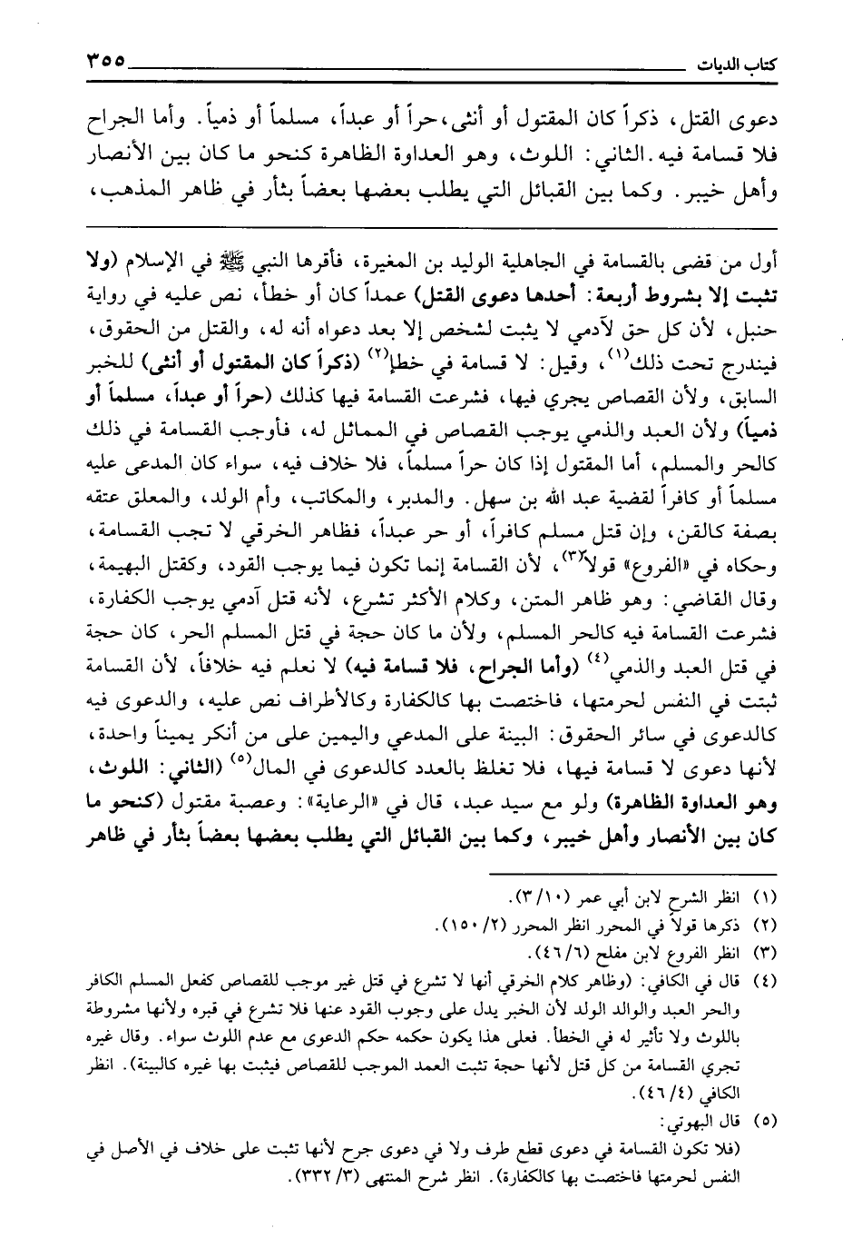 (وَلَا تَثْبُتُ إِلَّا بِشُرُوطٍ أَرْبَعَةٍ، أَحَدُهَا: دَعْوَى الْقَتْلِ) عَمْدًا كَانَ أَوْ خَطَأً، نَصَّ عَلَيْهِ فِي رِوَايَةِ حَنْبَلٍ، لِأَنَّ كُلَّ حَقٍّ لِآدَمِيٍّ لَا يَثْبُتُ لِشَخْصٍ إِلَّا بَعْدَ دَعْوَاهُ أَنَّهُ لَهُ، وَالْقَتْلُ مِنَ الْحُقُوقِ فَيَنْدَرِجُ تَحْتَ ذَلِكَ، وَقِيلَ: لَا قَسَامَةَ فِي خَطَأٍ (ذَكَرًا كَانَ الْمَقْتُولُ أَوْ أُنْثَى) لِلْخَبَرِ السَّابِقِ، وَلِأَنَّ الْقِصَاصَ يَجْرِي فِيهَا، فَشُرِعَتِ الْقَسَامَةُ فِيهَا كَذَلِكَ (حُرًّا أَوْ عَبْدًا، مُسْلِمًا أَوْ ذِمِّيًّا) وَلِأَنَّ الْعَبْدَ وَالذِّمِّيَّ يُوجِبُ الْقِصَاصَ فِي الْمُمَاثِلِ لَهُ، فَأَوْجَبَ الْقَسَامَةَ فِي ذَلِكَ كَالْحُرِّ وَالْمُسْلِمِ، أَمَّا الْمَقْتُولُ إِذَا كَانَ حُرًّا مُسْلِمًا فَلَا خِلَافَ فِيهِ، سَوَاءٌ كَانَ الْمُدَّعَى عَلَيْهِ مُسْلِمًا أَوْ كَافِرًا، لِقَضِيَّةِ عَبْدِ اللَّهِ بْنِ سَهْلٍ. وَالْمُدَبَّرُ، وَالْمَكَاتَبُ، وَأُمُّ الْوَلَدِ، وَالْمُعَلَّقُ عِتْقُهُ بِصِفَةٍ كَالْقِنِّ، وَإِنْ قَتَلَ مُسْلِمٌ كَافِرًا، أَوْ حُرٌّ عَبْدًا فَظَاهِرُ الْخِرَقِيِّ لَا تَجِبُ الْقَسَامَةُ، وَحَكَاهُ فِي الْفُرُوعِ قَوْلًا، لِأَنَّ الْقَسَامَةَ إِنَّمَا تَكُونُ فِيمَا يُوجِبُ الْقَوَدَ، وَكَقَتْلِ الْبَهِيمَةِ، وَقَالَ الْقَاضِي: وَهُوَ ظَاهِرُ الْمَتْنِ وَكَلَامِ الْأَكْثَرِ تُشْرَعُ، لِأَنَّهُ قَتْلُ آدَمِيٍّ يُوجِبُ الْكَفَّارَةَ فَشُرِعَتِ الْقَسَامَةُ فِيهِ كَالْحُرِّ الْمُسْلِمِ، وَلِأَنَّ مَا كَانَ حُجَّةً فِي قَتْلِ الْمُسْلِمِ الْحُرِّ كَانَ حُجَّةً فِي قَتْلِ الْعَبْدِ وَالذِّمِّيِّ (وَأَمَّا الْجِرَاحُ فَلَا قَسَامَةَ فِيهِ) لَا نَعْلَمُ فِيهِ خِلَافًا، لِأَنَّ الْقَسَامَةَ ثَبَتَتْ فِي النَّفْسِ لِحُرْمَتِهَا، فَاخْتَصَّتْ بِهَا كَالْكَفَّارَةِ وَكَالْأَطْرَافِ نَصَّ عَلَيْهِ، وَالدَّعْوَى فِيهِ كَالدَّعْوَى فِي سَائِرِ الْحُقُوقِ: الْبَيِّنَةُ عَلَى الْمُدَّعِي، وَالْيَمِينُ عَلَى مَنْ أَنْكَرَ يَمِينًا وَاحِدَةً، لِأَنَّهَا دَعْوَى لَا قَسَامَةَ فِيهَا فَلَا تُغَلَّظُ بِالْعَدَدِ، كَالدَّعْوَى فِي الْمَالِ.