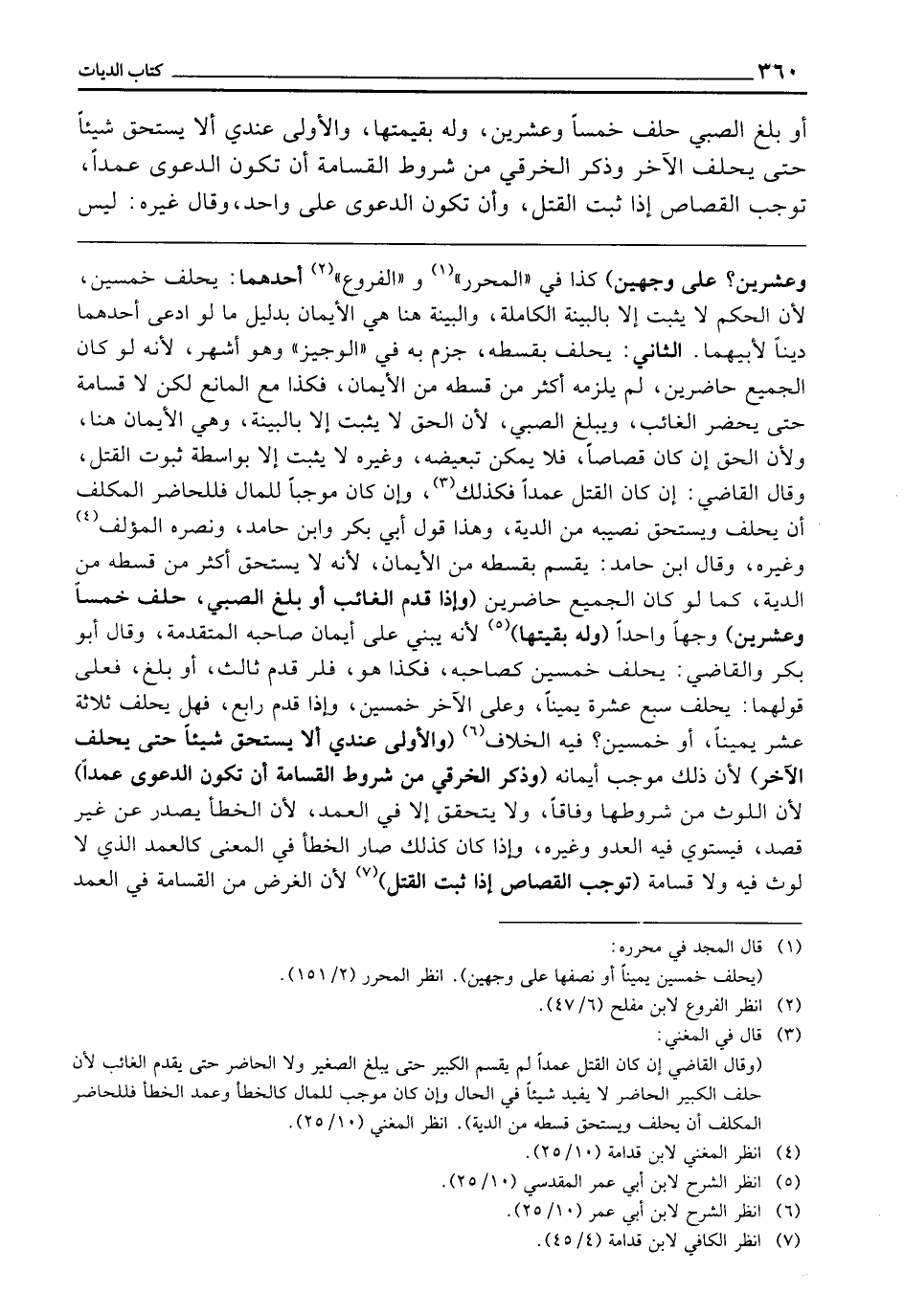 أَوْ بَلَغَ الصَّبِيُّ، حَلَفَ خَمْسًا وَعِشْرِينَ، وَلَهُ بَقِيمتُهَا، وَالْأَوْلَى عِنْدِي أَلَّا يَسْتَحِقَّ شَيْئًا حَتَّى يَحْلِفَ الْآخَرُ وَذَكَرَ الْخِرَقِيُّ مِنْ شُرُوطِ الْقَسَامَةِ: أَنْ تَكُونَ الدَّعْوَى عَمْدًا تُوجِبُ الْقِصَاصَ إِذَا ثَبَتَ الْقَتْلُ، وَأَنْ تَكُونَ الدَّعْوَى عَلَى وَاحِدٍ، وَقَالَ غَيْرُهُ: لَيْسَ