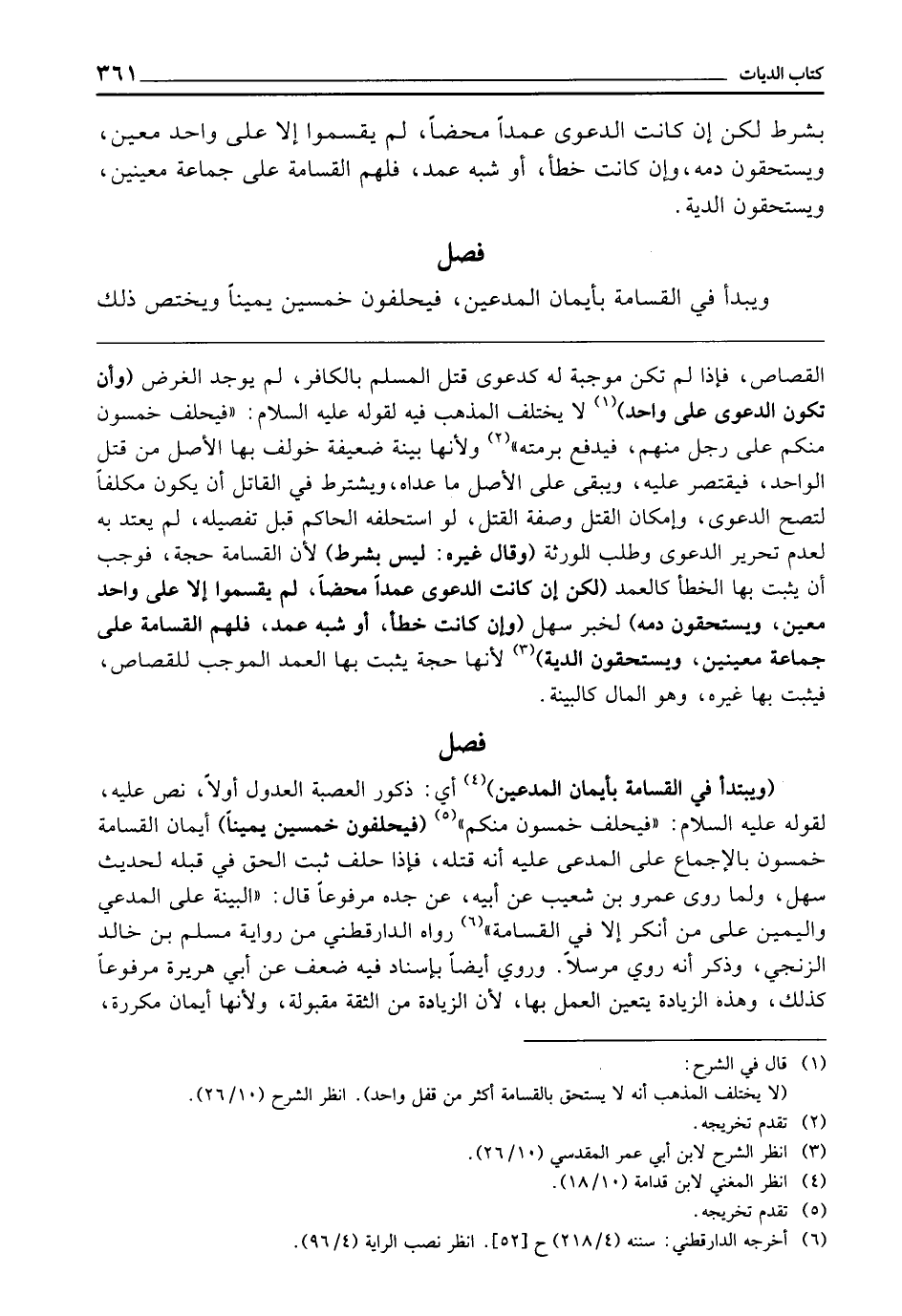 فَصْلٌ (وَيُبْدَأُ فِي الْقَسَامَةِ بِأَيْمَانِ الْمُدَّعِينَ) أَيْ: ذُكُورِ الْعَصَبَةِ الْعُدُولِ أَوَّلًا، نَصَّ عَلَيْهِ لِقَوْلِهِ - عَلَيْهِ السَّلَامُ -: «فَيَحْلِفُ خَمْسُونَ مِنْكُمْ» (فَيَحْلِفُونَ خَمْسِينَ يَمِينًا) أَيْمَانُ الْقَسَامَةِ خَمْسُونَ بِالْإِجْمَاعِ عَلَى الْمُدَّعَى عَلَيْهِ أَنَّهُ قَتَلَهُ، فَإِذَا حَلَفَ ثَبَتَ الْحَقُّ فِي قِبَلِهِ لِحَدِيثِ سَهْلٍ، وَلِمَا رَوَى عَمْرُو بْنُ شُعَيْبٍ، عَنْ أَبِيهِ، عَنْ جَدِّهِ مَرْفُوعًا، قَالَ: «الْبَيِّنَةُ عَلَى الْمُدَّعِي، وَالْيَمِينُ عَلَى مَنْ أَنْكَرَ إِلَّا فِي الْقَسَامَةِ» . رَوَاهُ الدَّارَقُطْنِيُّ. مِنْ رِوَايَةِ مُسْلِمِ بْنِ خَالِدٍ الزِّنْجِيِّ، وَذُكِرَ أَنَّهُ رُوِيَ مُرْسَلًا، وَرُوِيَ أَيْضًا بِإِسْنَادٍ فِيهِ ضَعْفٌ عَنْ أَبِي هُرَيْرَةَ مَرْفُوعًا كَذَلِكَ، وَهَذِهِ الزِّيَادَةُ يَتَعَيَّنُ الْعَمَلُ بِهَا، لِأَنَّ الزِّيَادَةَ مِنَ الثِّقَةِ مَقْبُولَةٌ، وَلِأَنَّهَا أَيْمَانٌ مُكَرَّرَةٌ،